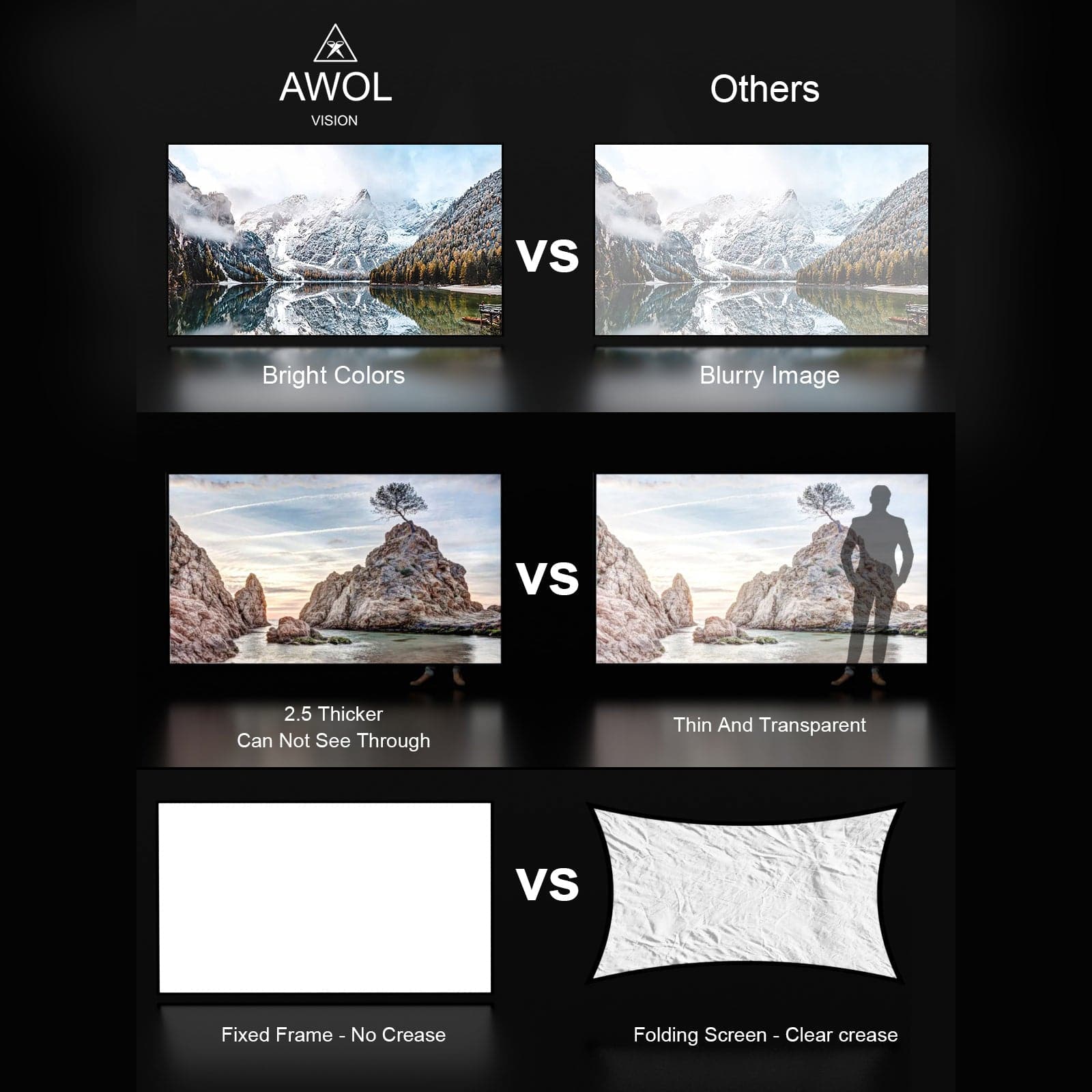 Easy to Clean: Awol Vision projector screen is designed to be hassle-free in terms of maintenance. Unlike traditional screens, it can be easily cleaned with mild soap and water, this convenience ensures that your screen remains in perfect shape for long-lasting enjoyment.