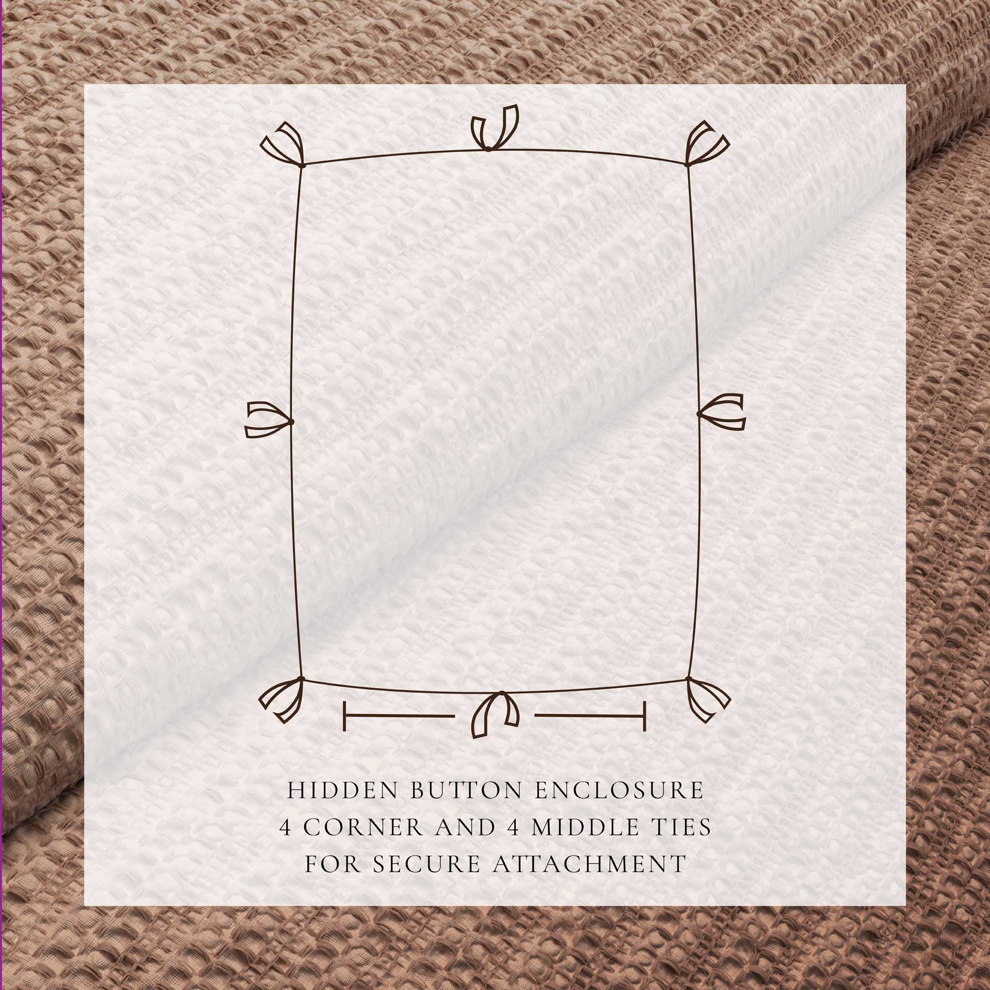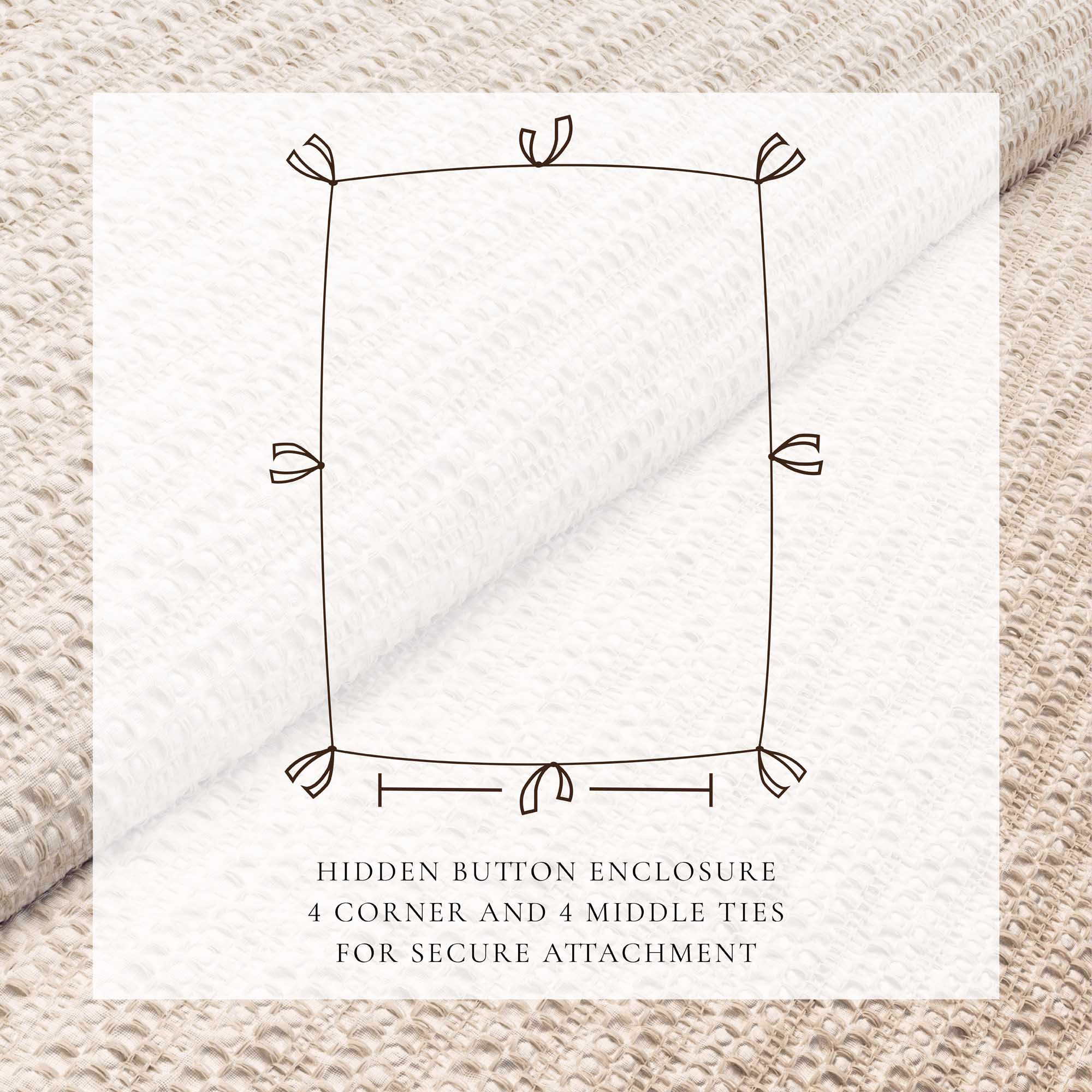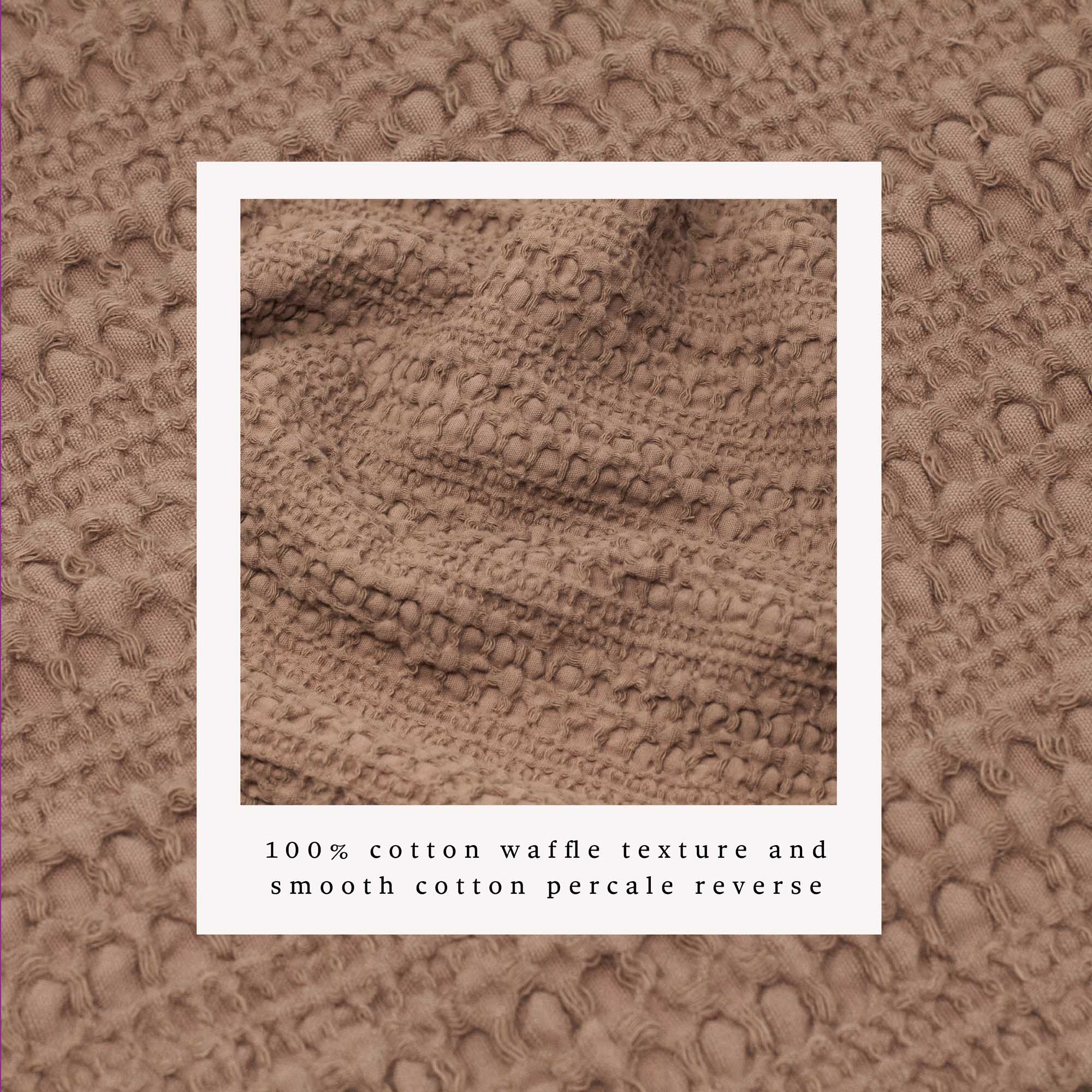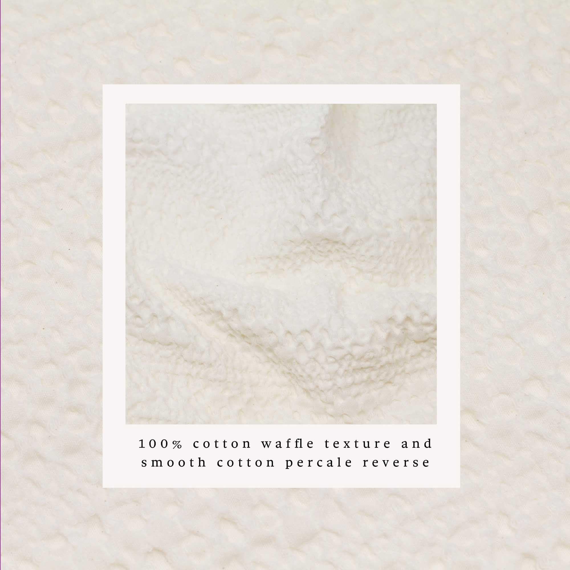 Update your bedroom decor with our textured waffle weave duvet set, crafted with natural cotton, for a refined and stylish look. The set includes a duvet cover with four corner ties, four middle ties, and a hidden button closure to keep everything securely in place throughout the night. This duvet cover is designed to accommodate the natural shrinkage of waffle weave fabric after the first wash, allowing for a perfect fit every time. The smooth cotton percale reverse ensures breathability and comfort. Made sustainably, free from harmful chemicals, and under socially responsible conditions, this duvet set is a decorative choice you can feel good about.