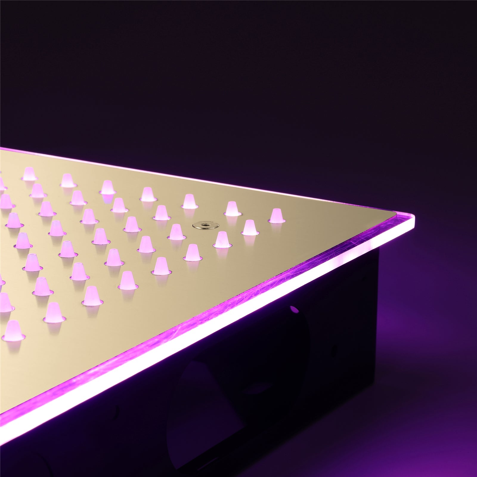 Top Shower Head: The flush-mounted ceiling shower head measures 16" x 16" and offers four functions: rainfall, waterfall, mist, and hydro-massage. It also features 64 LED lights and Bluetooth music, which can be turned on or off while showering. The LED lights can be controlled by a remote panel, while music can be managed using your cell phone.