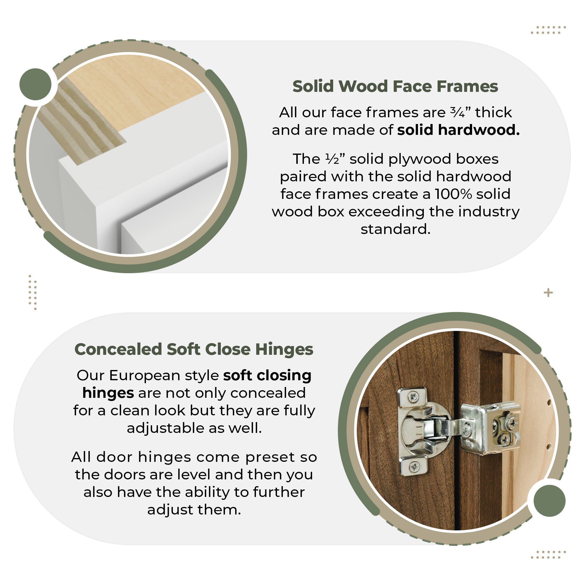 The frame of the door is similar in appearance to a picture frame. It is made of vertical stiles and horizontal rails. The solid wood doors are attached to the door frame with soft close adjustable European hinges. All our doors are larger than the cabinet door opening and sit on top of the frame for a full overlay design.