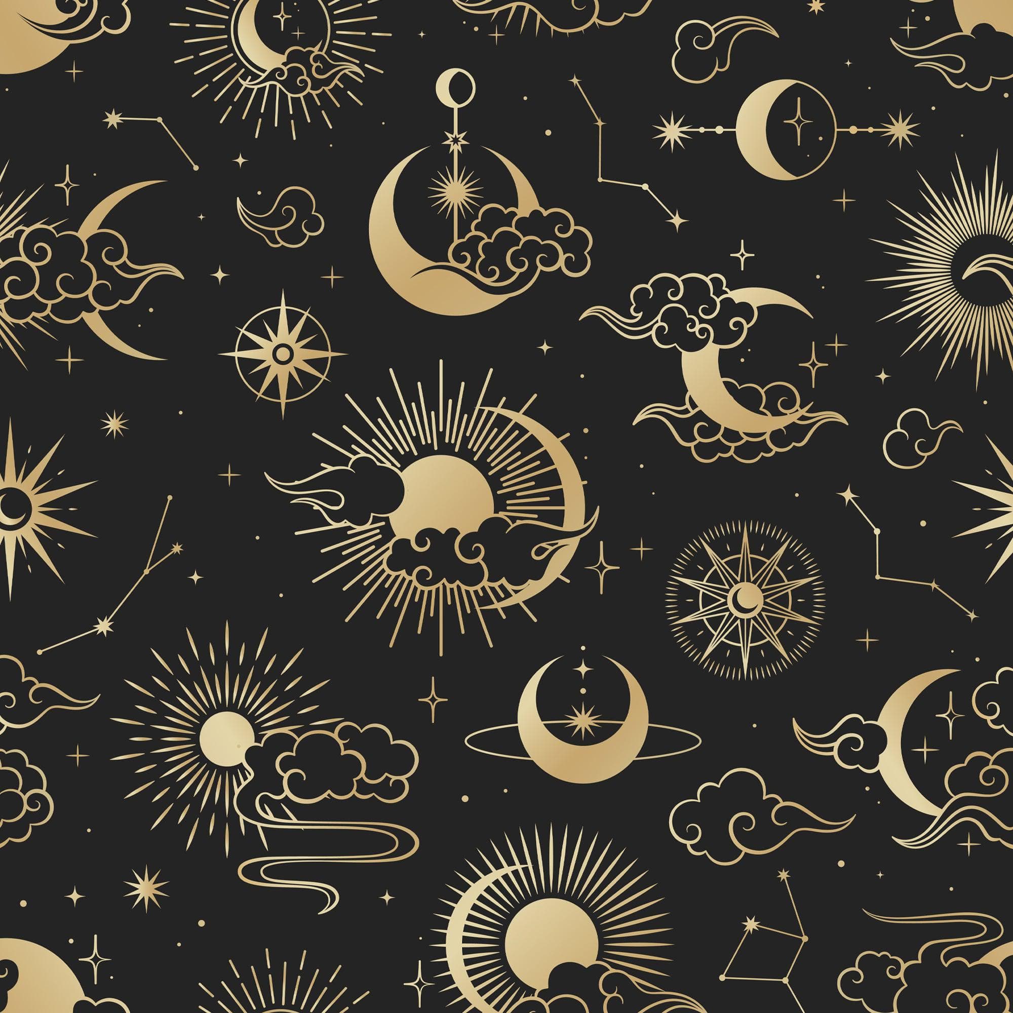 • Constellation Zodiac Horoscope Pattern Design. Golden Stars, Sun, Moon and Clouds over Night time Black background.