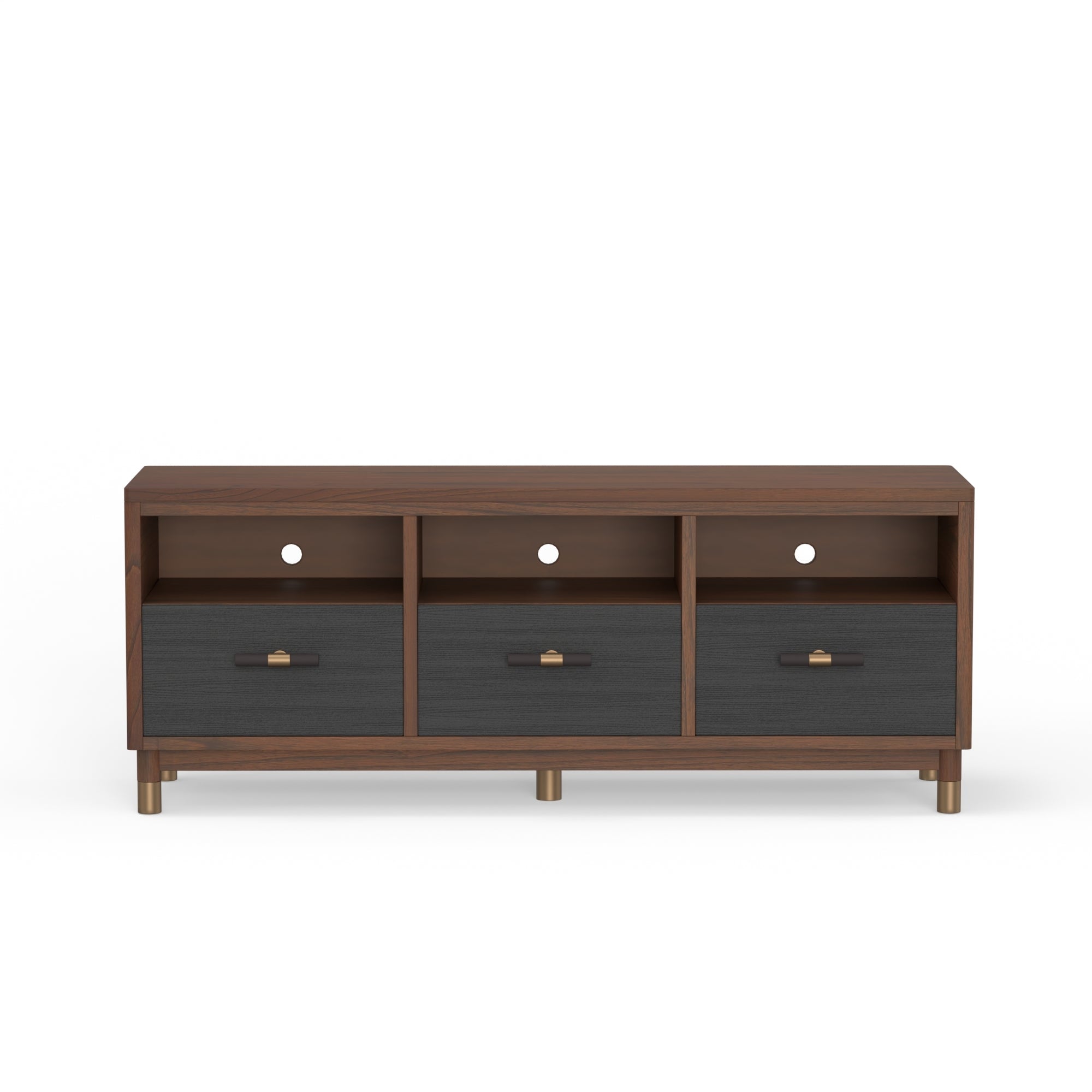 The Belham TV console with its beautiful two tone finish in Dark Walnut (Brown) and Black will surely compliment your homes aesthetic. The unit features 3 easy to access drawers constructed with English Dovetail drawer construction and metal ball bearing drawer glides. 3 open shelves provide for additional storage for electronics or for the essentials you love the most.