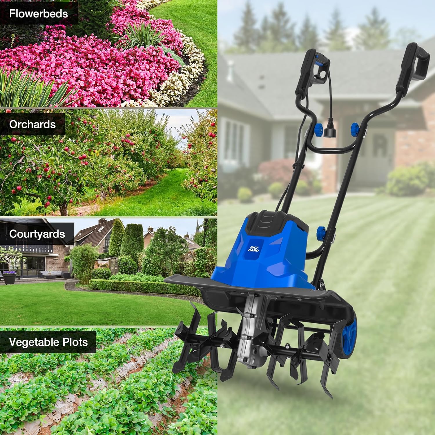 Powerful Performance for Effortless Gardening: Tackle tough soil with ease. The BILT HARD Electric Garden Tiller is powered by a high-performance 14-amp AC motor that delivers speeds up to 19,000 RPM, cultivating soil up to 18 inches wide and 8 inches deep—perfect for prepping flower beds, gardens, and lawns.