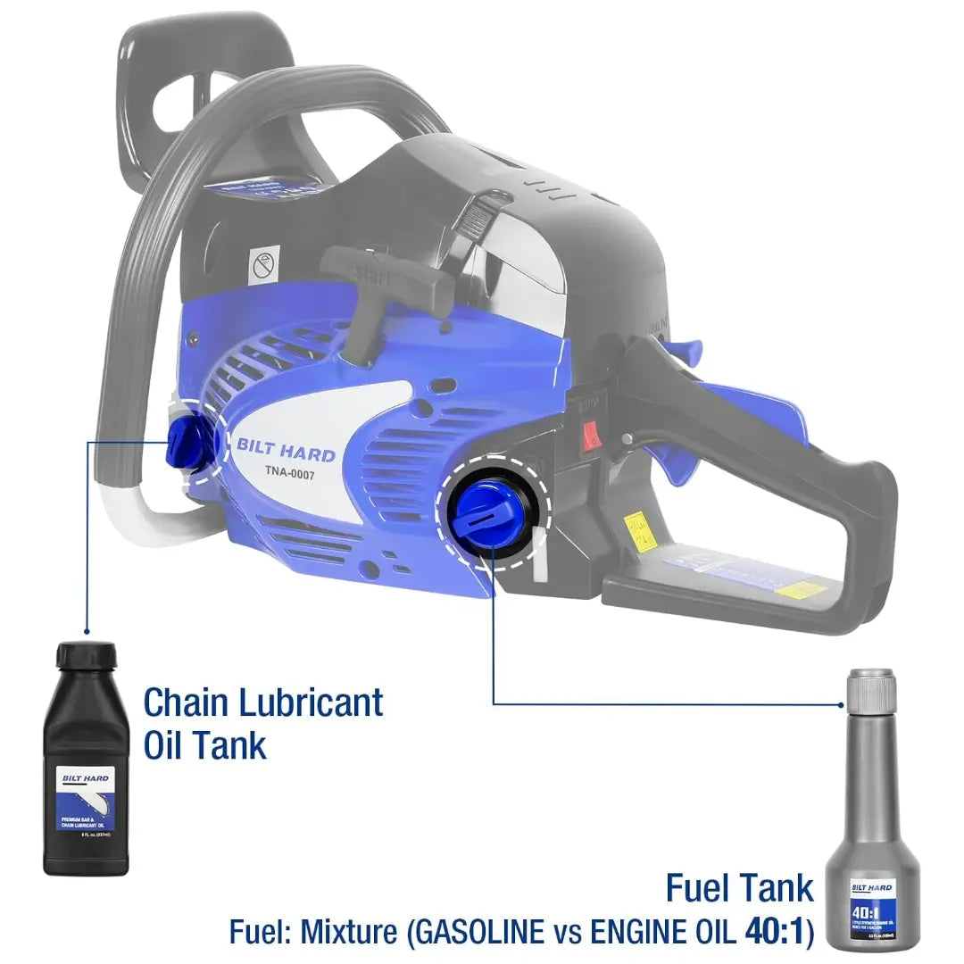 Superior Performance: This gas chainsaw is powered by a robust 46cc, 2-cycle gasoline engine that delivers 2.4 HP and a max torque of 1.9 Nm, reaching speeds up to 8500 rpm. Ideal for tackling intricate and demanding cutting tasks, it uses a 40:1 fuel-to-oil mix ratio.