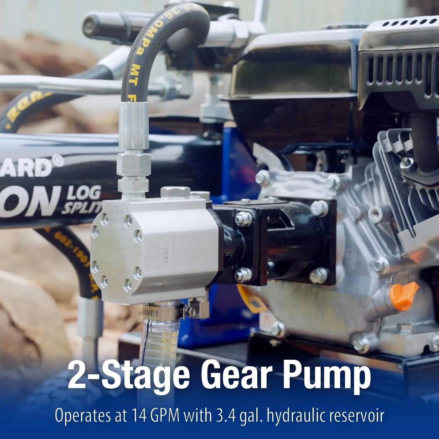 The log splitter features a robust hydraulic oil system that operates at 14 GPM, keeping contaminants at bay and extending the system's life. Both hydraulic and engine oils are included, so it’s ready to go out of the box.