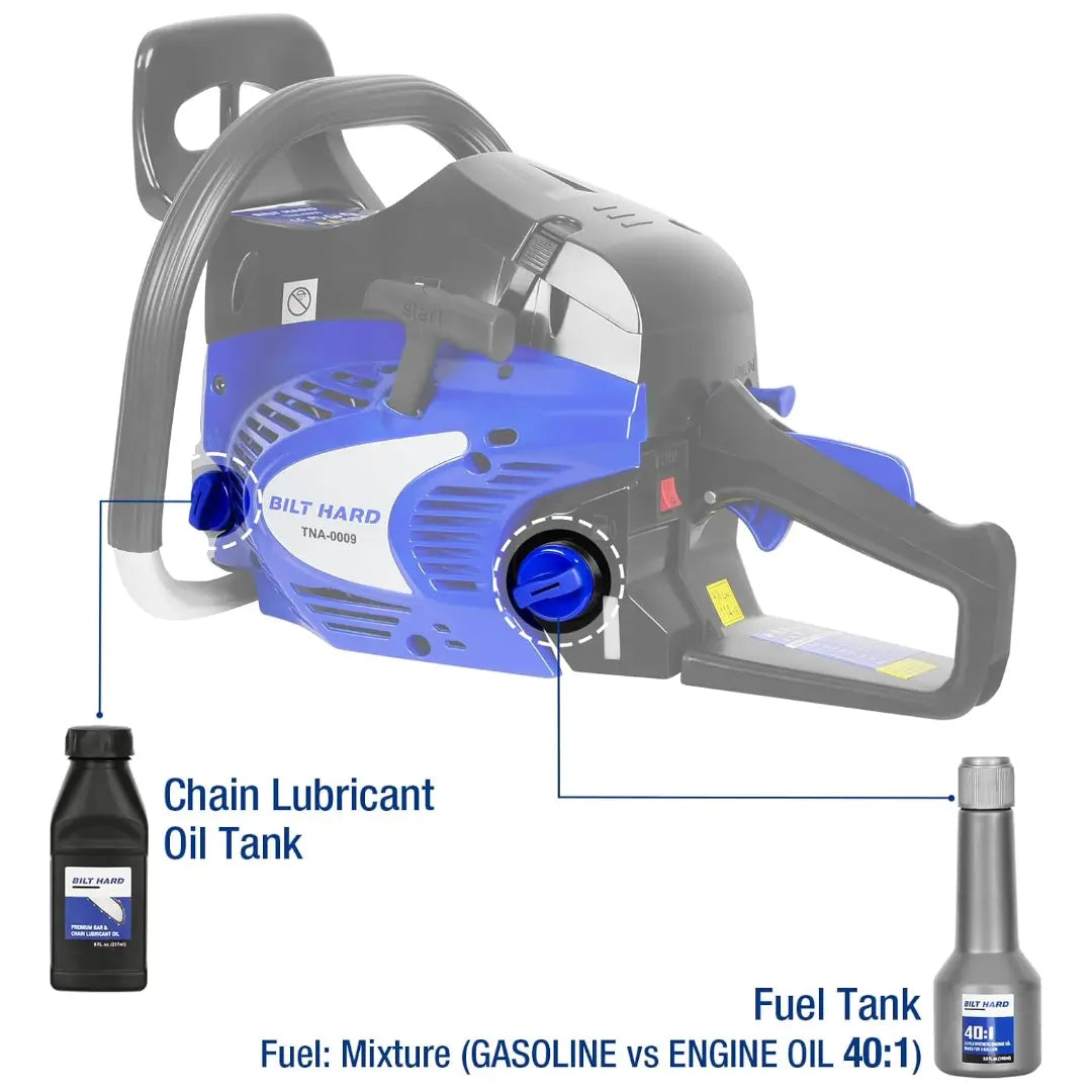 Superior Performance: Equipped with a powerful 56cc, 2-cycle gasoline engine, this gas chainsaw delivers 3.1 HP and 2.5 Nm of max torque, reaching speeds up to 8500 rpm. Ideal for intricate and demanding cutting tasks, it uses a 40:1 fuel-to-oil mix ratio.