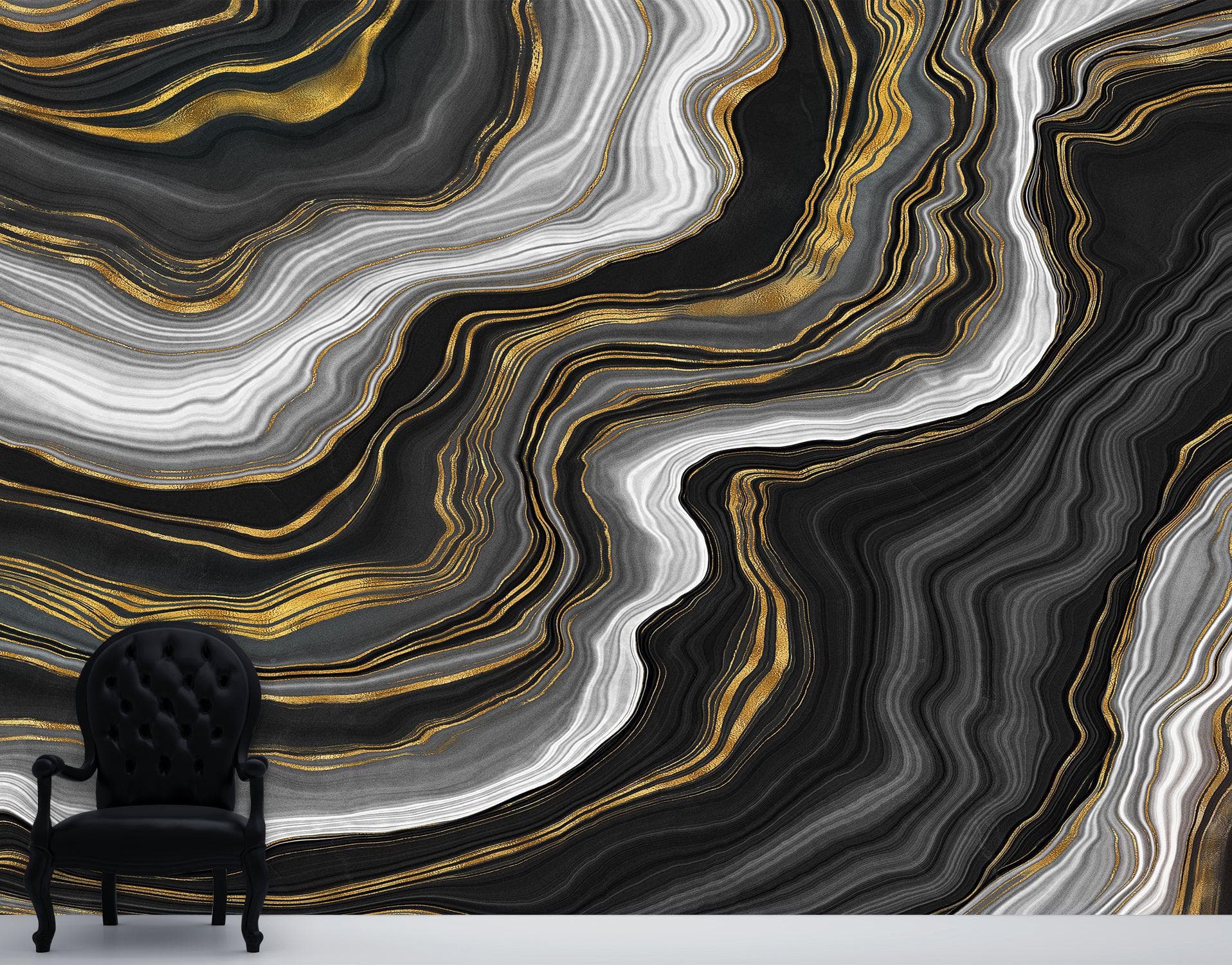 Black and Gold Abstract Marble Stone Pattern Peel and Stick Wallpaper. #6146