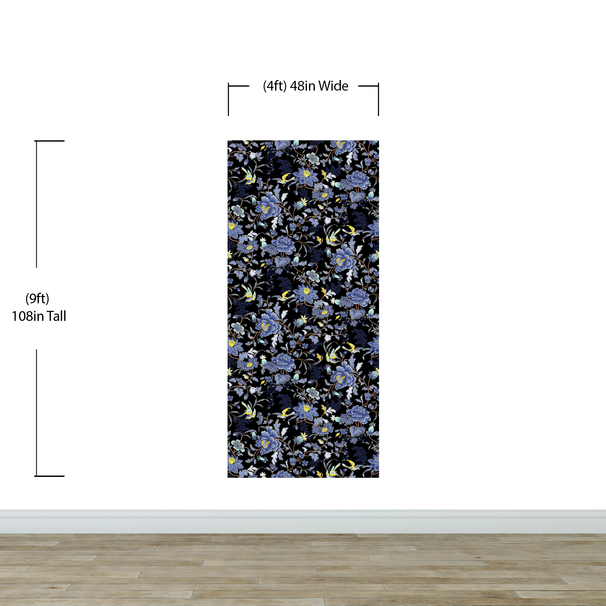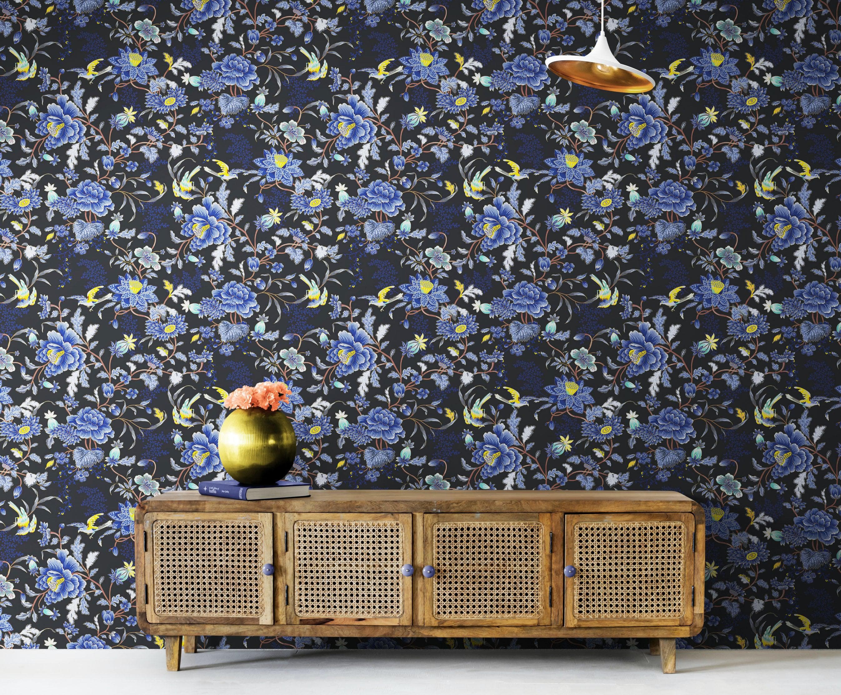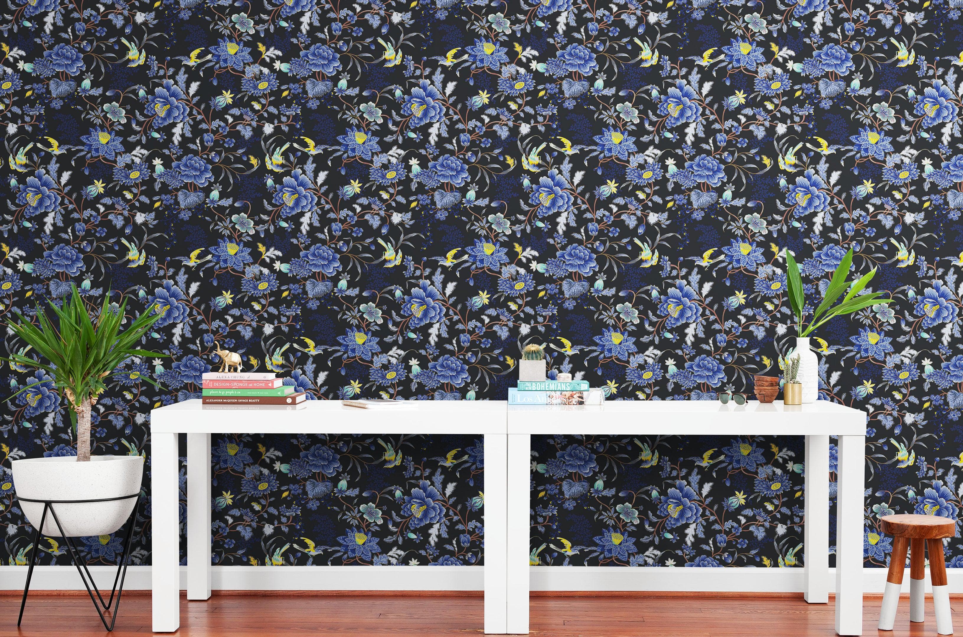 Blue and Black Color Flower Pattern Wall Mural. Tropical Botanical Floral Peel and Stick Wallpaper. #6437