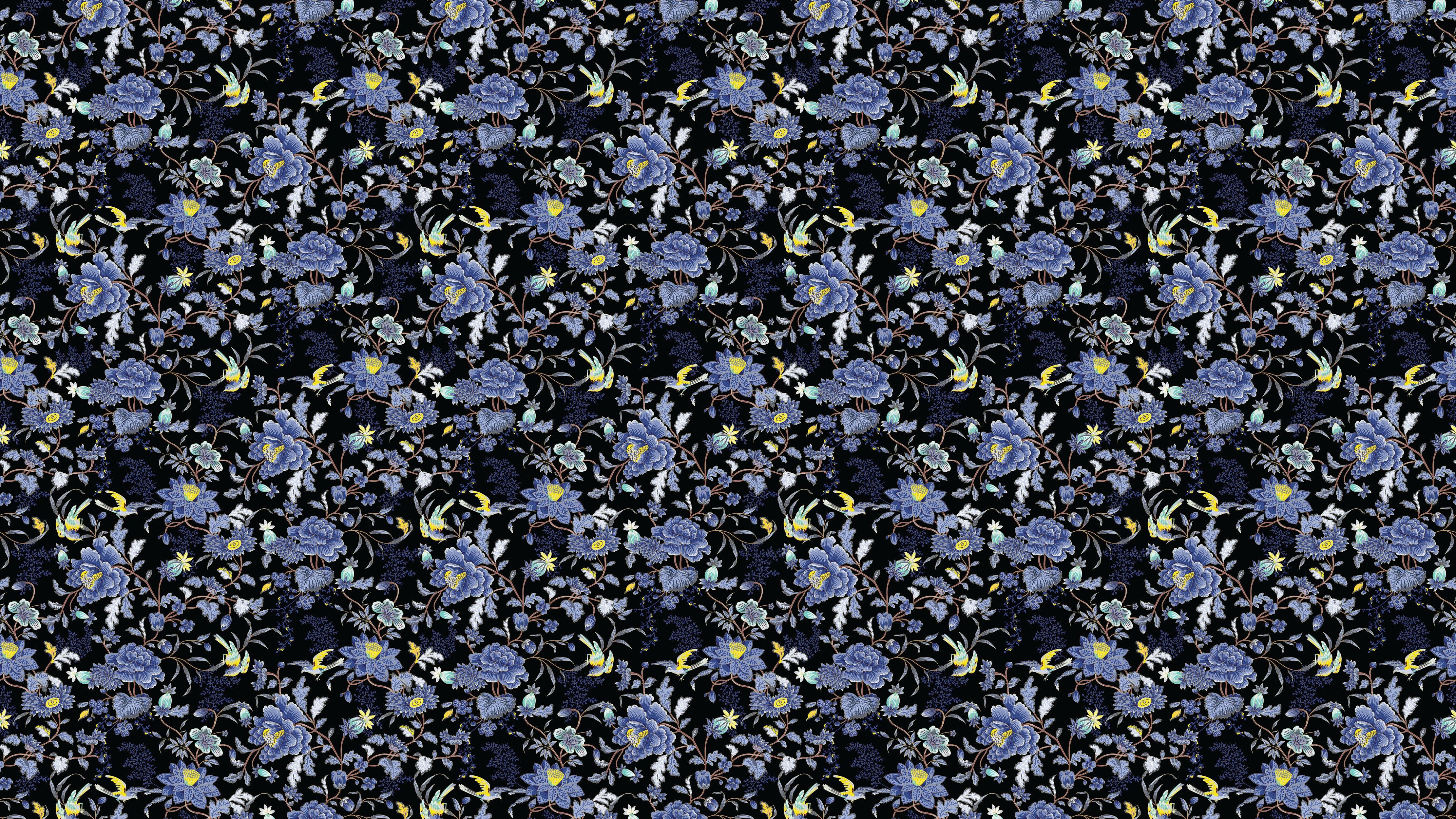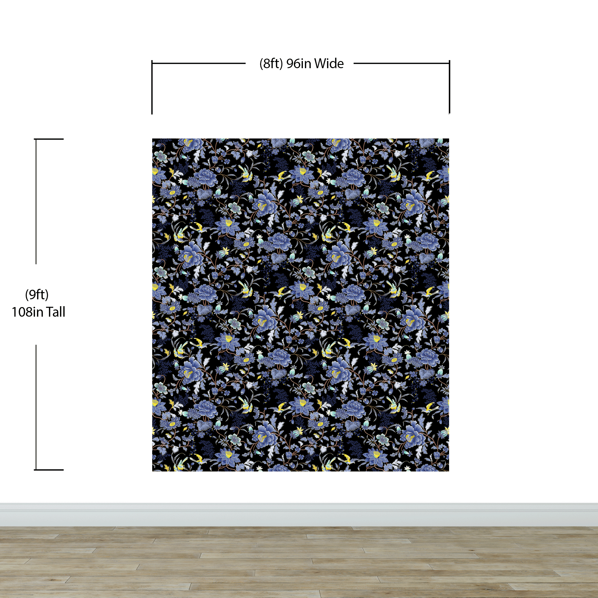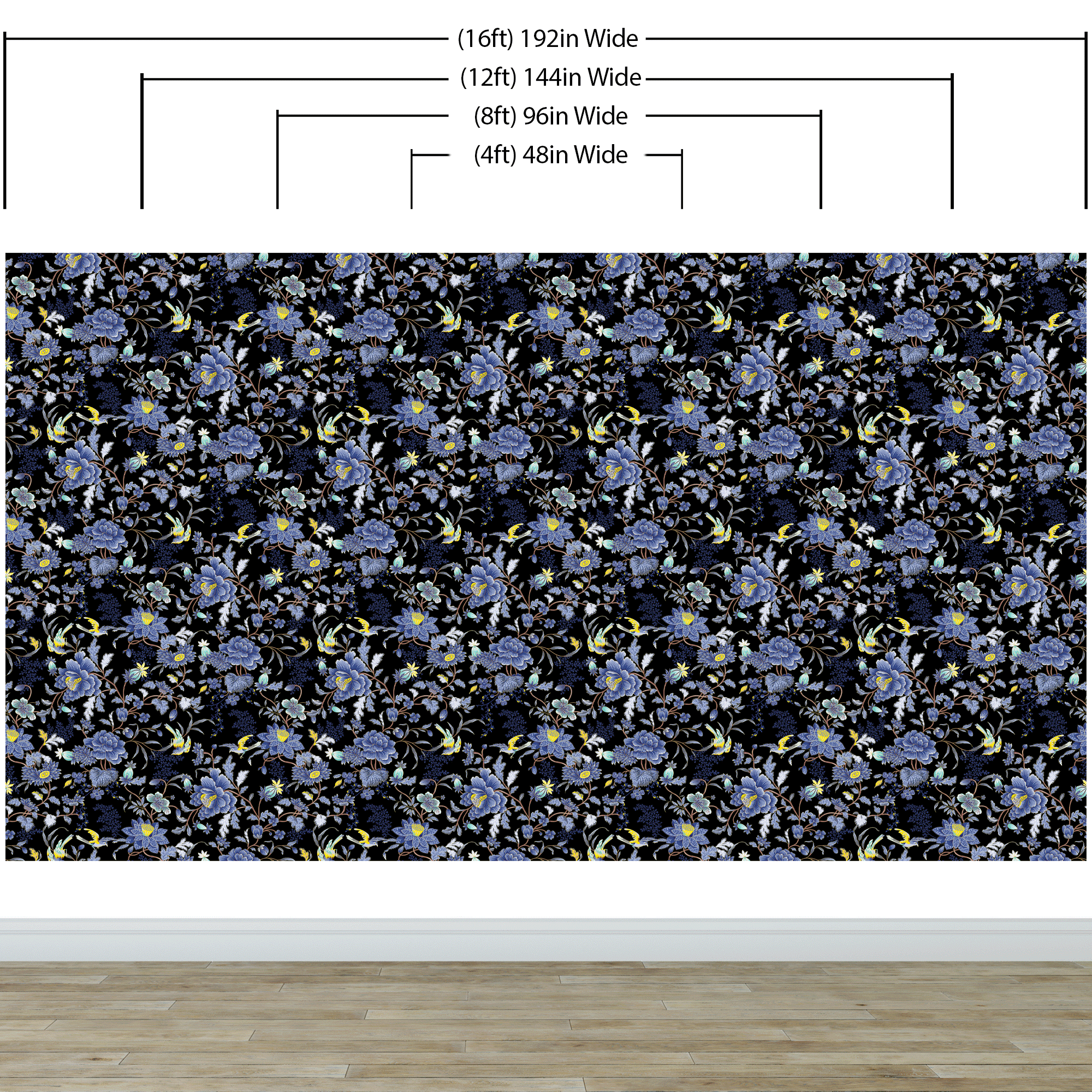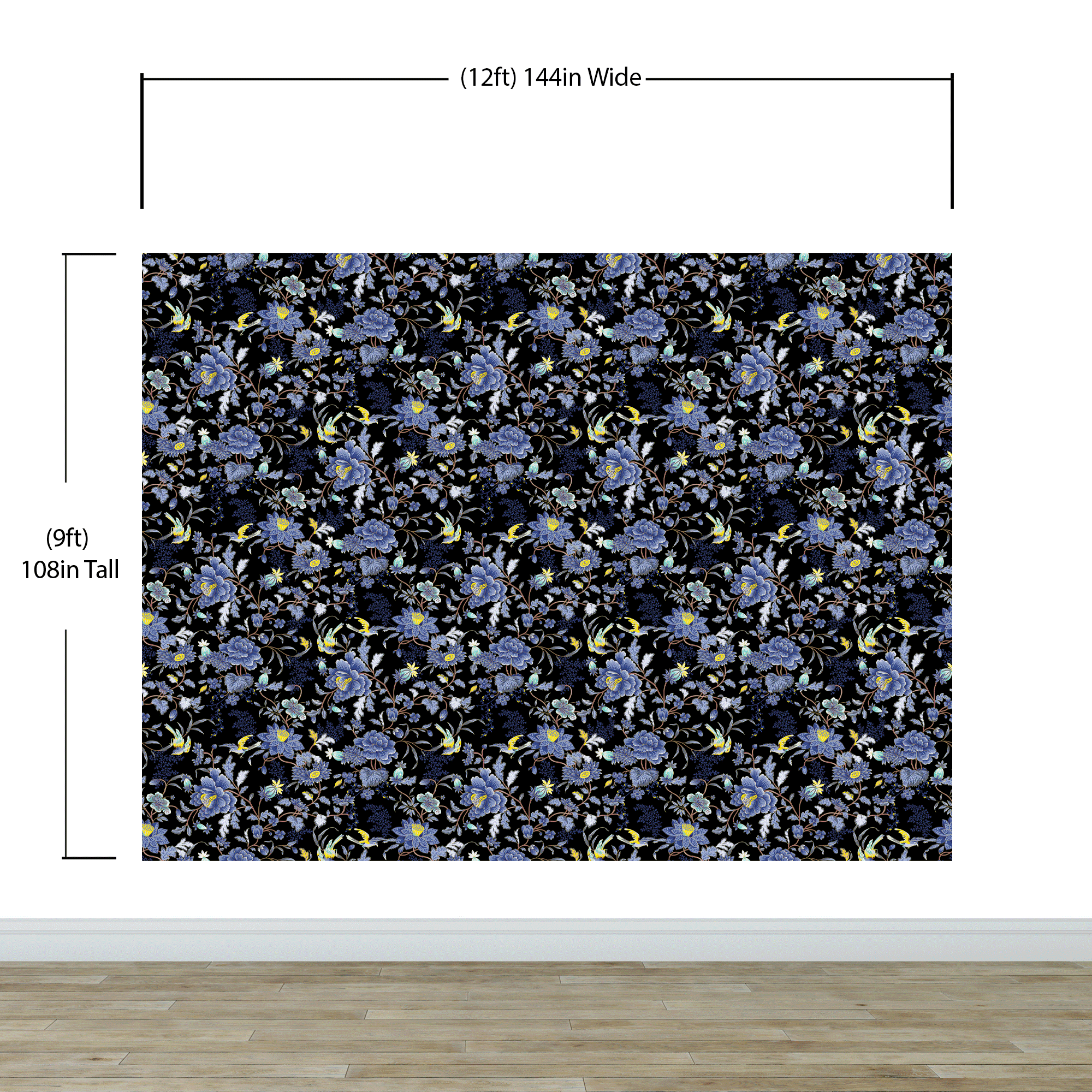 Blue and Black Color Flower Pattern Wall Mural. Tropical Botanical Floral Peel and Stick Wallpaper. #6437