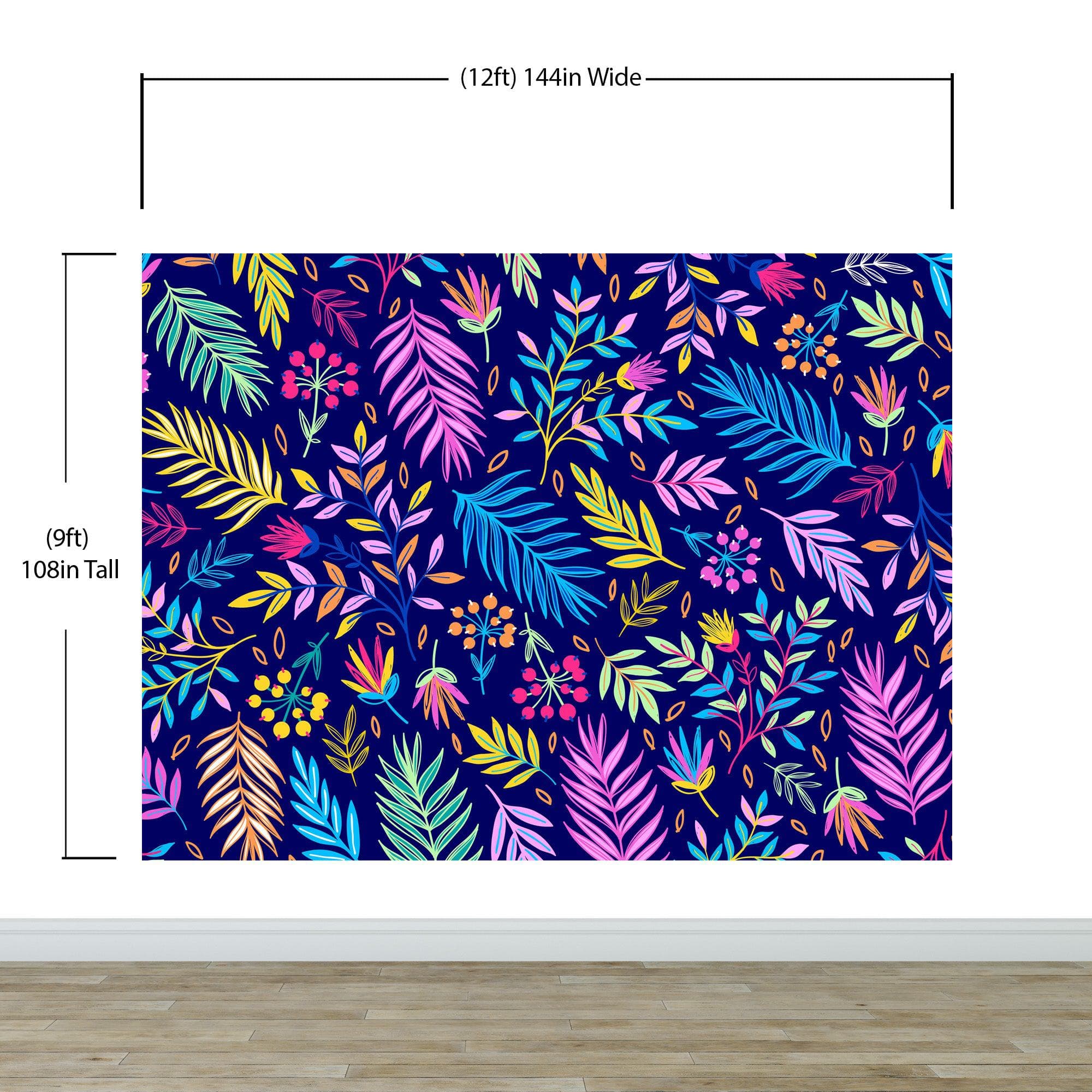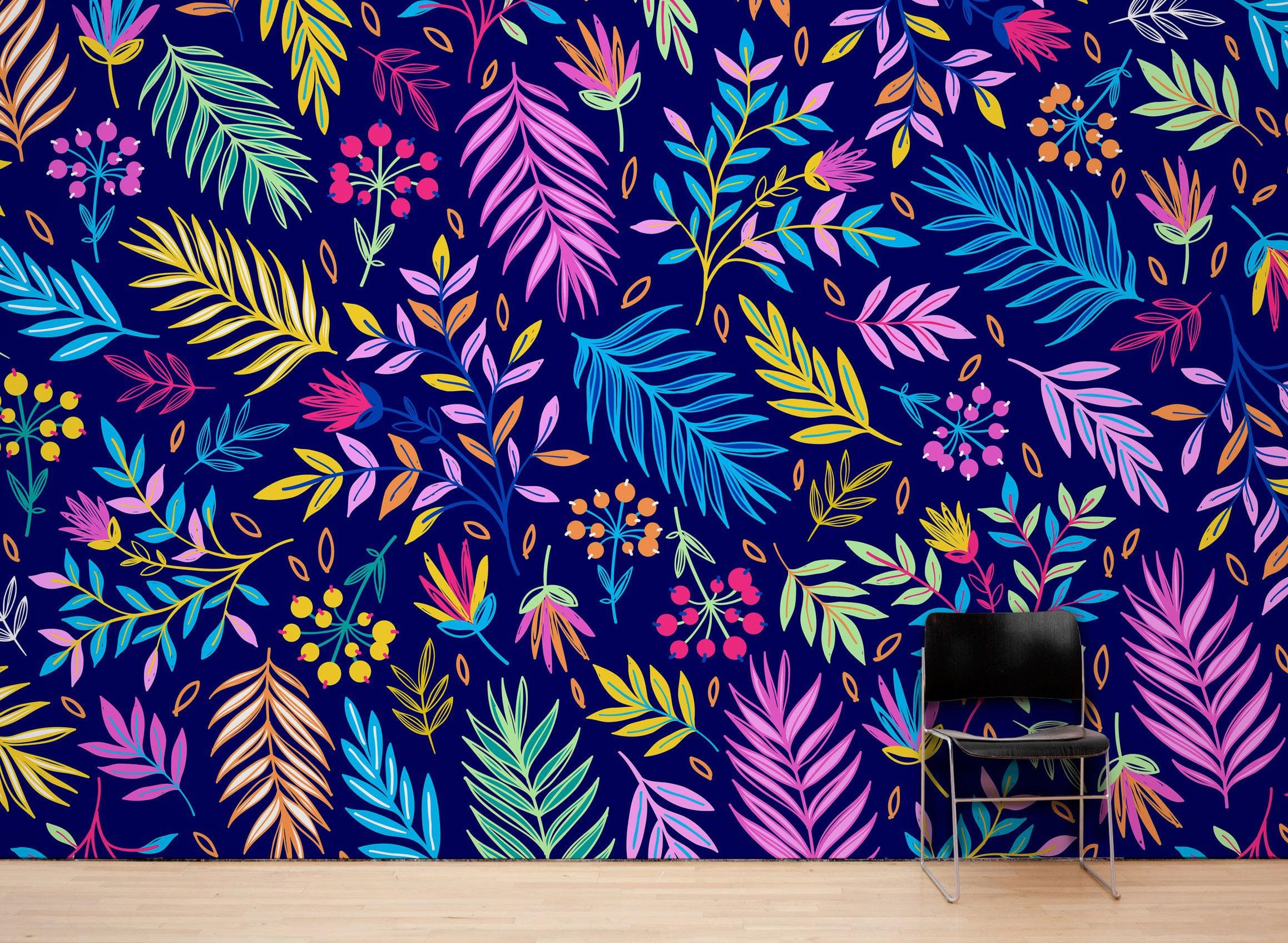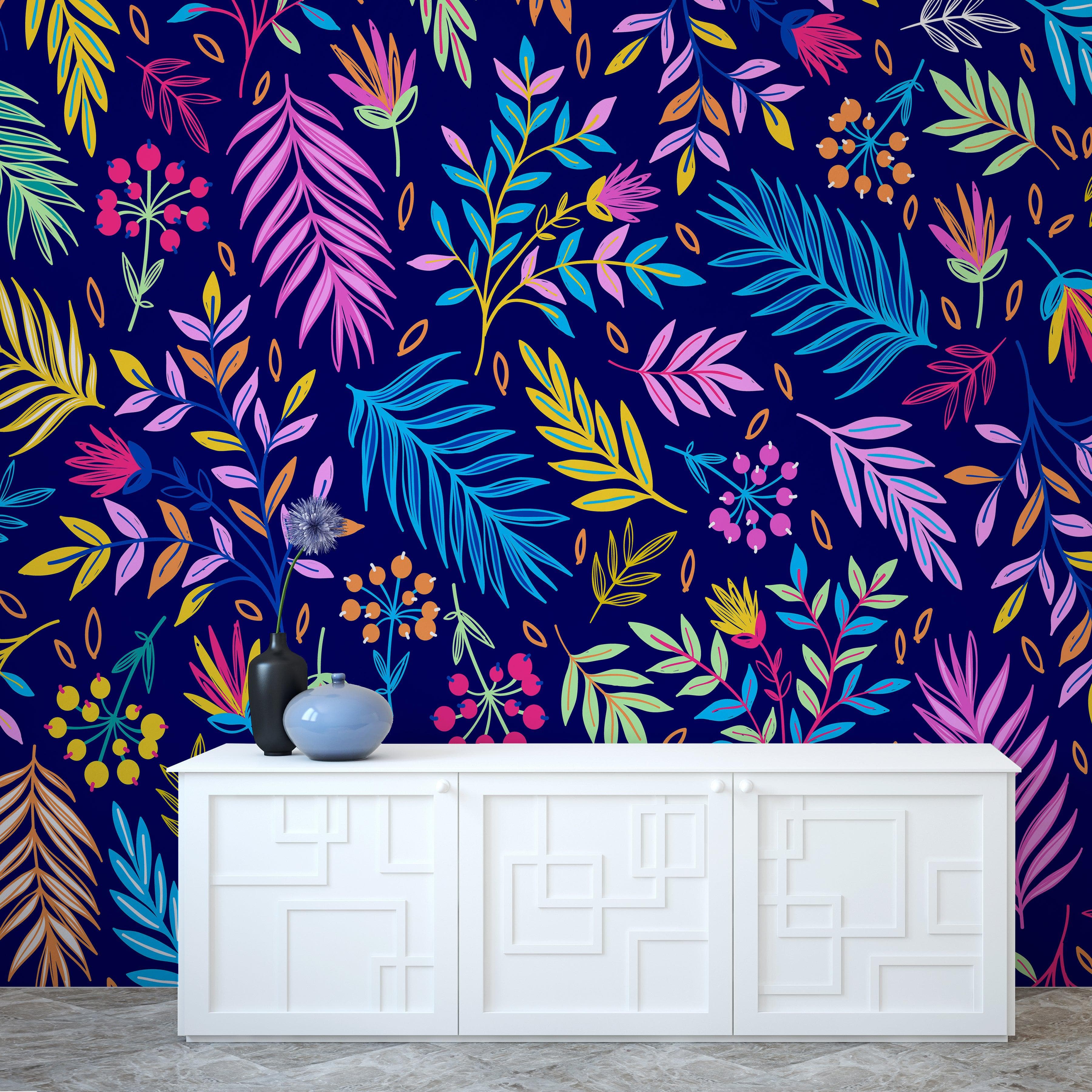 • Colorful branches and leaf pattern over a dark blue color backdrop wall mural.