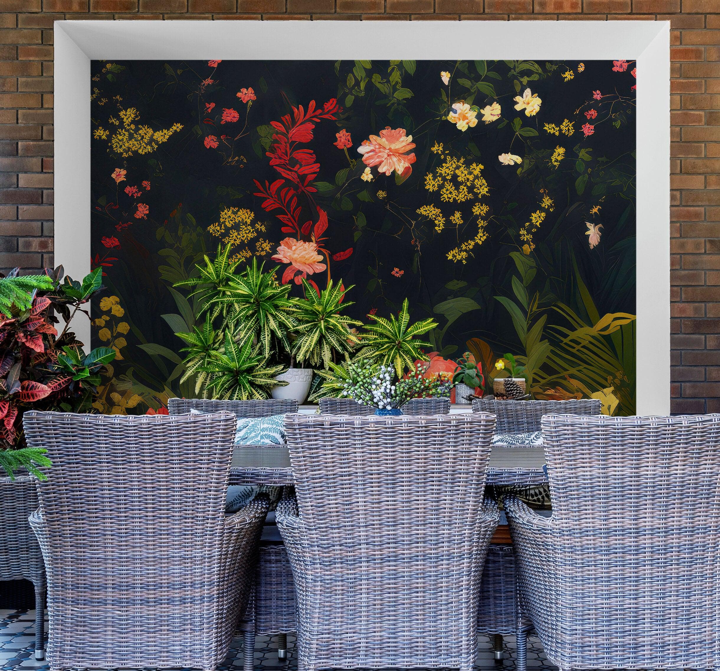 The wallpaper features a beautifully detailed print of flowers in shades of Red, yellow, and green, arranged in a traditional Chinoiserie style. The intricate details of the flowers and leaves are highlighted by the dark black background, making the design truly pop.