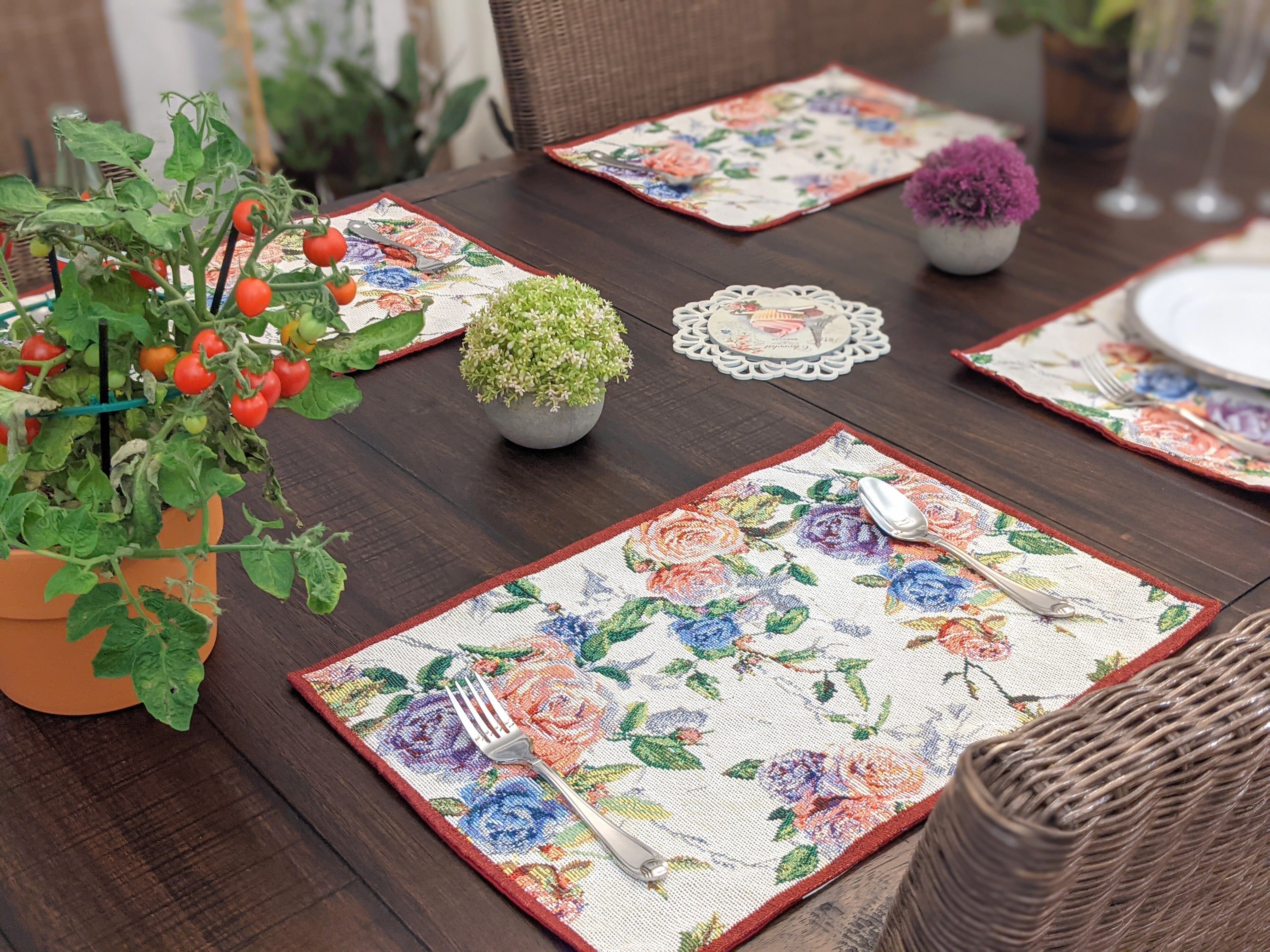 This set includes four matching placemats, allowing you to create a beautifully coordinated table setting that exudes charm and elegance. Perfect for entertaining guests or adding a touch of floral flair to everyday dining.