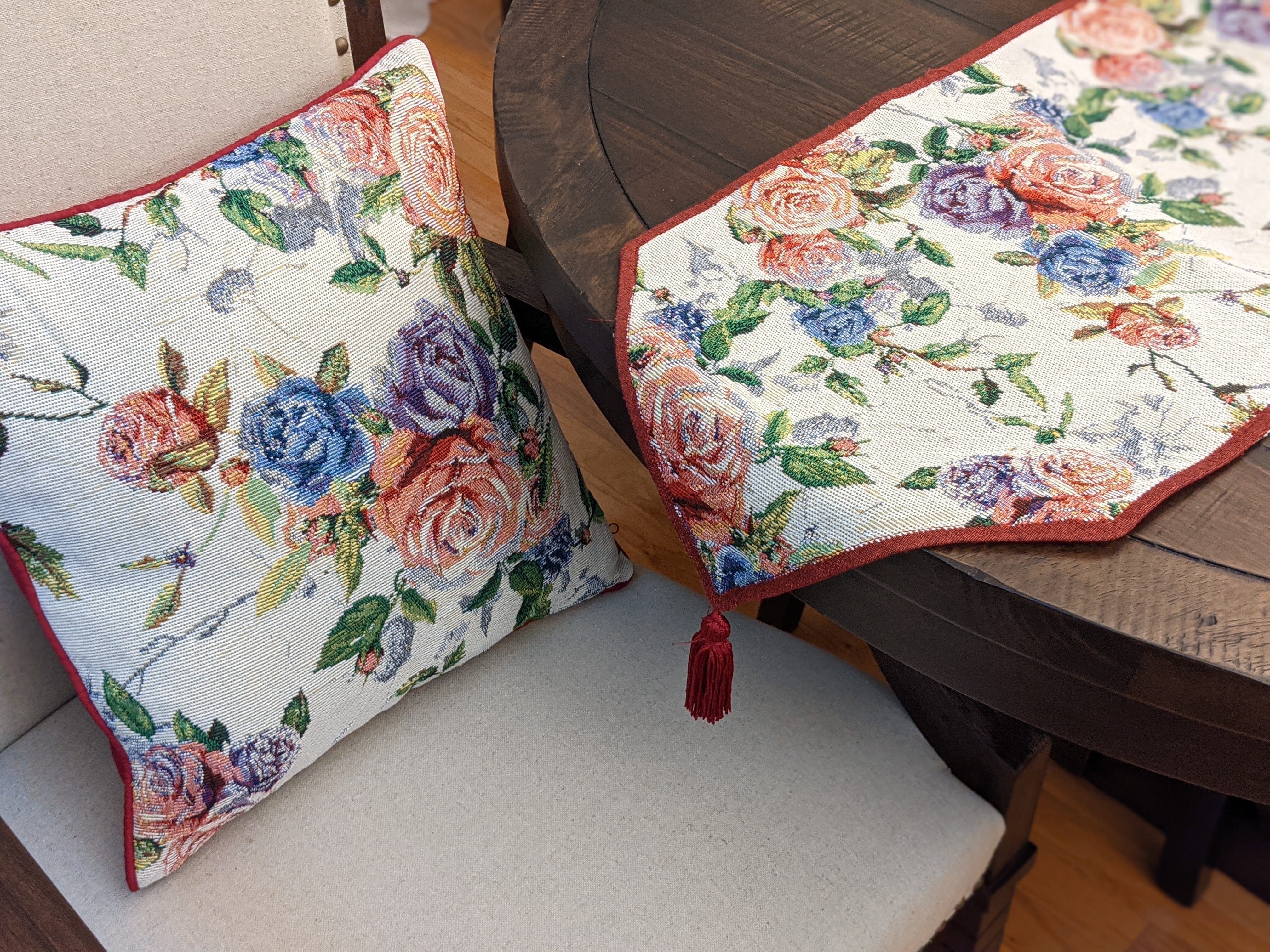 Enchanting and Vibrant with hints of pink, blue, purple and green rose patterns on our lightweight, durable and woven cotton linen table runners.
