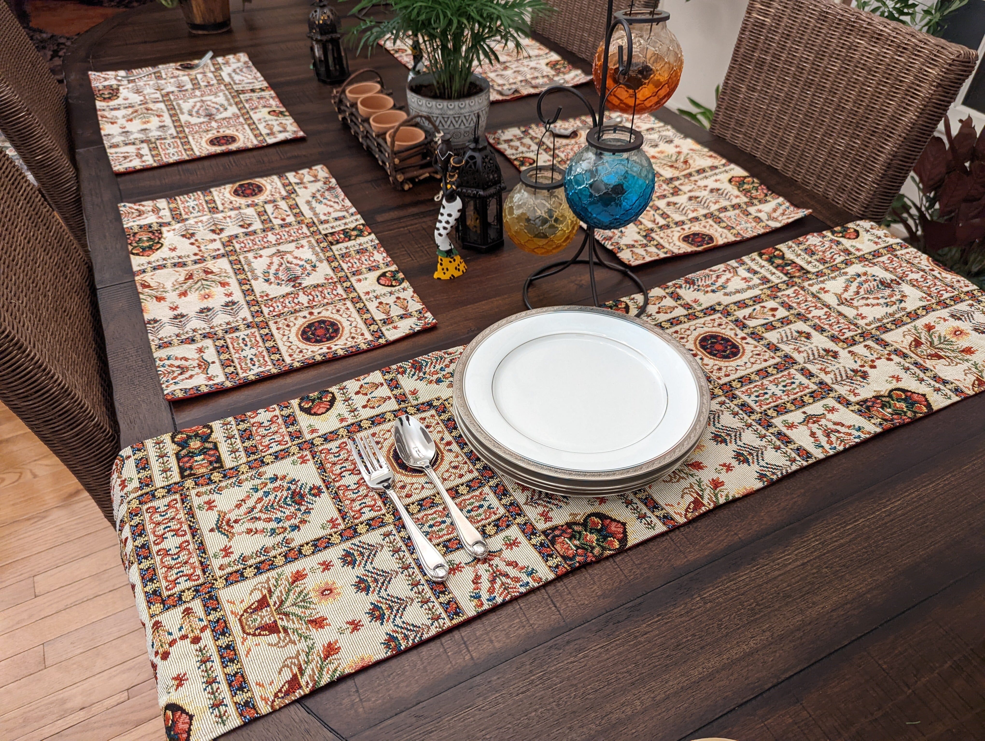 Accent your dining table with beautiful and colorful golden floral designs on our one of kind DaDa Bedding table runners.