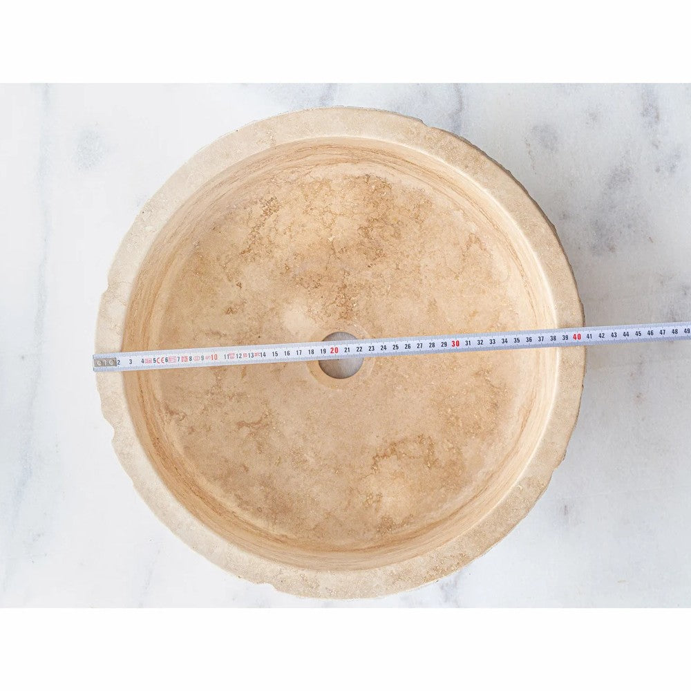 The smooth honed interior and hand-chiseled exterior ensure this vessel sink will be the focal point of your bathroom decor. The breathtaking beige travertine from Turkey will blend into any setting. These round bowl sinks for bathrooms are not only convenient for everyday use but also an ornament for your living space. The artisanal construction ensures that no two sinks will be exactly identical.