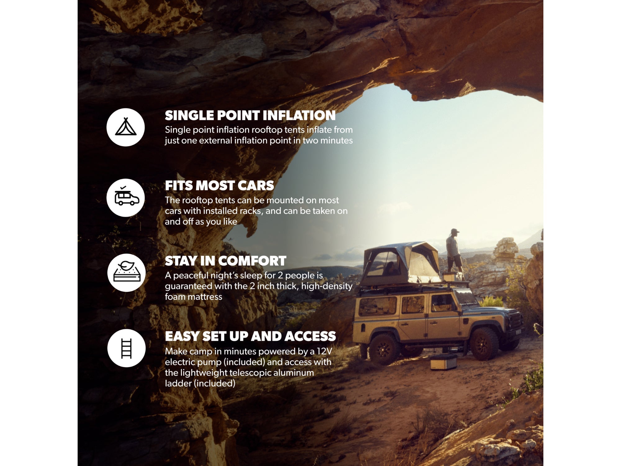 The Dometic TRT 140 AIR rooftop tent offers ultra-sturdy, single point inflation with an integrated foam mattress for fast, comfortable shelter for two people. It's ideal for compact cars, hatchbacks, and trucks, inflating quickly with the 12 V pump. Breathable polycotton material and mesh windows reduce condensation and provide comfort in all climates. Made with 300D Ripstop Polyester material and a tri-fold design, it's easy to pack and transport.