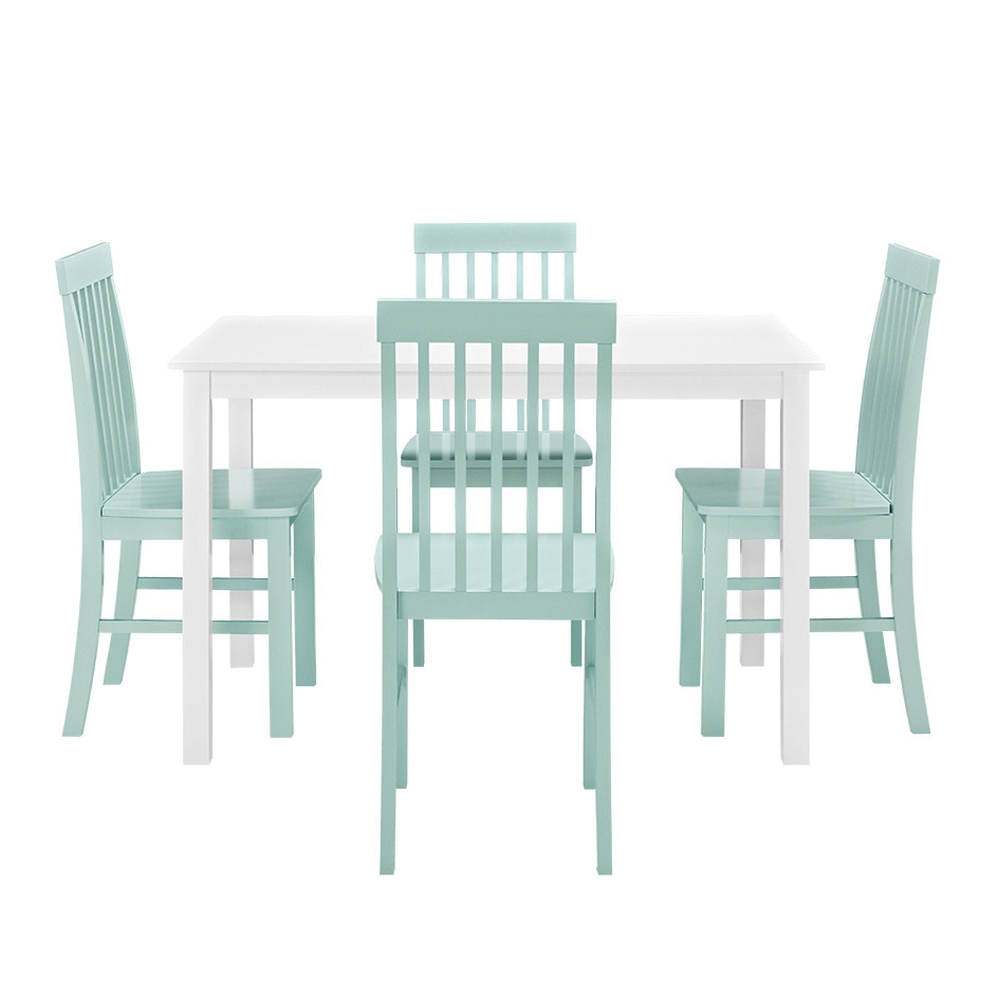 Take your kitchen or dining area to the next level with our modern style dining set. Including four slatted back chairs with slightly curved angles throughout, in a bright colored finish. The table features a classic, straight-line design with a painted, fresh white finish for a simple, yet elegant table. Enjoy meals with your family, with this stylish dining set.