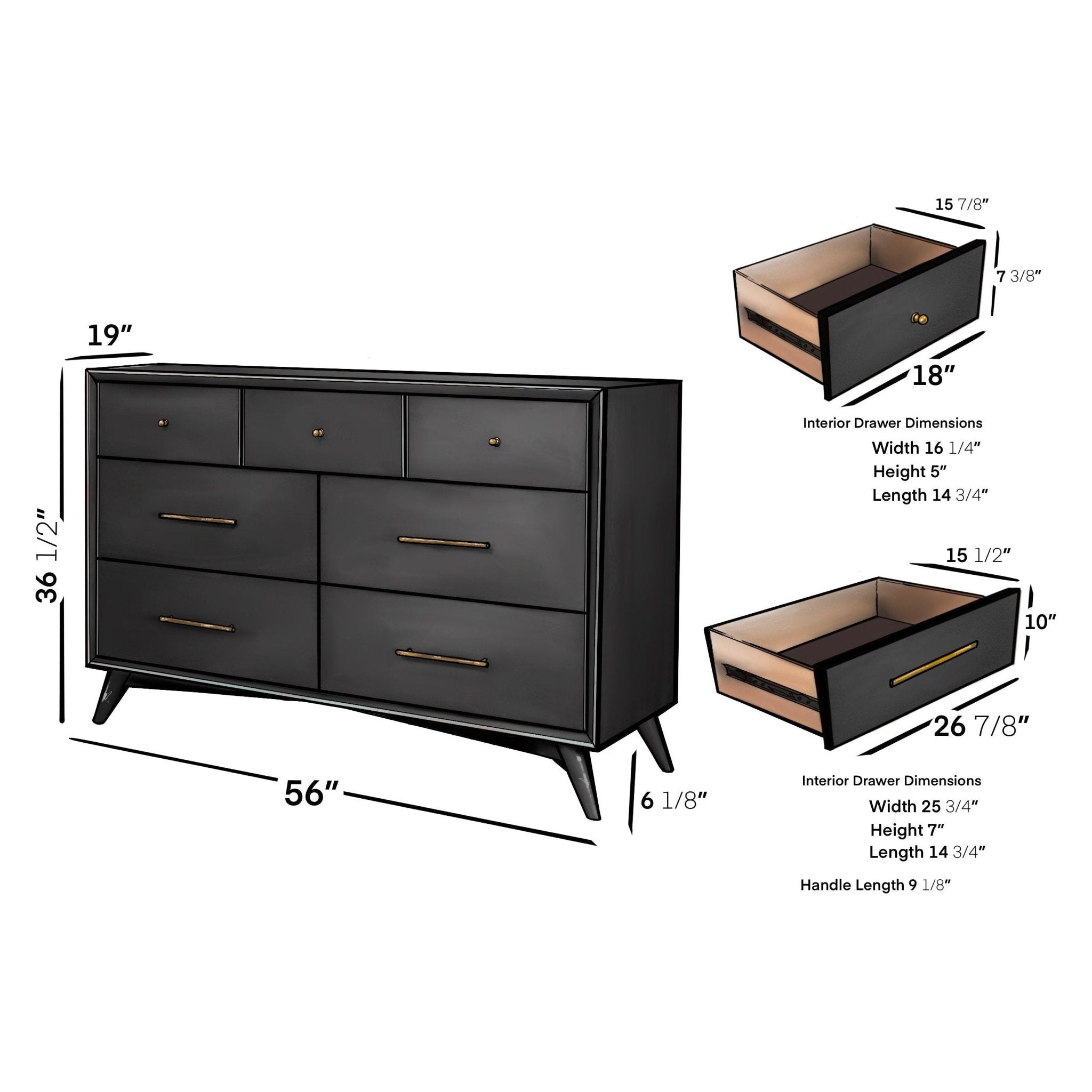The Flynn collection features the classic lines of Mid-Century Modern furniture that never goes out of style.  Its sturdy frames are built to last, constructed of sustainably sourced solid Mahogany to ensure a lifetime of use.  The case pieces provide a roomy storage solution and make it easy to create a cohesive decorating style or mix and match for a more personalized look.  The Flynn dresser features 7 drawers for storage.  Featuring felt lined top drawers for your valuables.  The Flynn collection offers multiple finish options to mix and match for all your décor needs.