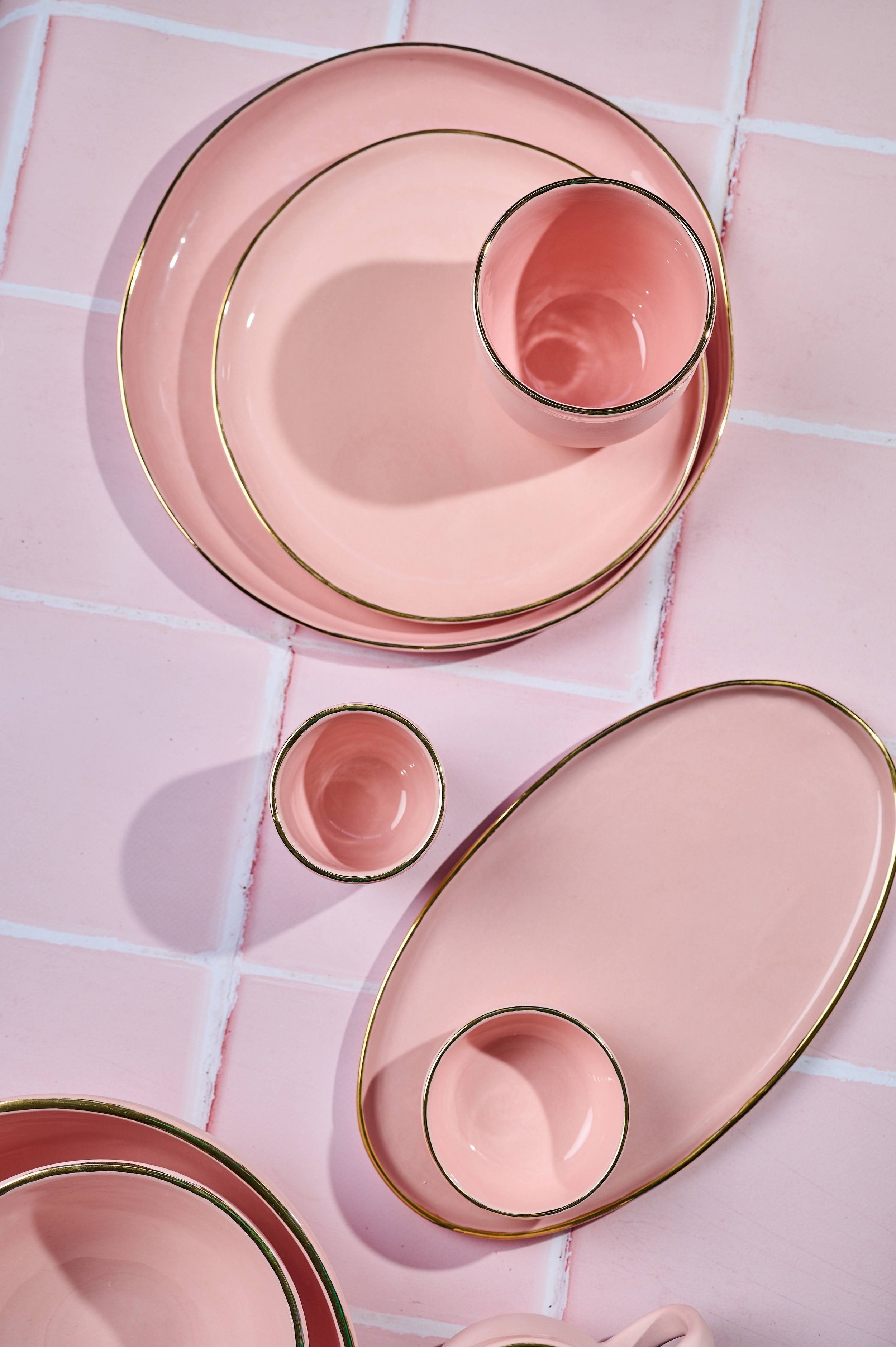 Our new handmade porcelain dinner plate sets the table with clean elegance. Dinnerware is glazed shiny neutral inside and smoothly polished on the outside. Gold rim adds a special festive touch to the plate.