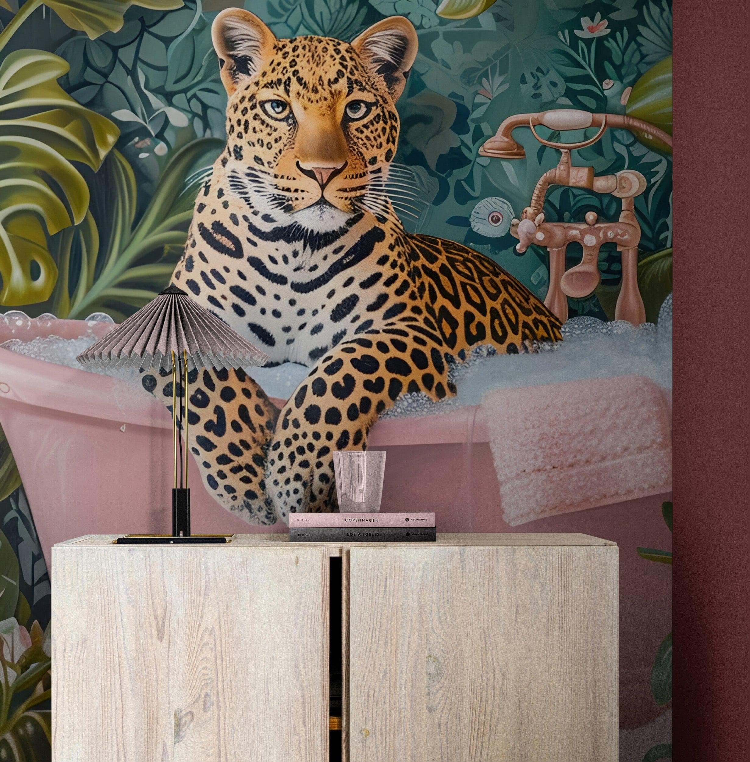 Leopard in Pink Bathtub. Stylish Animal Chic Print Wallpaper. #6852