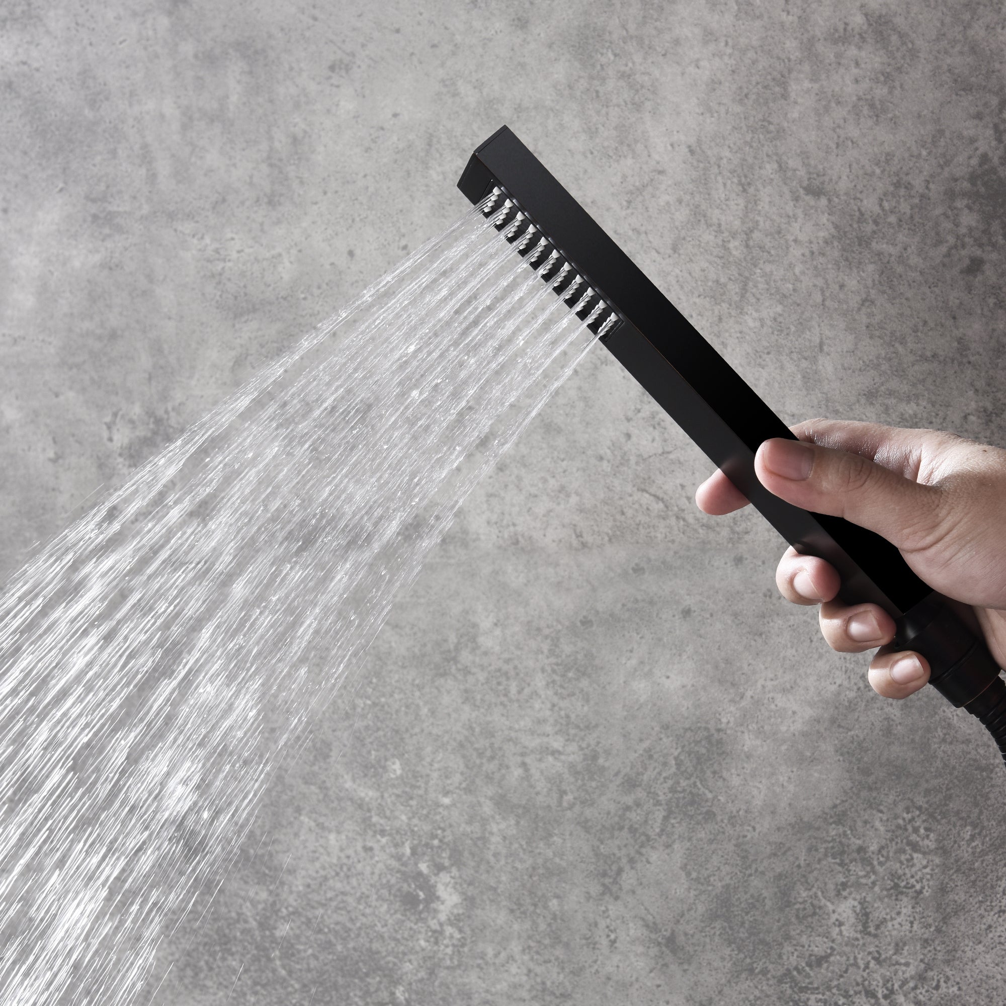 The set also includes a 16'' wall-mounted shower arm made of brass, a metal shower holder with NPT1/2'', a metal handheld shower designed to deliver high water pressure, and a 59'' stainless steel shower hose that is flexible and easy to install.