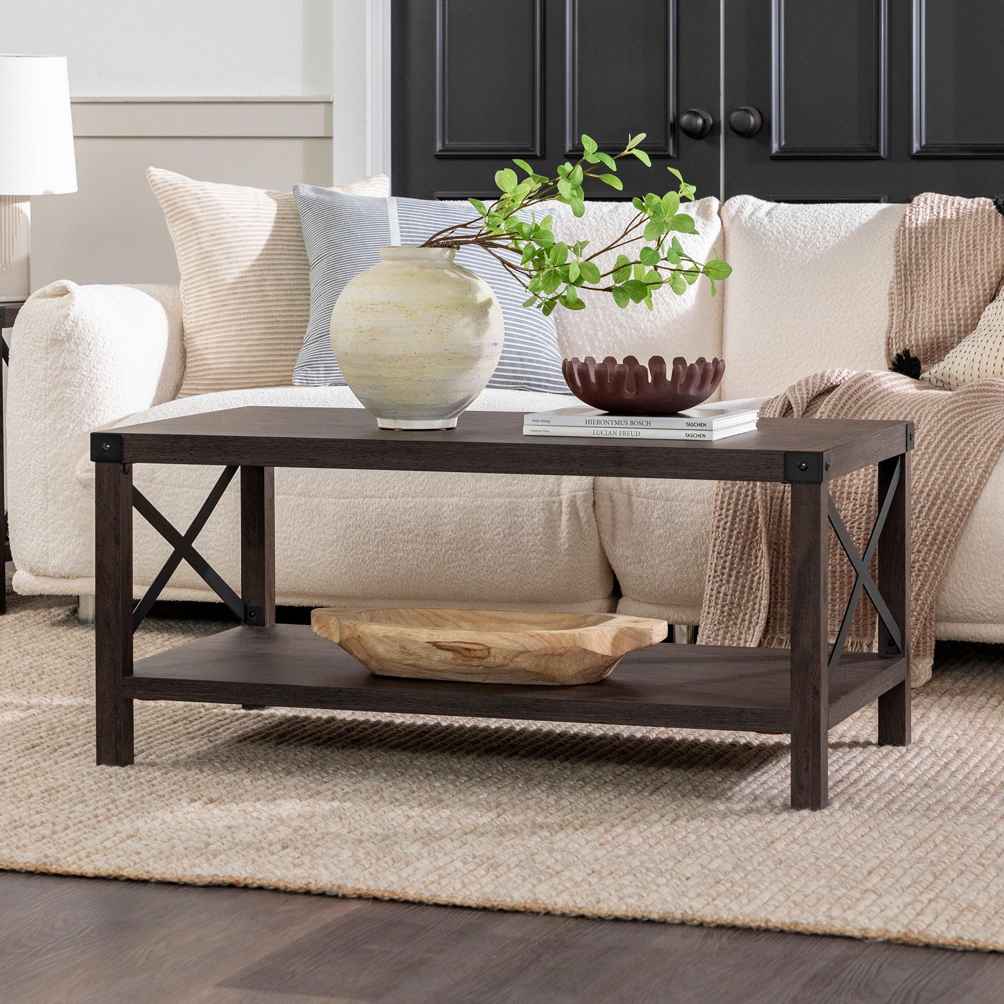 Give your living room some rustic style with our industrial inspired coffee table. Black painted metal accents are featured on the top corners and x-shaped sides, which contrast beautifully with the wood textured surface made from durable laminate. Our coffee table provides just enough space for placing down items from your TV remote to your mail, while also having a shelf underneath for simple storage or décor.