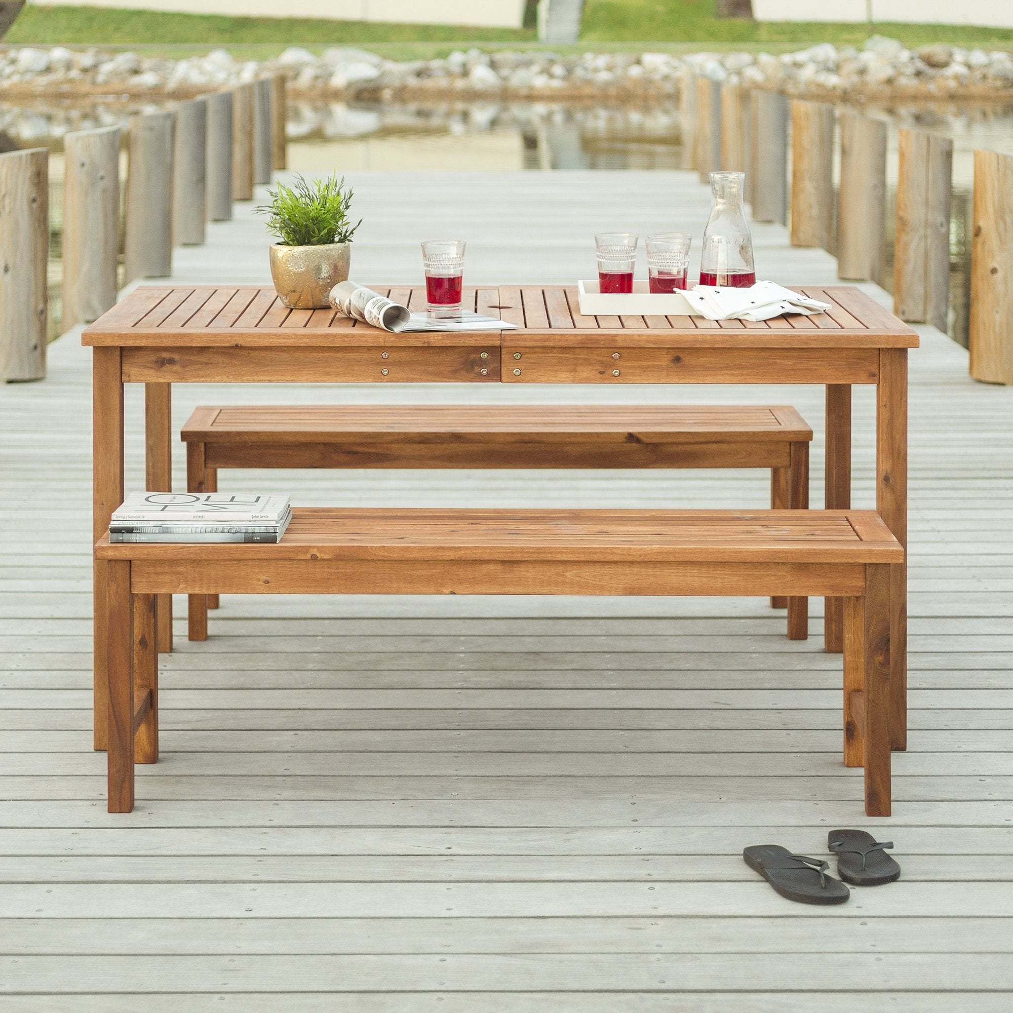 Create an additional dining space on any deck or patio with this charming patio 3-piece dining set. Constructed from solid acacia hardwood, this set is naturally sturdy yet stylish. Entertain additional guests with the hide-away butterfly leaf and three-seater benches. Relax and enjoy the outdoors with this exceptional dining set which includes two benches and table.