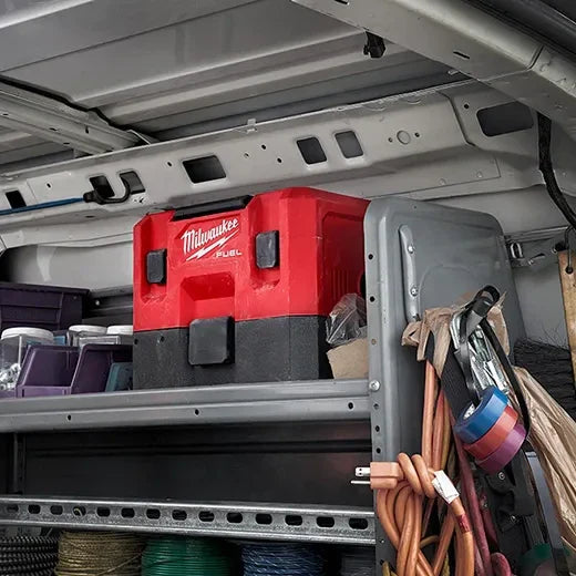 The MILWAUKEE® M12 FUEL™ 1.6 Gallon Wet/Dry Vacuum is the first cordless 12V wet/dry vacuum of its kind. It delivers users up to 40% more suction than 18V competitors, is the most compact, and is up to 2X quieter compared to other common wet/dry shop vacs. The POWERSTATE™ brushless motor delivers up to 45 CFM and 42"" of suction. It's compact footprint stores neatly in a van or cart with a stackable design and organized on-board storage conveniently keeps the attachments inside of the unit. It also comes with a wall mount hanging plate, giving users increased storage options. With 14 minutes of runtime on high and 26 minutes on the low setting, this compact vacuum is ideal for spot and service focused wet/dry quick clean up needs. This cordless wet/dry vac comes with a flexible hose, crevice tool, utility nozzle, wall mount, and a certified HEPA filter.