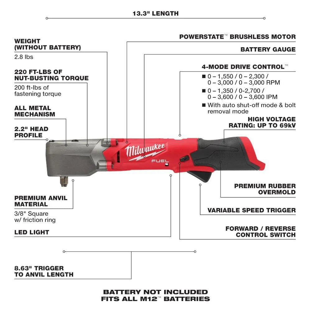 Elevate your tool collection with the Milwaukee 2564-20 M12 FUEL™ 3/8" Right Angle Impact Wrench. This powerful bare tool is designed for maximum performance and versatility in tight spaces. With its compact right angle design, it delivers an impressive 220 ft-lbs of nut-busting torque, making it ideal for automotive repair and other demanding applications. The friction ring anvil allows for quick and secure socket changes, ensuring you stay productive on the job.