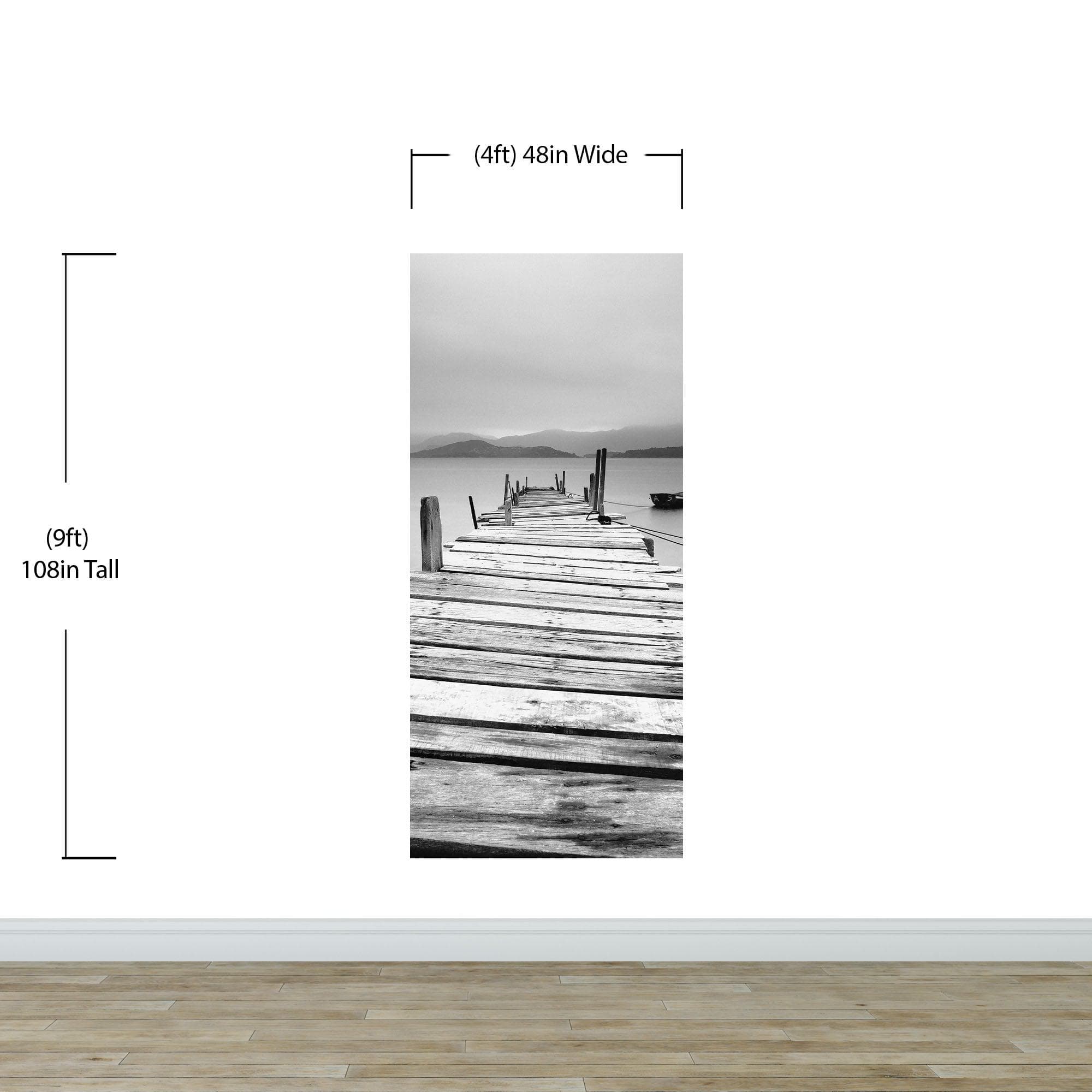 Elevate your interior with the serene beauty of our Black and White Misty Lake Wallpaper. This breathtaking mural transports you to a misty lakeshore, where a boat awaits on a peaceful pier. Experience the tranquility of nature in every glance.
