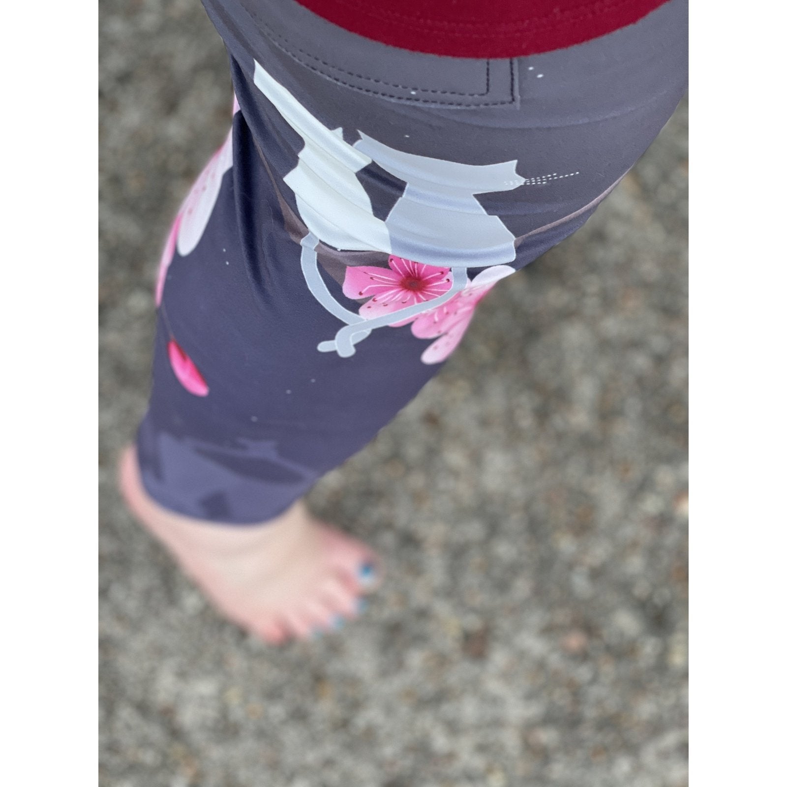 These leggings are perfect for anyone who is cat obsessed.  It features a cherry blossum tree under the moon.  Two cats sit on the branch over the water with tailsl entwined. These are custom made leggings extremely soft leggings made with 92% polyester and 8% spandex.