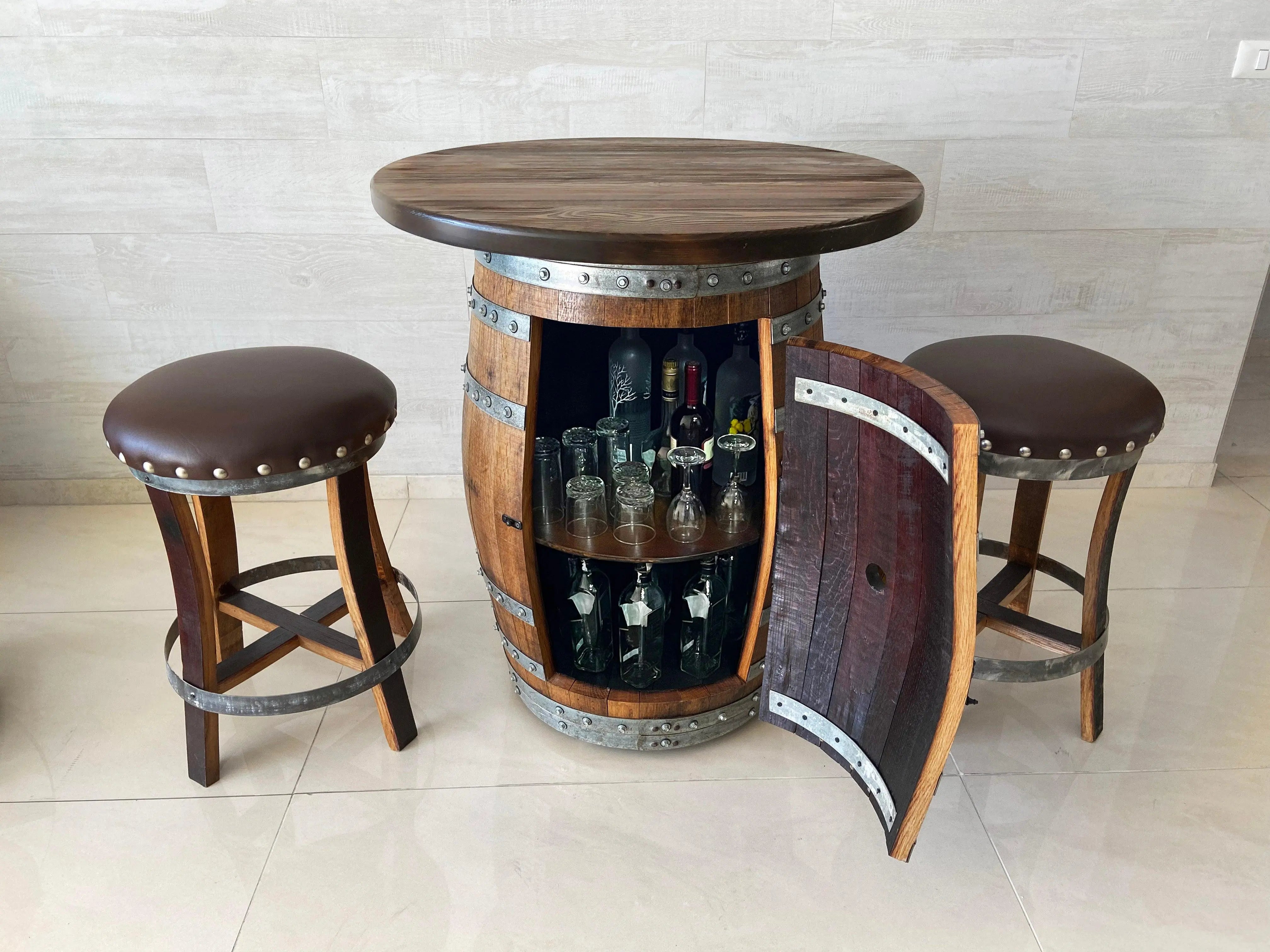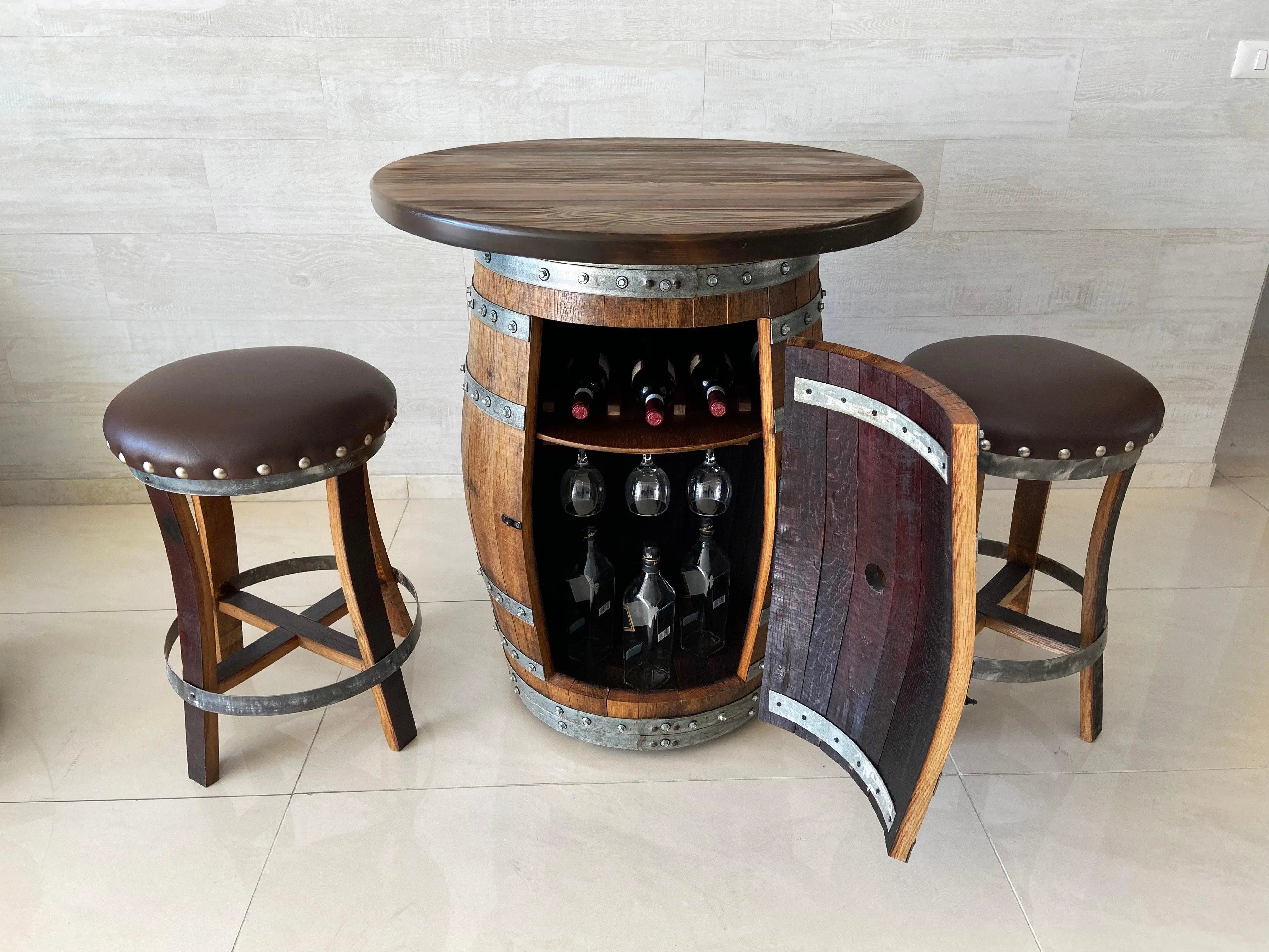 Barrel Bar + Round Top + 0, 2 or 4 Bar Stools Included.
