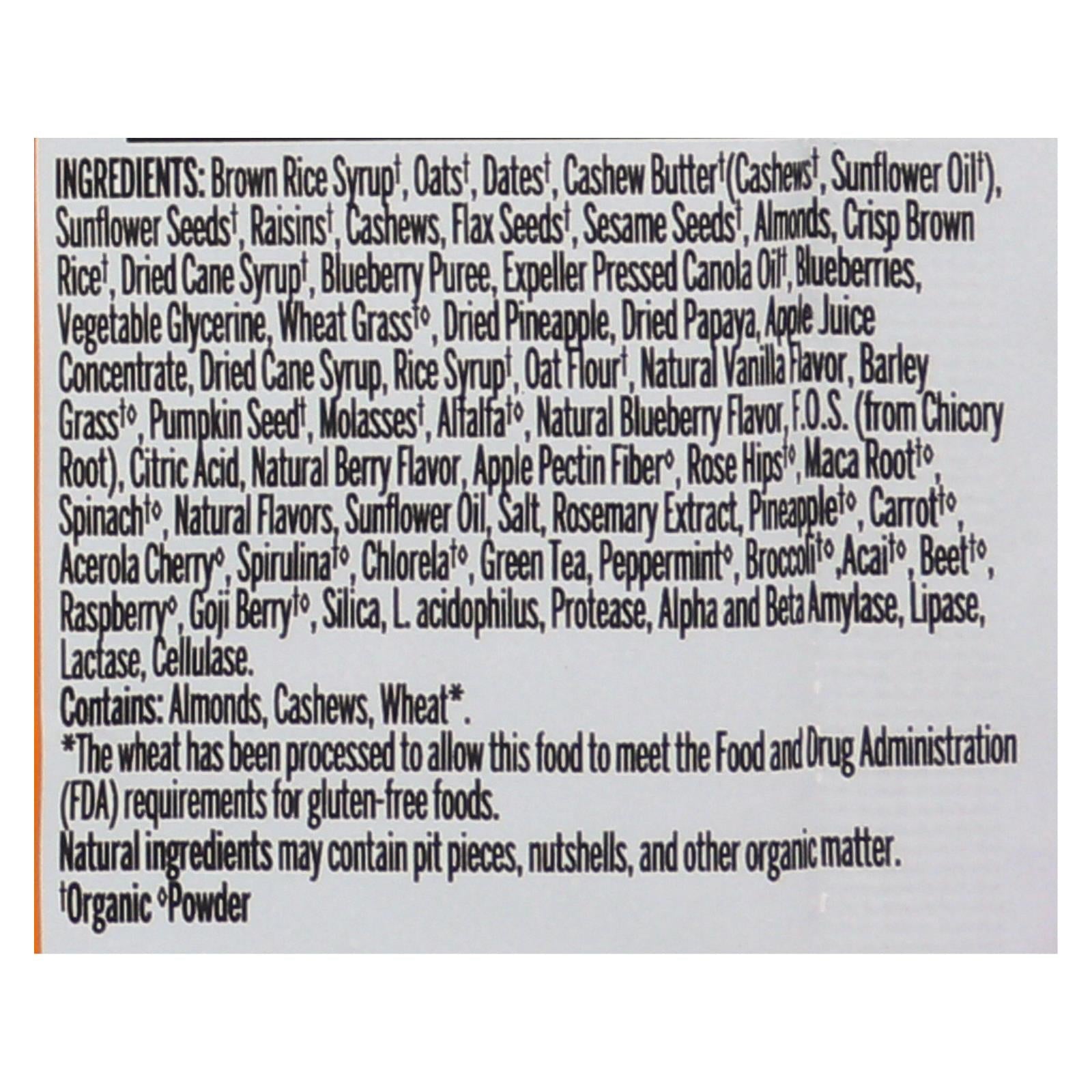 Fuel your body and mind with organic superberry Probar bar. Pack of 12 - 3 Oz. bars are packed with organic ingredients, GMO free, gluten free, dairy free, and kosher to ensure the best nutrition for your active lifestyle. The bars are made with a combination of brown rice syrup, oats, dates, cashew butter, sunflower seeds, raisins, cashews, flax seeds, sesame seeds, almonds, cane sugar, blueberries, brown rice crisp, expeller pressed canola oil, oat flour, vegetable glycerine, apple juice concentrate, wheat grass, alfalfa grass, brown rice flour, pumpkin seeds, molasses, natural flavors, barley grass, rosemary extract, citric acid, sea salt, and sunflower oil. Organic Superberry Probar bars have 70% or more organic ingredients. With a perfect blend of sweet and savory, these bars are sure to satisfy your hunger and make your taste buds happy. Enjoy a snack that is both delicious and nutritious. Indulge in an Organic Superberry Probar bar today and feel good about what you’re putting into your body. Order now and get a case of 12 - 3 Oz. bars delivered right to your door.