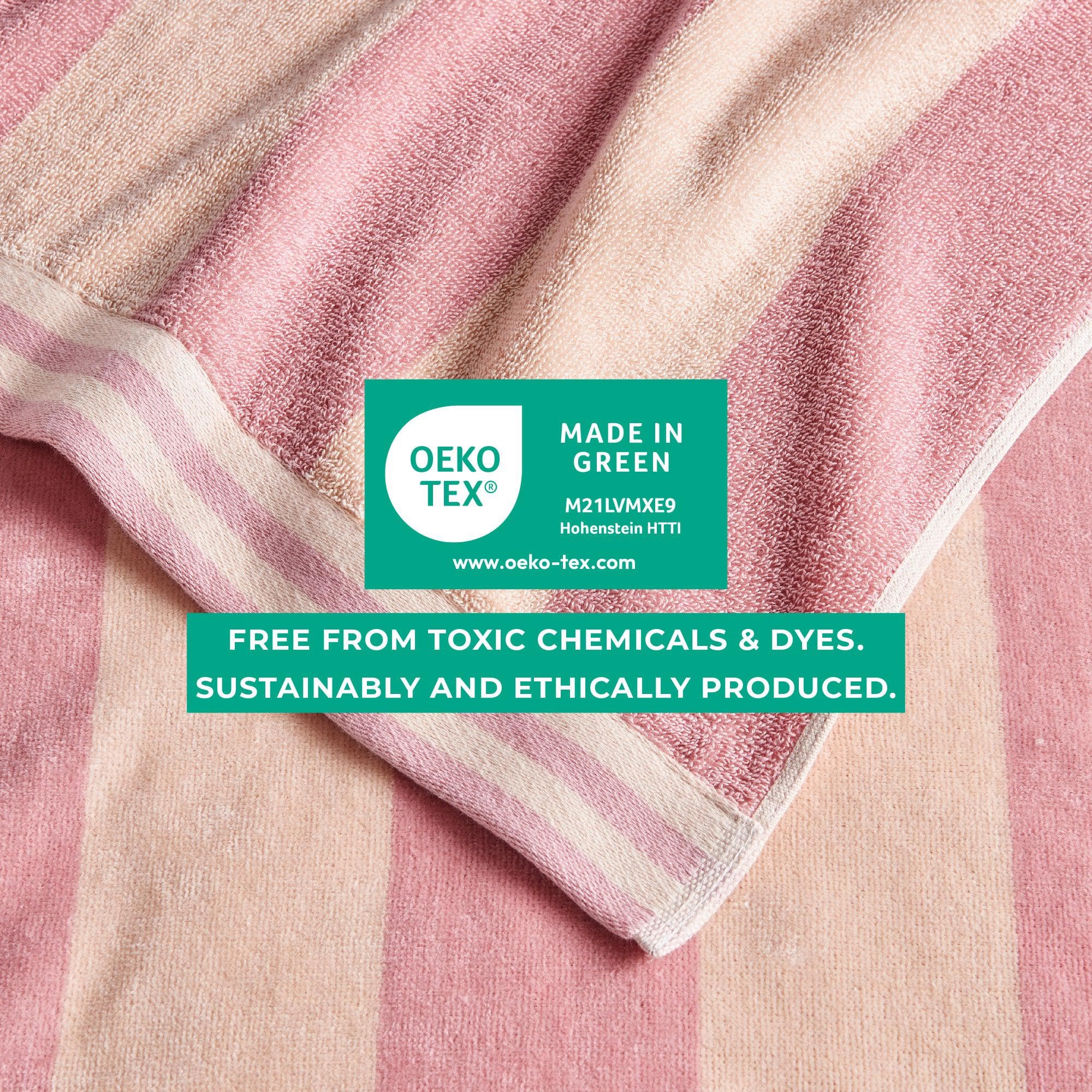 These beach towels feature your classic cabana style with a modern twist in a tasteful pastel color palette. The borders of these towels feature a horizontal striped design that sets these towels apart from the classic, everyday style. Attractively designed, these towels offer supreme comfort from the 100% cotton and modern style that will enhance your beach aesthetic. Relax in the sun on your vacation with beautiful, ultra-soft pool towels. The durability, absorbency, and classic style make them perfect for any summer traveling, vacation, or camping.