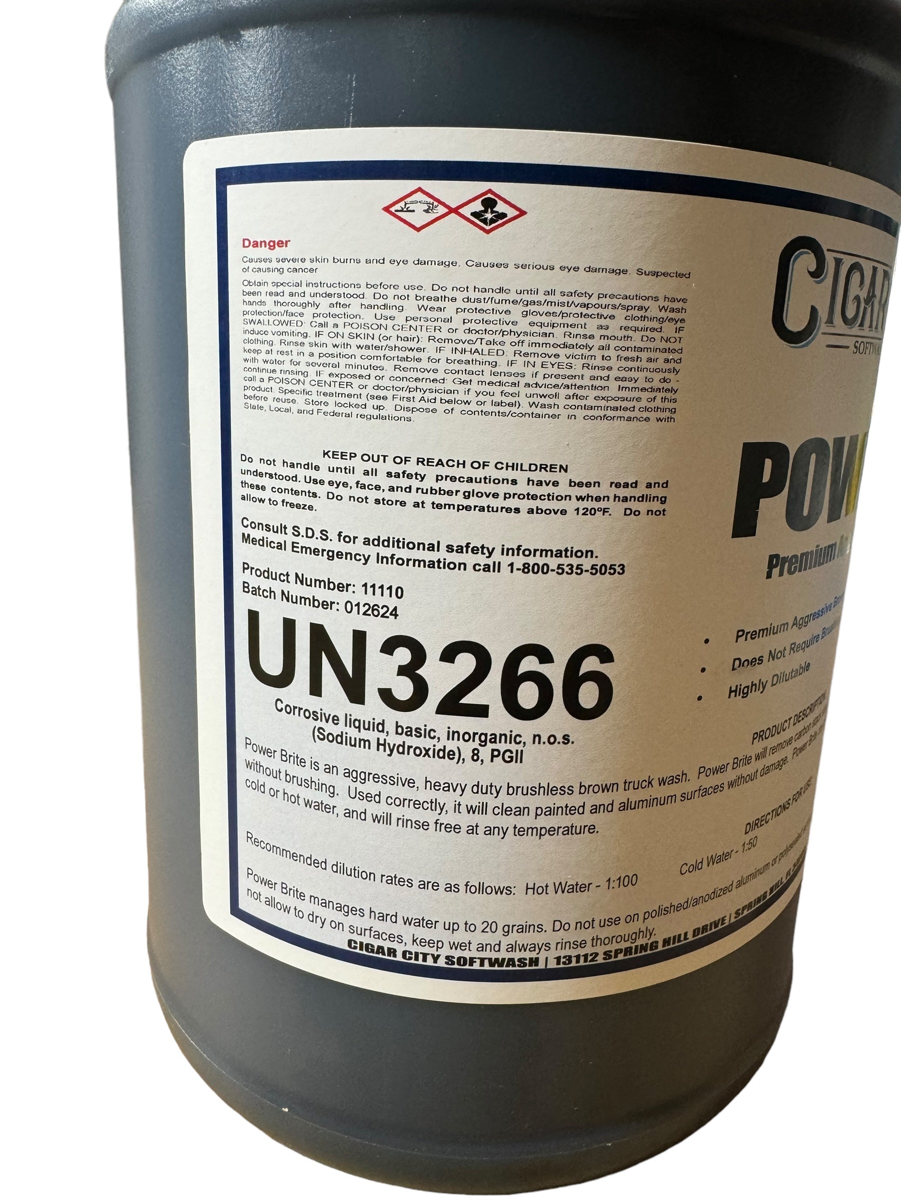 Power Brite is an aggressive, heavy duty brushless brown truck wash. It is ITD’s flagship truck wash product and one of the most popular truck wash concentrates in the industry. Power Brite will remove carbon stack stain and magnetic road film from the inside and outside of tractors & trailers, without brushing. Used correctly, it will clean painted and aluminum surfaces without damage. Power Brite can be used in drive through truck washes or with pressure washers, will work in cold or hot water, and will rinse free at any temperature.