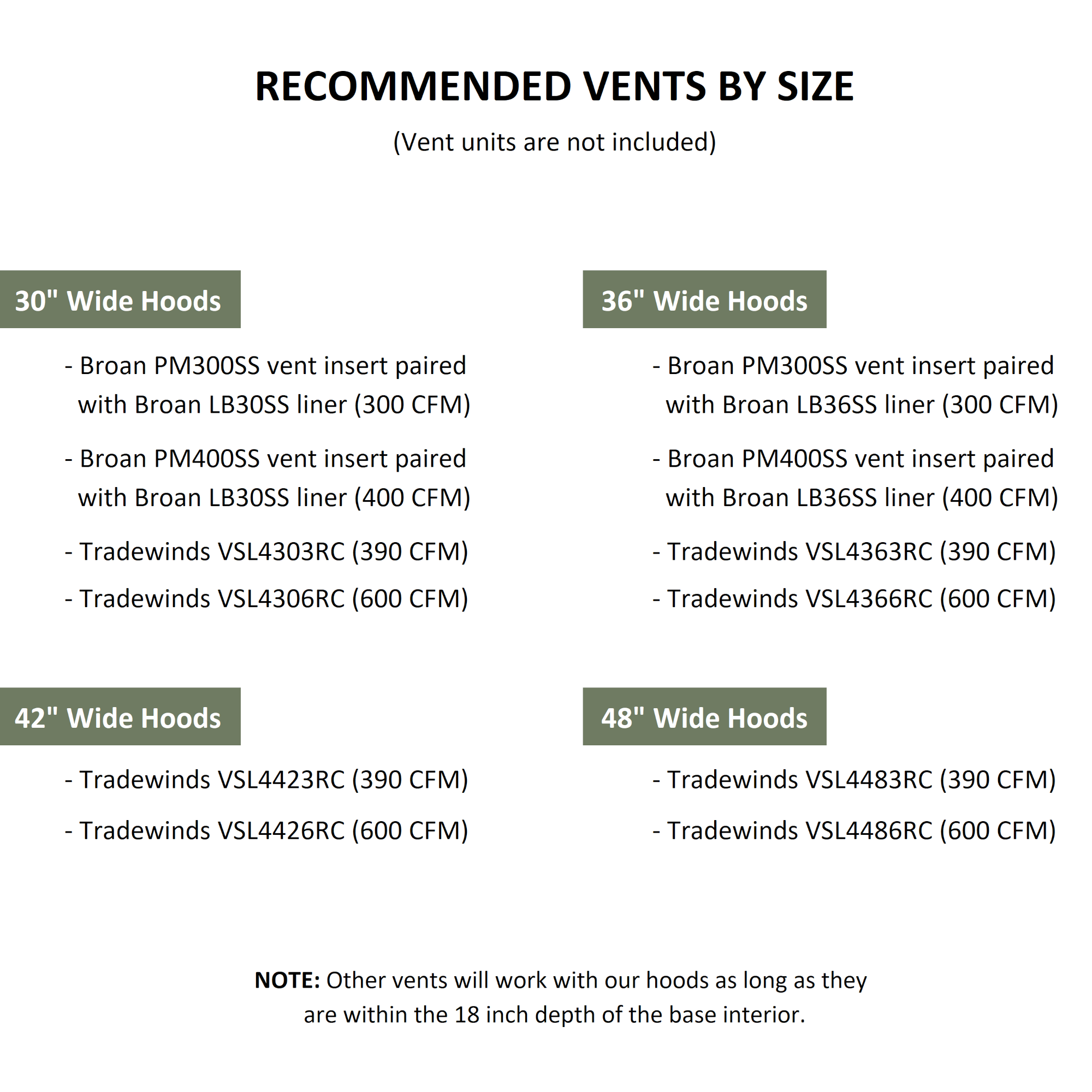 - Broan PM300SS paired with Broan LB36SS (300 CFM)