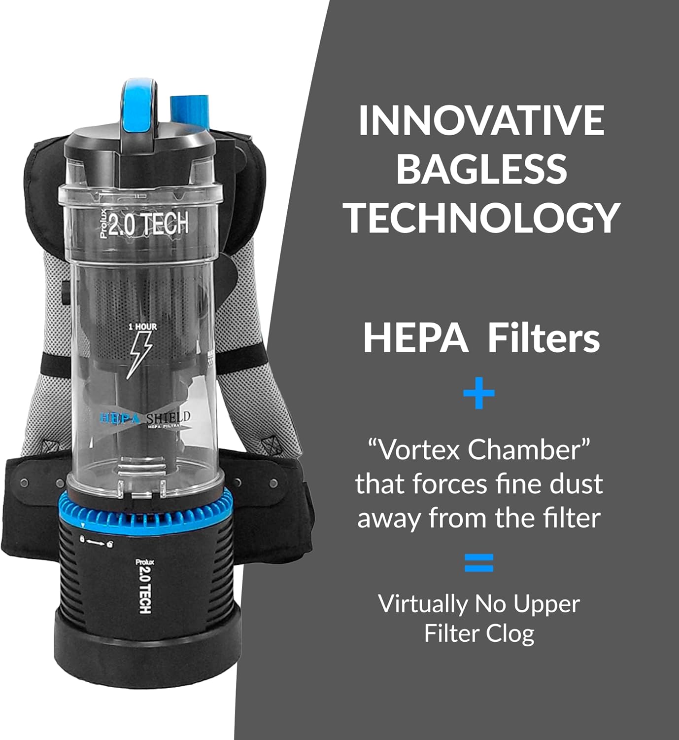 If you have never used a backpack vacuum cleaner before you have to try it! The Prolux 2.0 Backpack Vacuum is unrivaled! This is the worlds first and only Cordless, bagless backpack vacuum and Prolux's Patented 2.0 Bagless Technology DOES NOT sacrifice power or durability! Give this vacuum a shot and we KNOW you will be asking, "HOW DID THEY DO THIS!?"