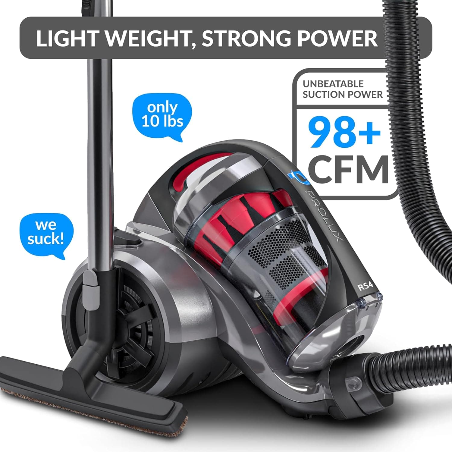 Prolux RS4 Lightweight Bagless Canister Vacuum with HEPA Filtration Premium Button Lock Tools and Automatic Cord Rewind