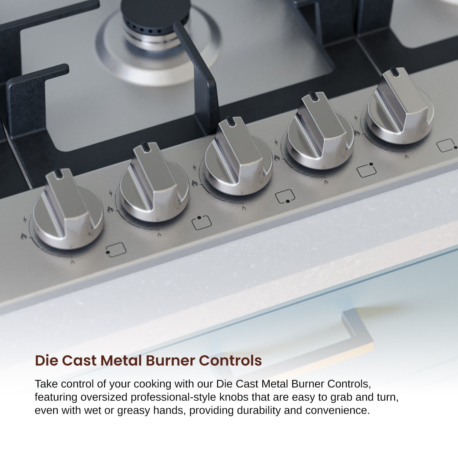Take control of your cooking with our Die Cast Metal Burner Controls, featuring oversized professional-style knobs that are easy to grab and turn, even with wet or greasy hands, providing durability and convenience.