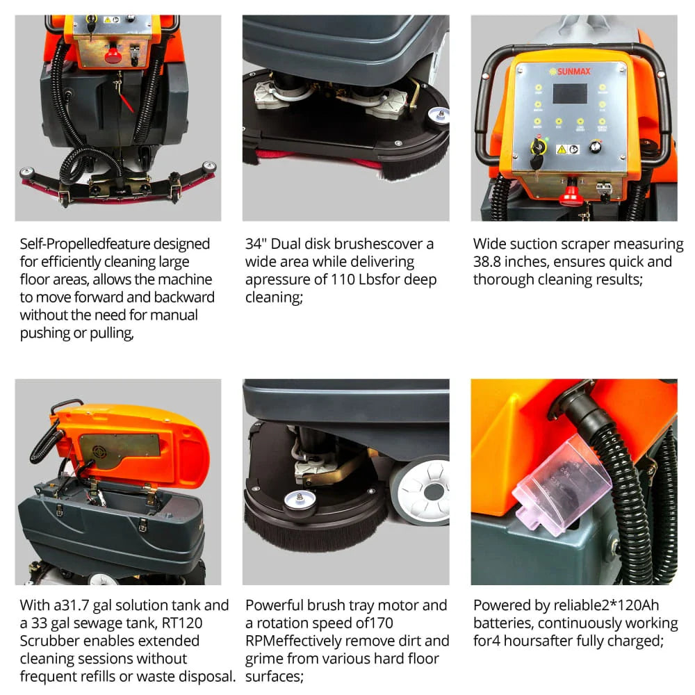 Exceptional Cleaning Efficiency: With a 34" brush cleaning width and a 38.8" squeegee width, the SUNMAX RT120 provides extensive floor coverage, making quick work of large areas. Its high working efficiency of 75,000 sqft/h ensures that no corner is left uncleaned.