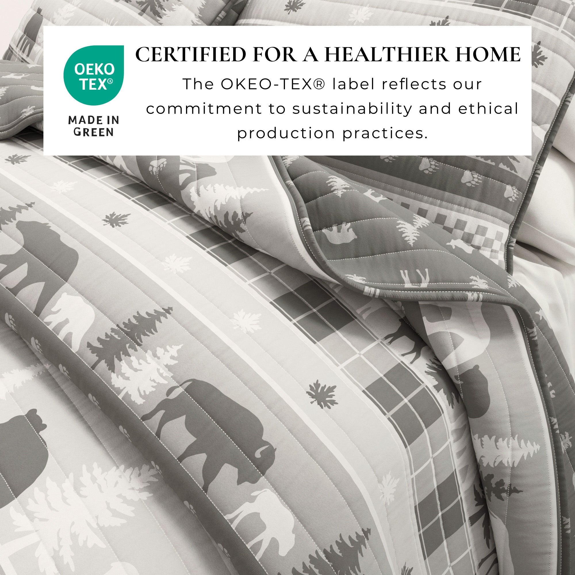 This charming lodge-themed quilt set adds a touch of the great outdoors to your bedroom. Featuring detailed prints of trees and woodland animals paired with complementary plaids, this reversible quilt set brings a rustic and cozy feel to any space. Crafted with attention to durability and an ease of machine-washability, this quilt set is perfect for families, guests, kids, and pets. Its lightweight warmth and versatile style ensure comfort throughout every season, making it an ideal addition to your home decor. Experience the cozy embrace of nature right in your bedroom.