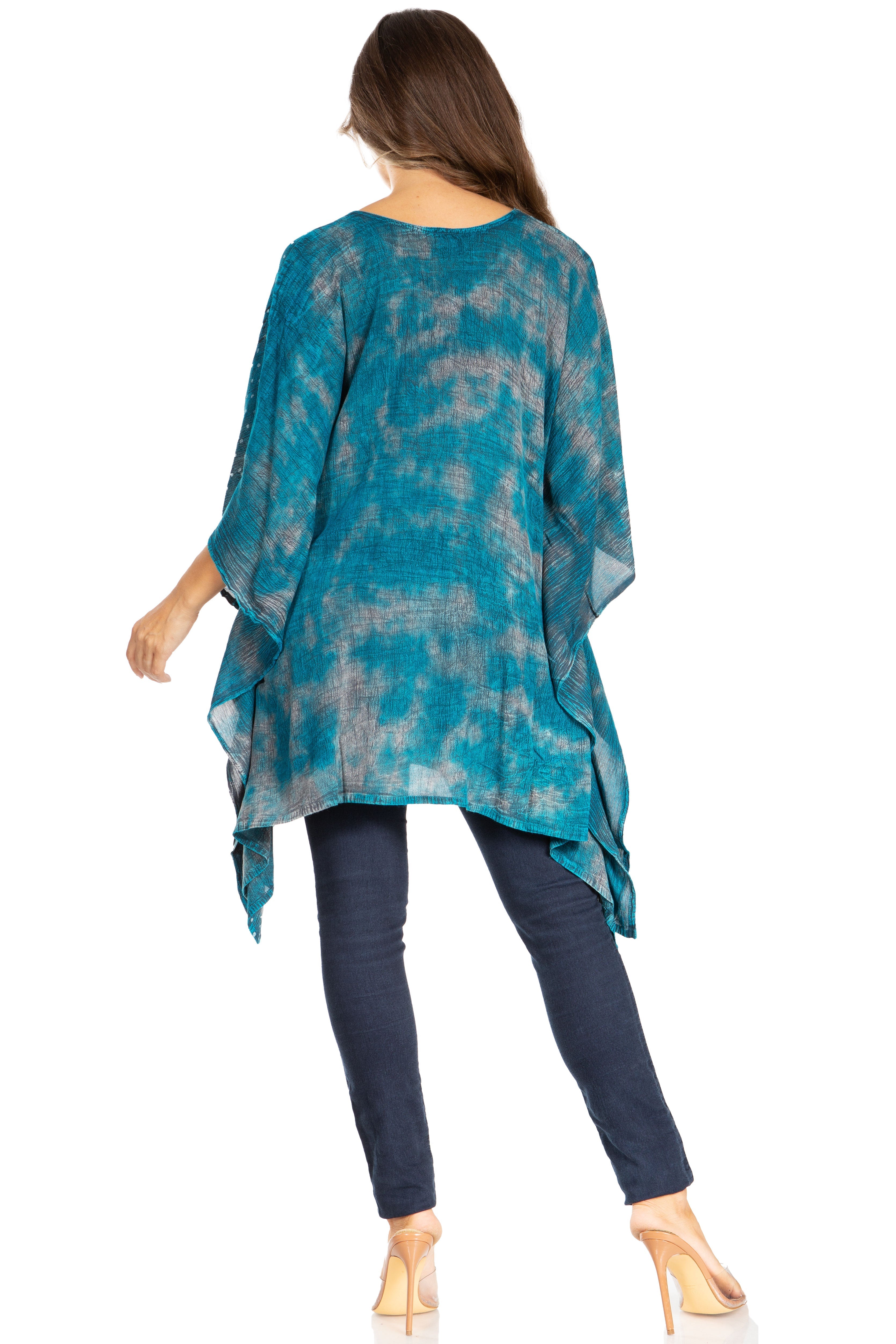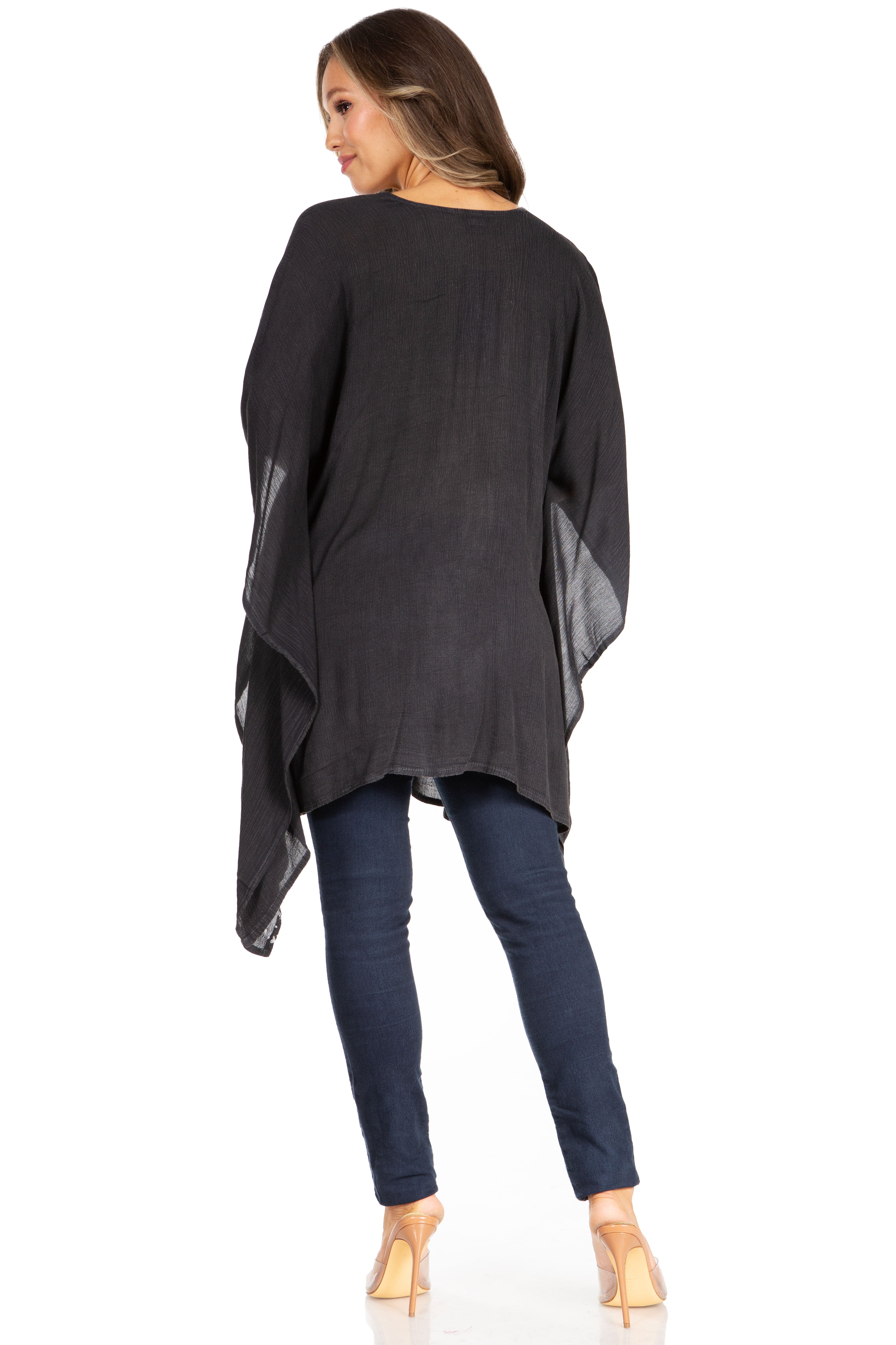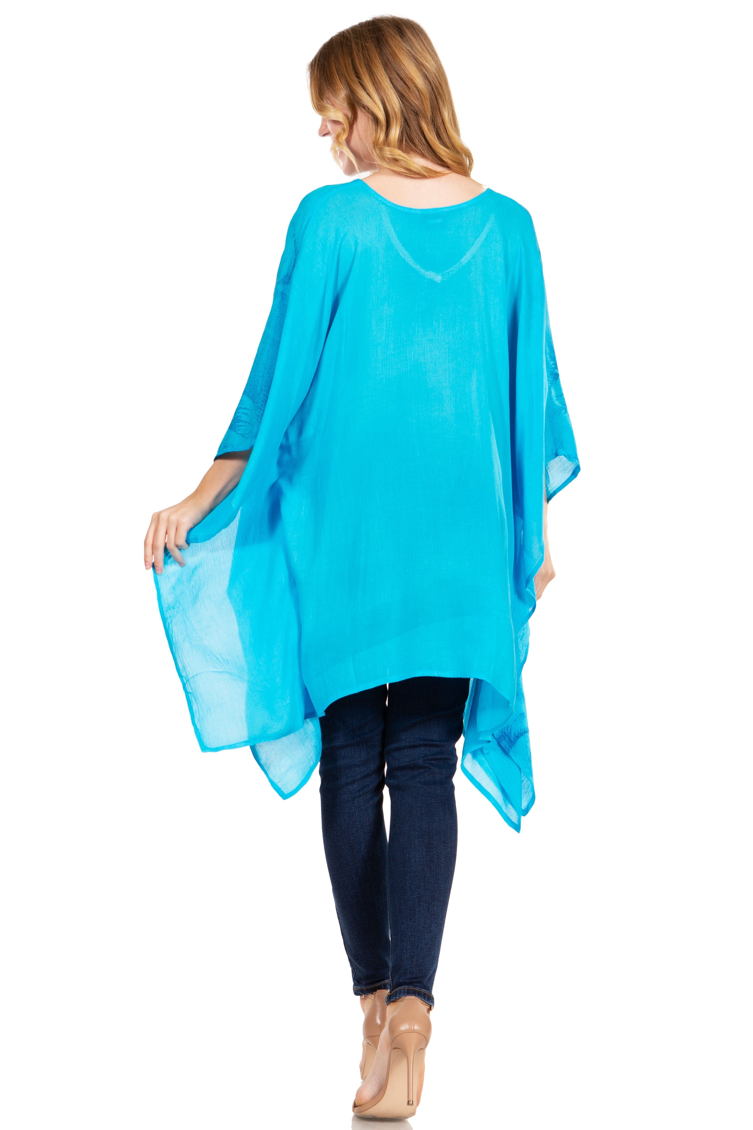 • Feminine Relax Fit: This poncho is handmade and hand dyed, made of soft and lightweight rayon fabric. The embroidery detailing runs along neckline, and bottom hem. Poncho cut is a classic cut, with V-neck a wide and comfortable arm opening that is not restricted. Crinkle with stonewashed finish. Tunic length with lots of fullness and flare at bottom. It can fit any body type from slim to plus sizes and will look great on every body types.
