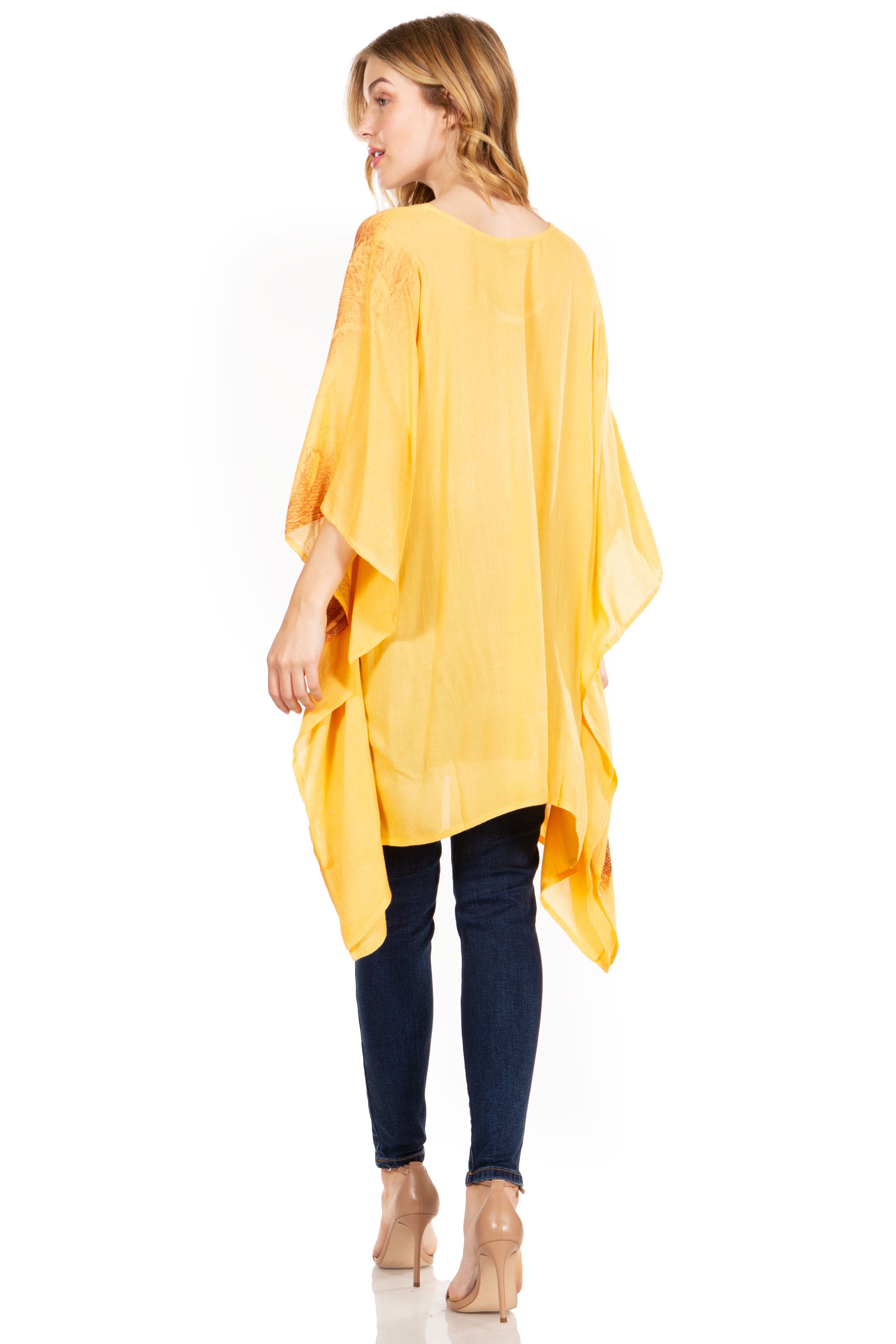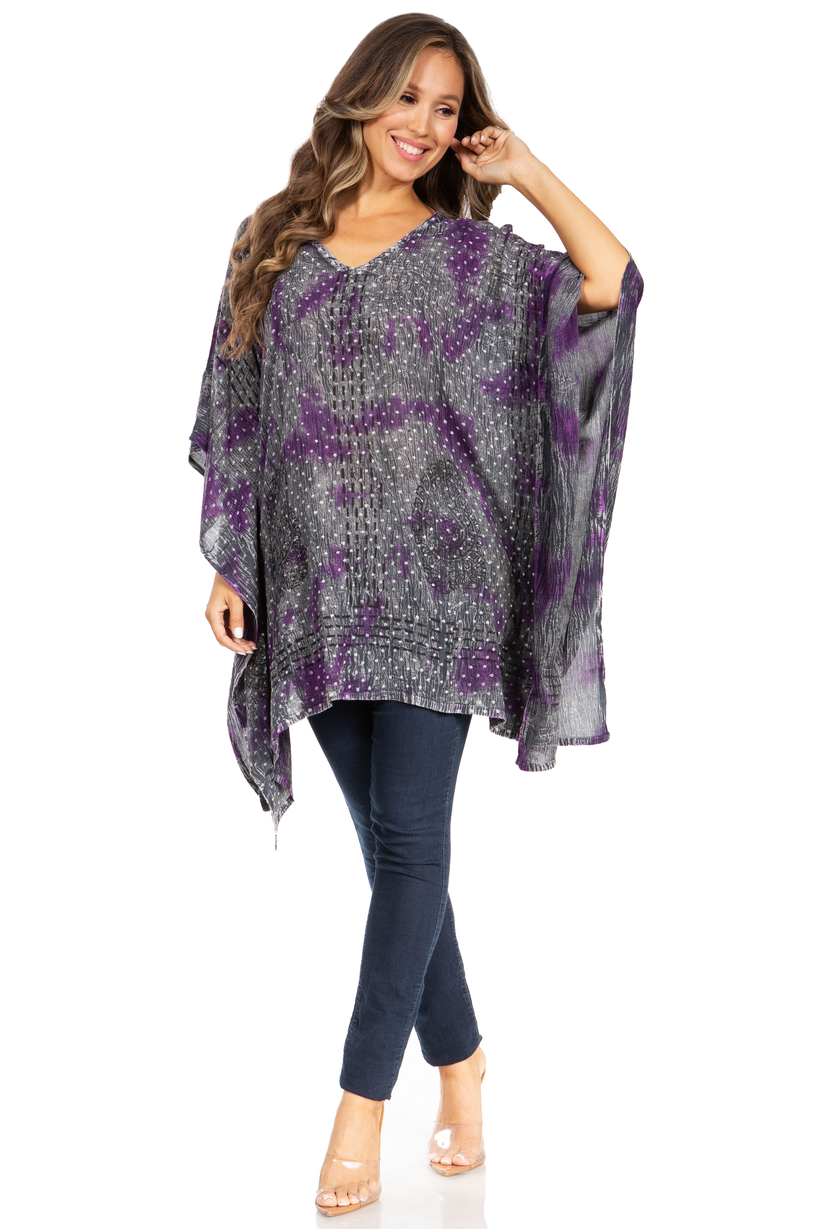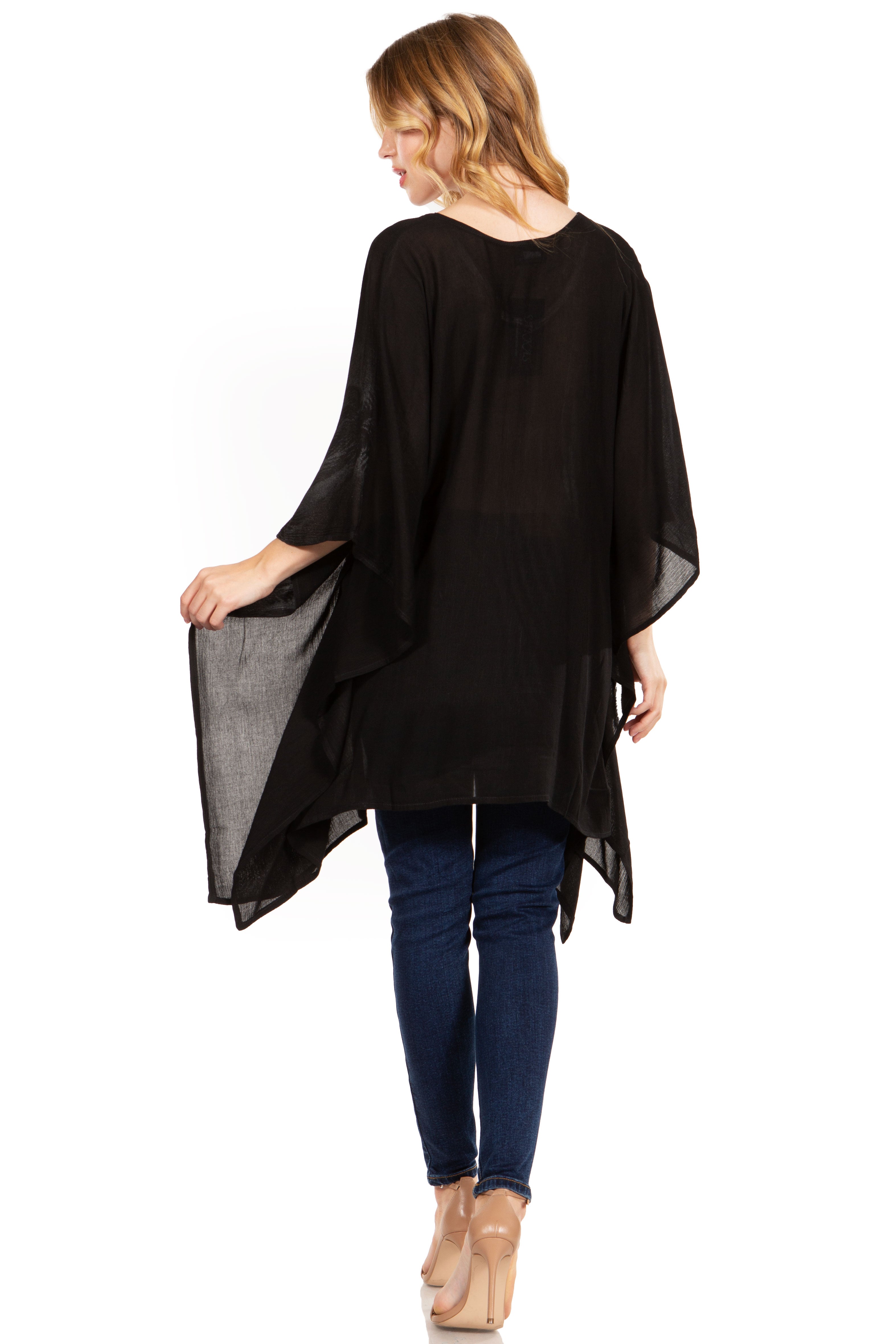 • Feminine Relax Fit: This poncho is handmade and hand dyed, made of soft and lightweight rayon fabric. The embroidery detailing runs along neckline, and bottom hem. Poncho cut is a classic cut, with V-neck a wide and comfortable arm opening that is not restricted. Crinkle with stonewashed finish. Tunic length with lots of fullness and flare at bottom. It can fit any body type from slim to plus sizes and will look great on every body types.