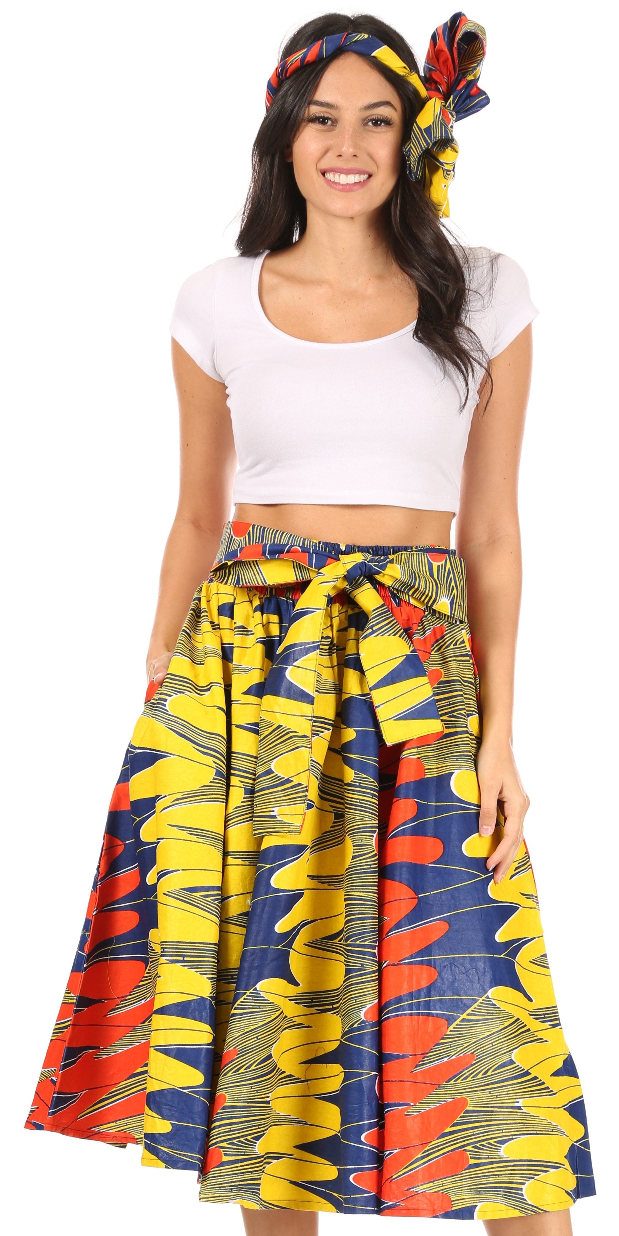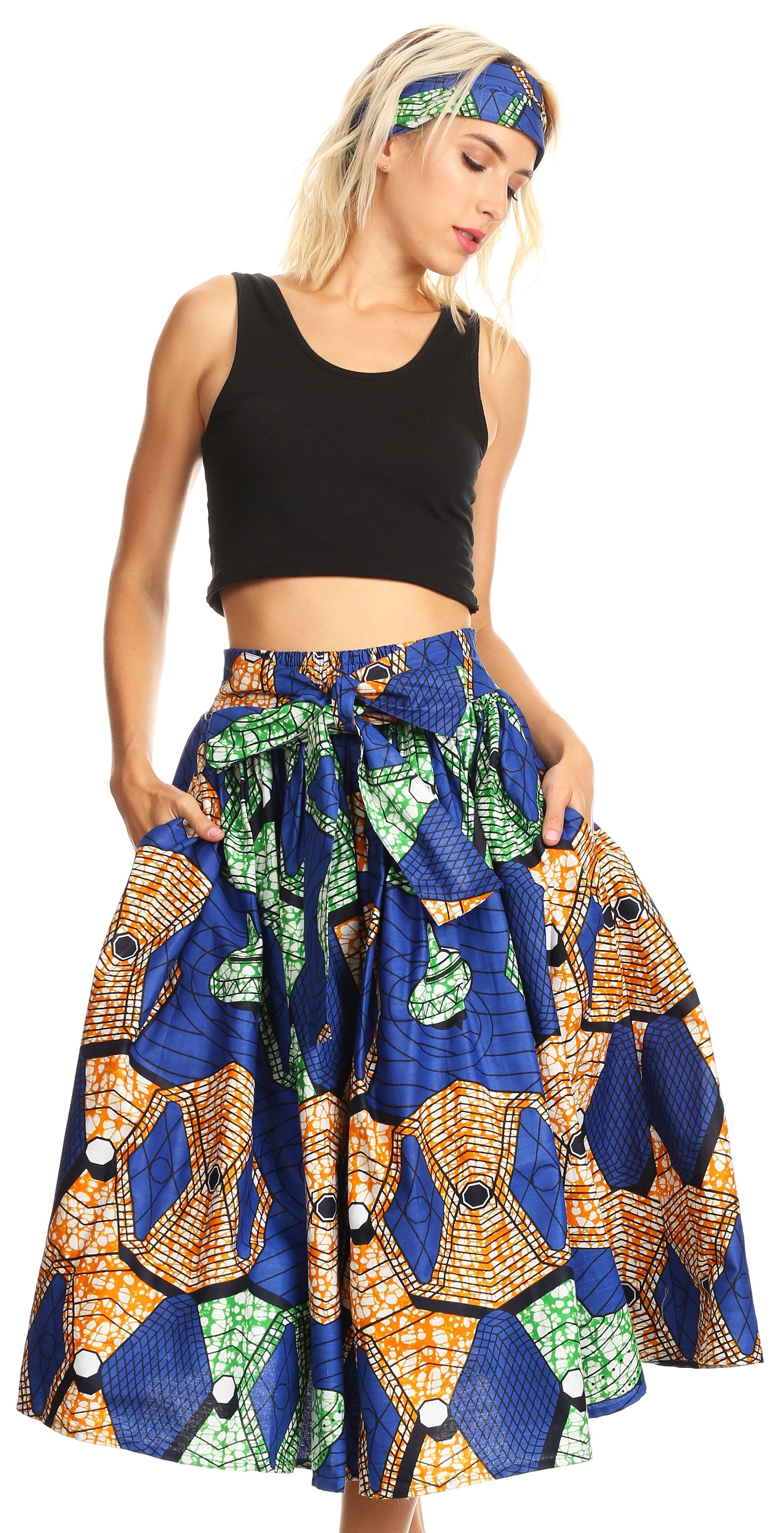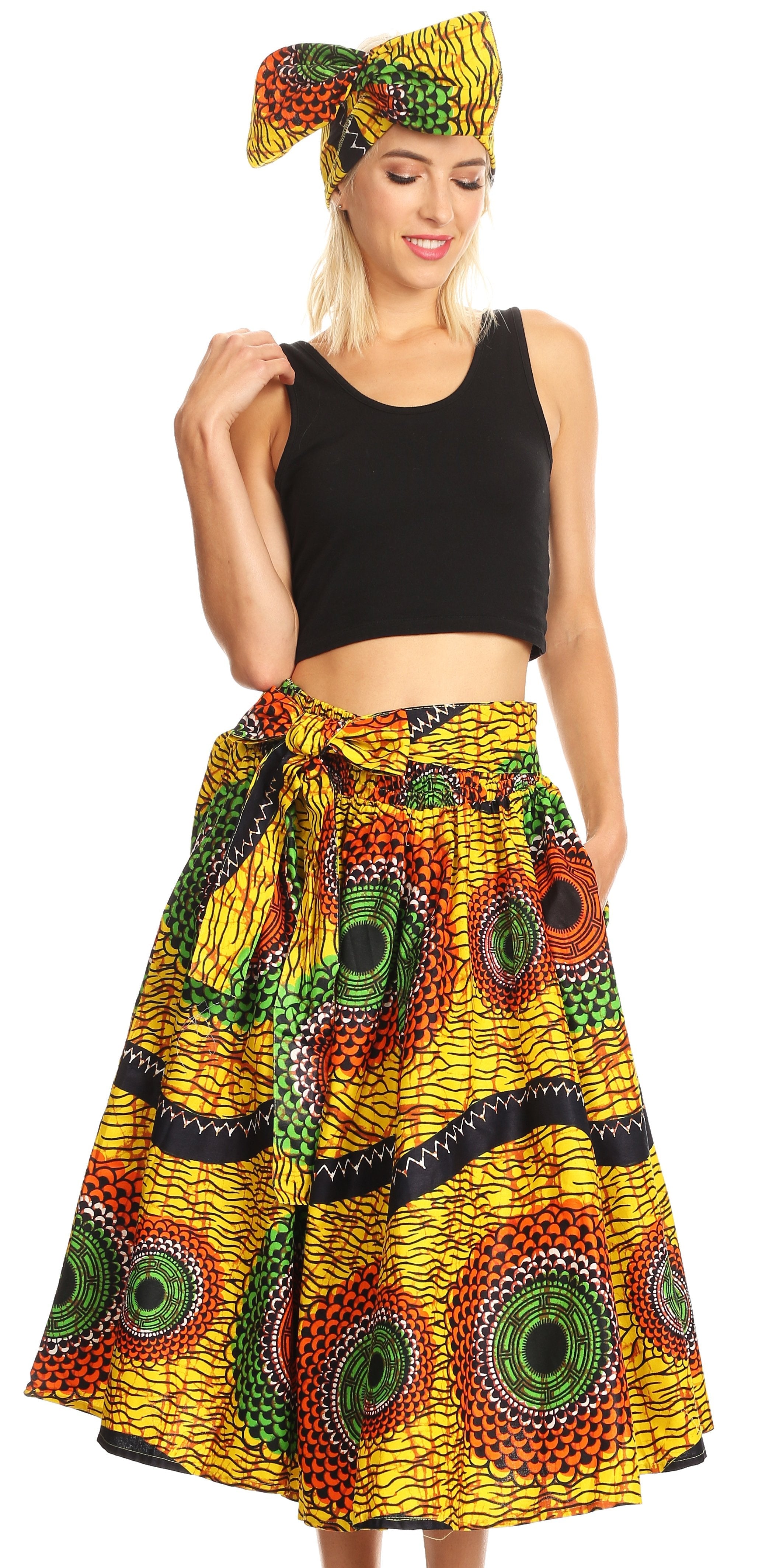 • Lovely African Dutch Ankara wax printed cotton skirt. Full circle with wide elastic band and wide self-ties. Gorgeous print, perfect calf length. This skirt has inseam side pockets. This skirt comes with a head scarf in the same print.