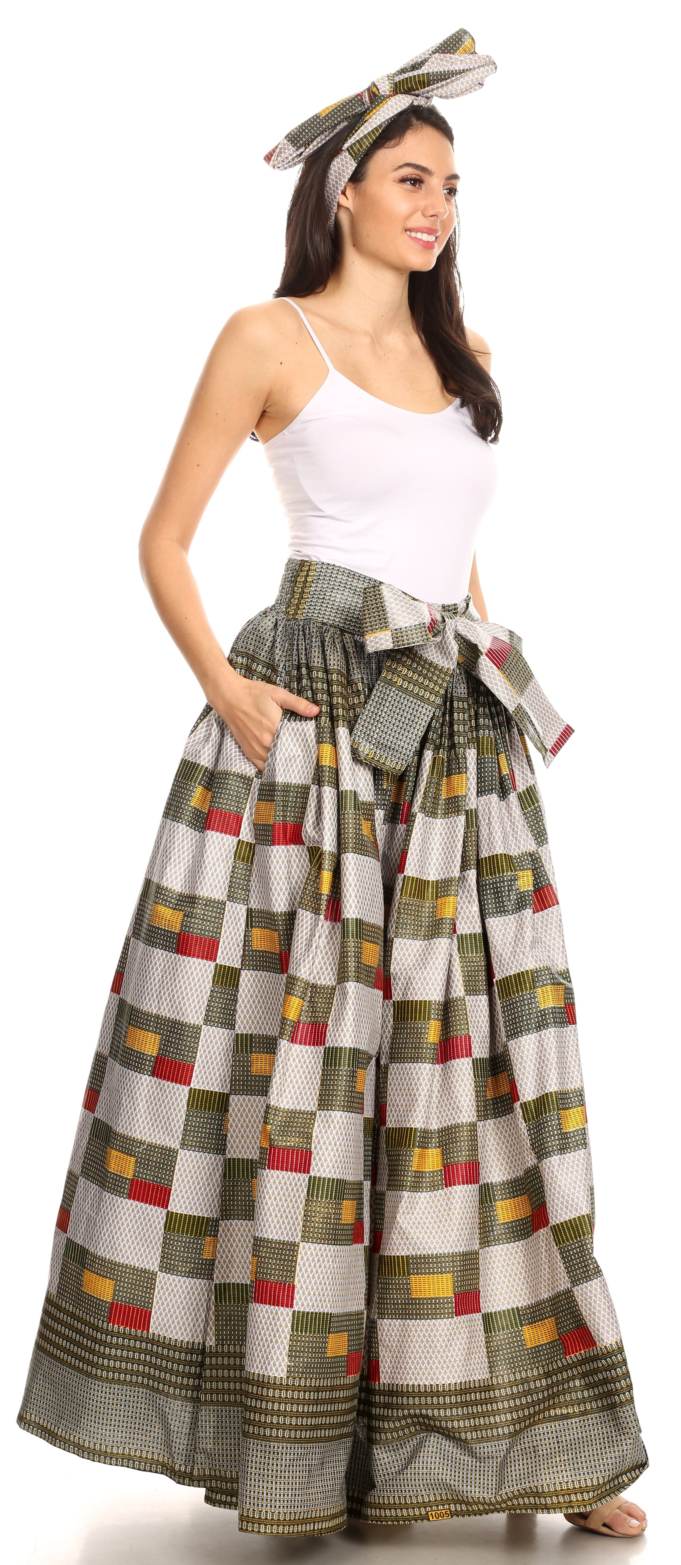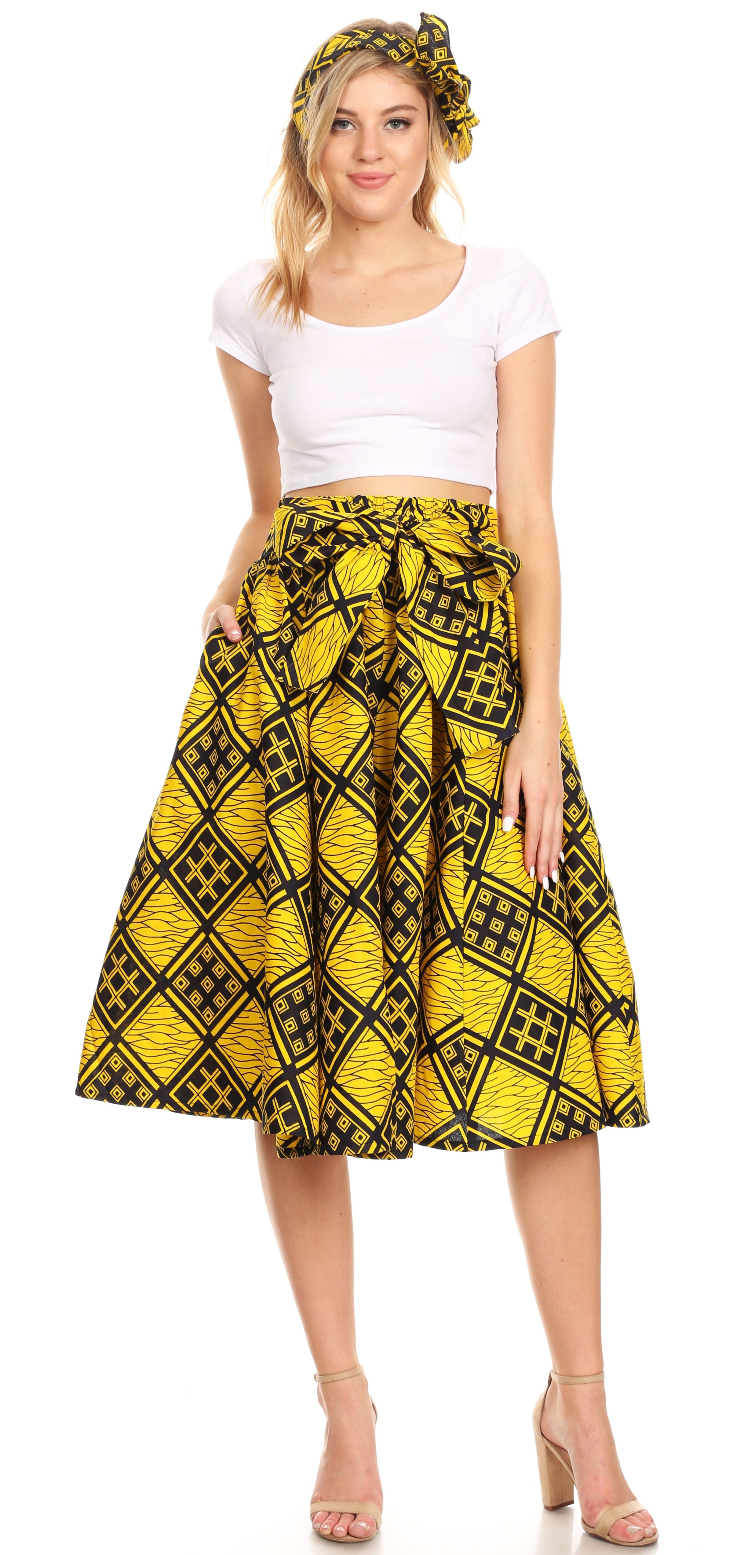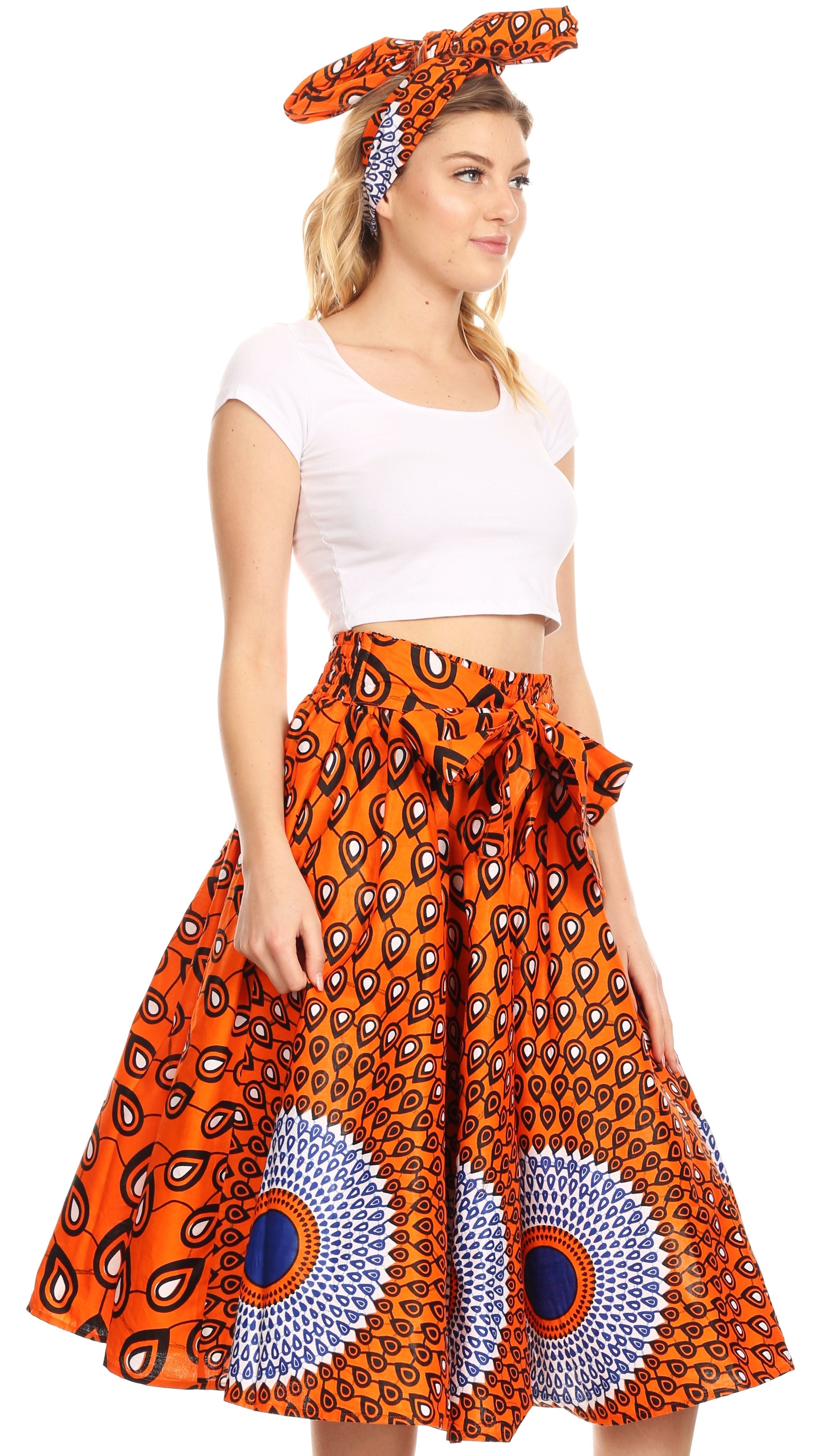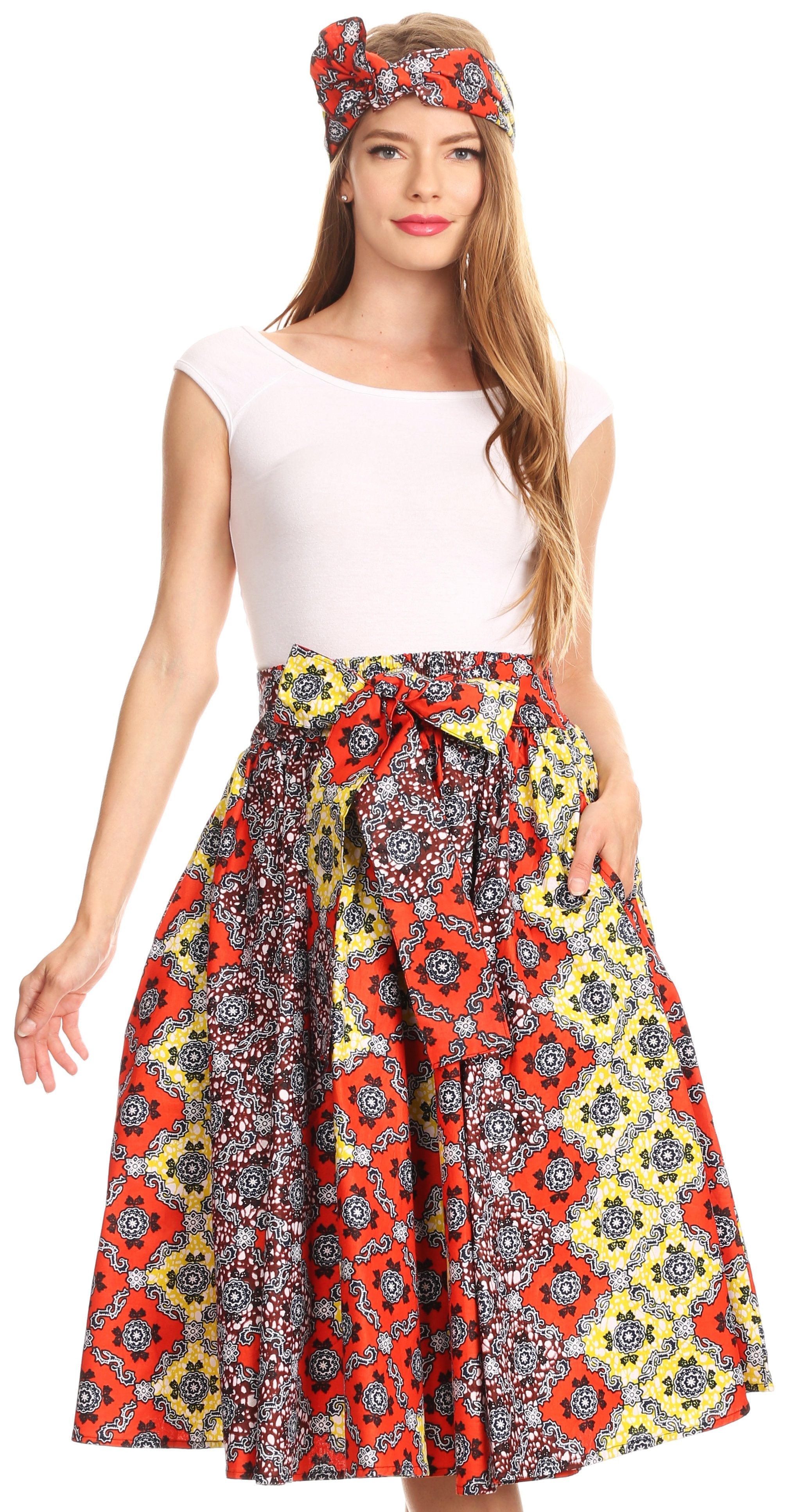 • Lovely African Dutch Ankara wax printed cotton skirt. Full circle with wide elastic band and wide self-ties. Gorgeous print, perfect calf length. This skirt has inseam side pockets. This skirt comes with a head scarf in the same print.