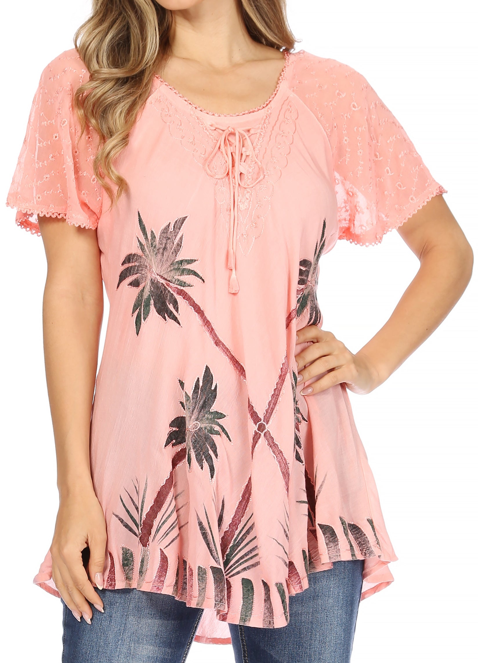 • Blouse features delicate embroidery, cap sleeves, unique palm tree fabric design and relaxed fit.