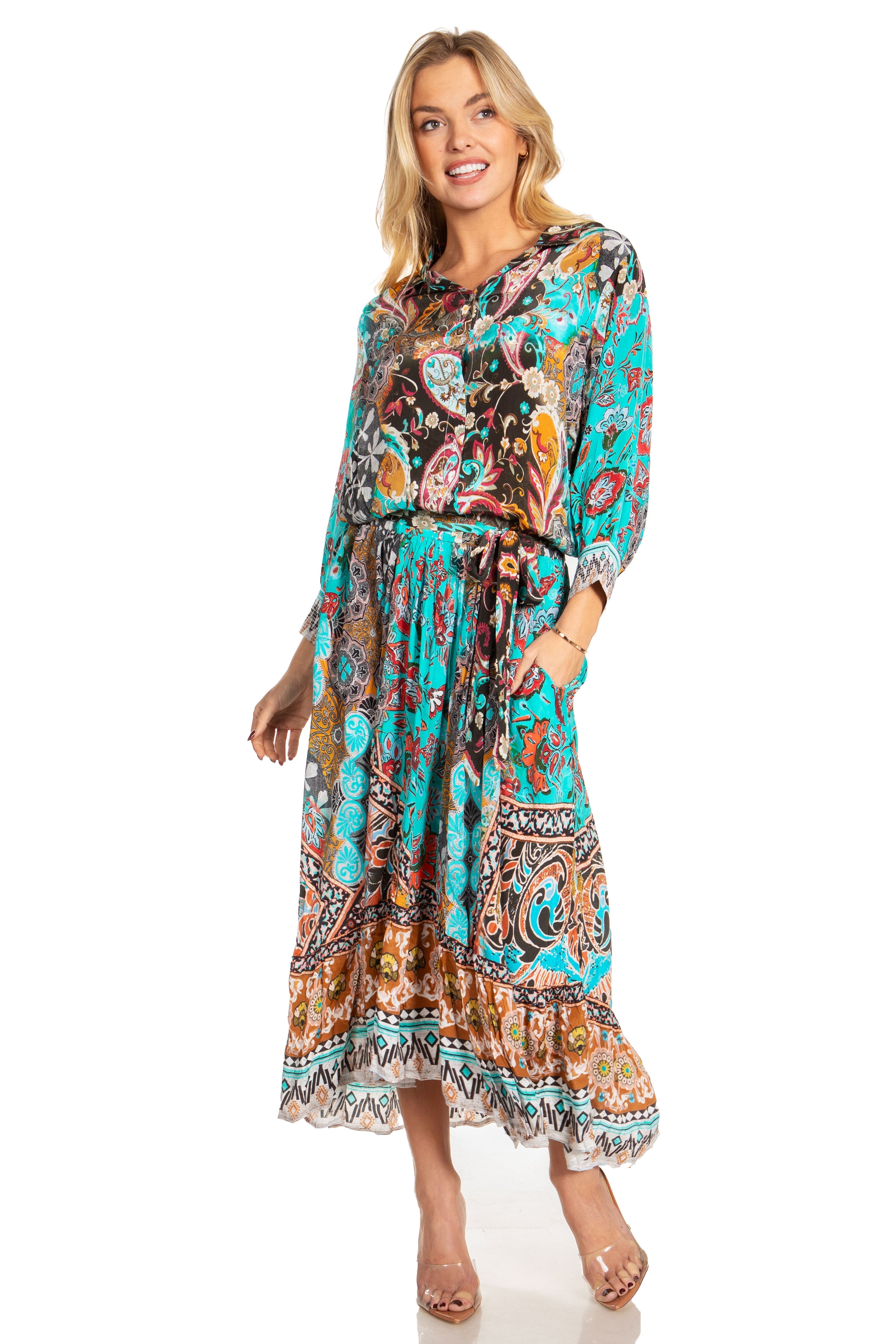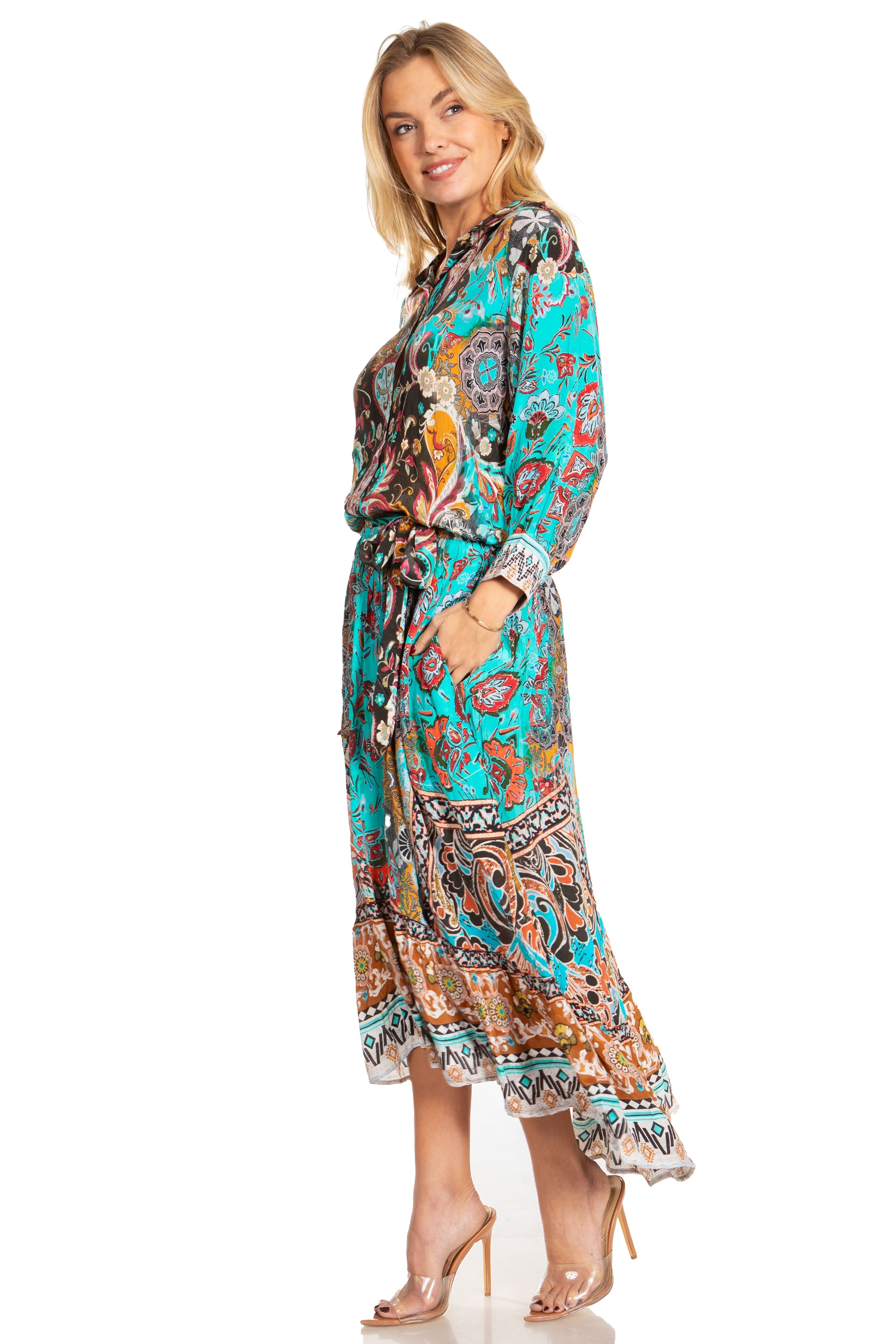 • Shirt Dress/ Maxi/ Caftan/ Event: Andreas, the most amazing boho maxi dress! Comes with a shirt collar, partially buttons down at front, 3/4 sleeves with smock elastic cuffs, elastic waist, side pockets, ruffled flounce bottom, comes with matching belt, pullover style. Made with lightweight silky like material, finished with vibrant print. A truly one of a kind!