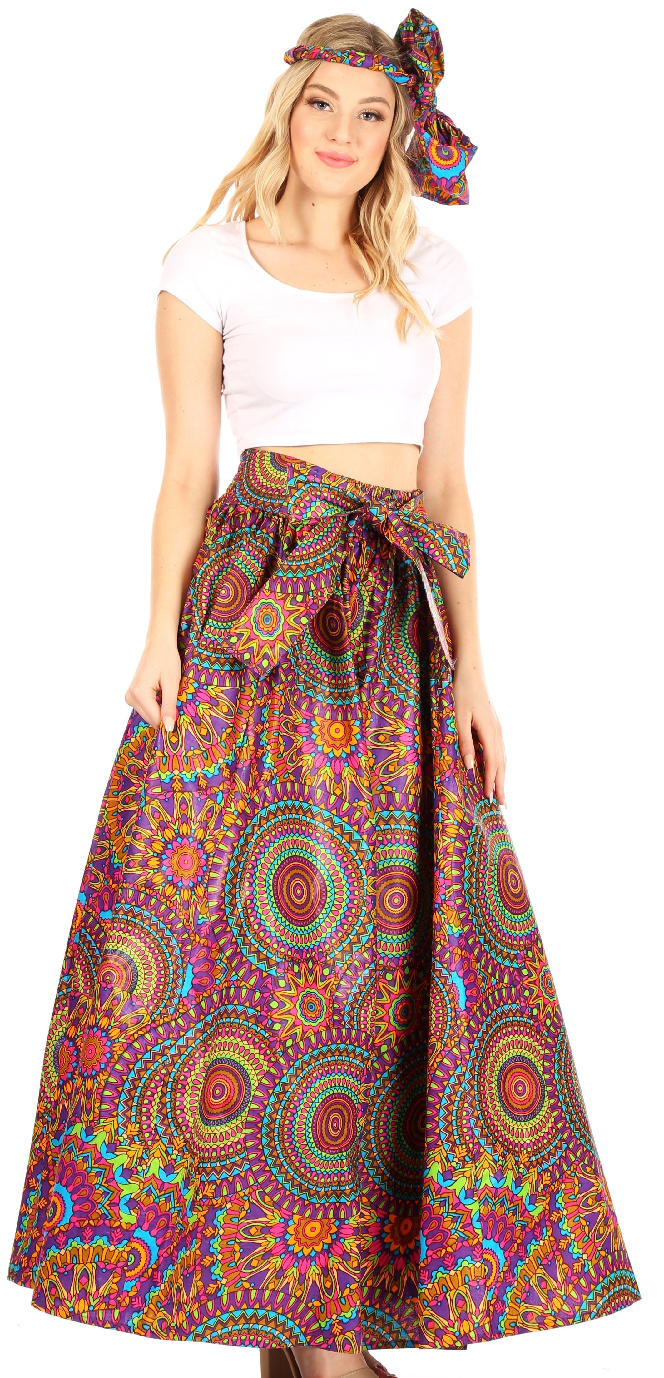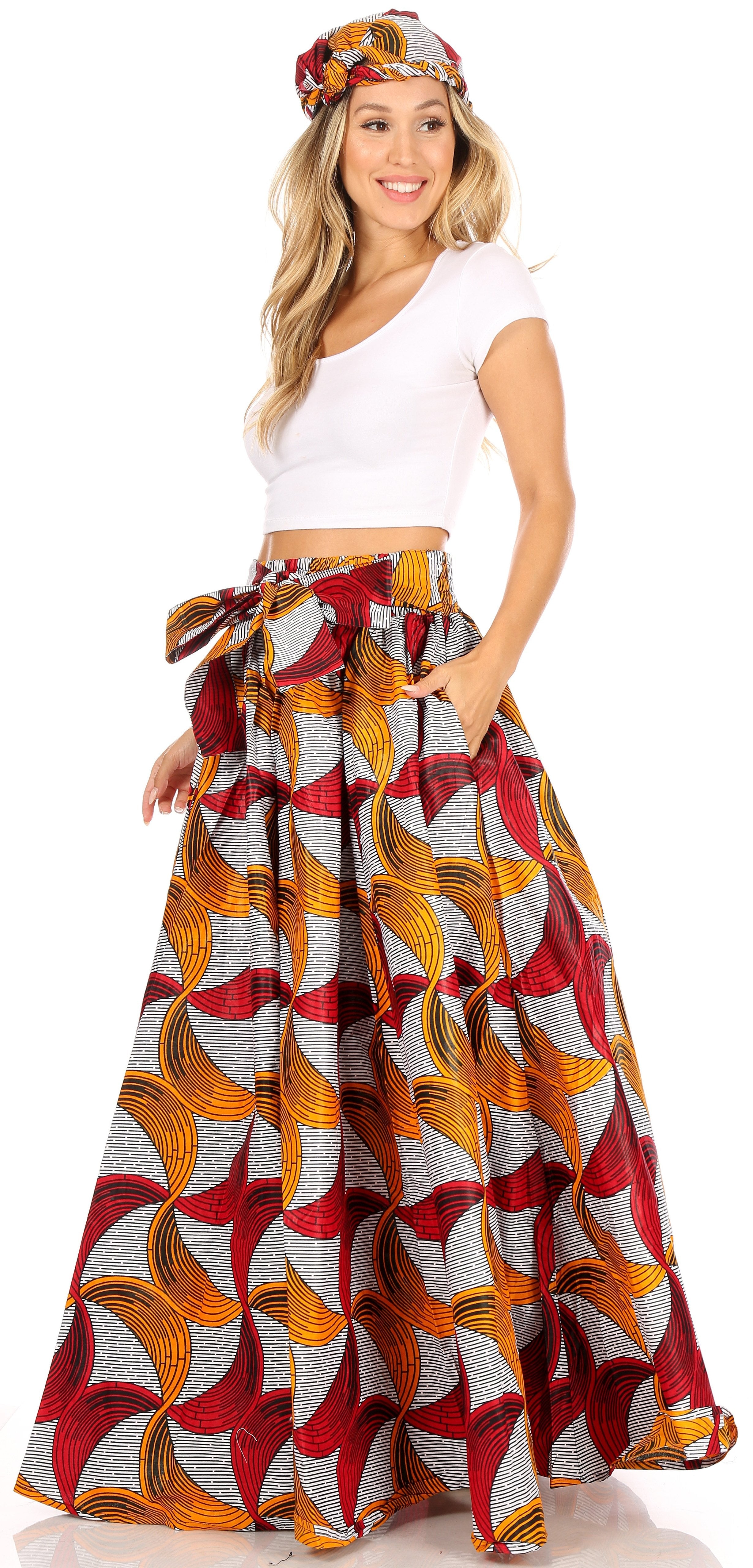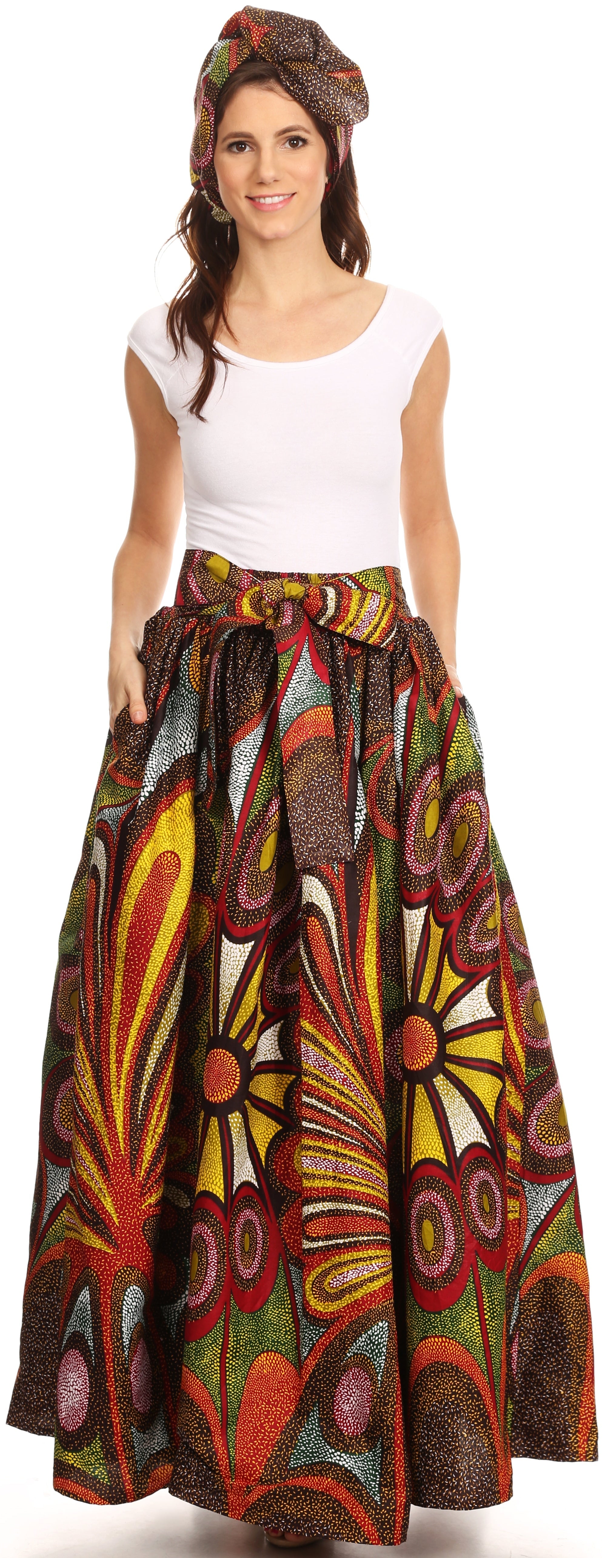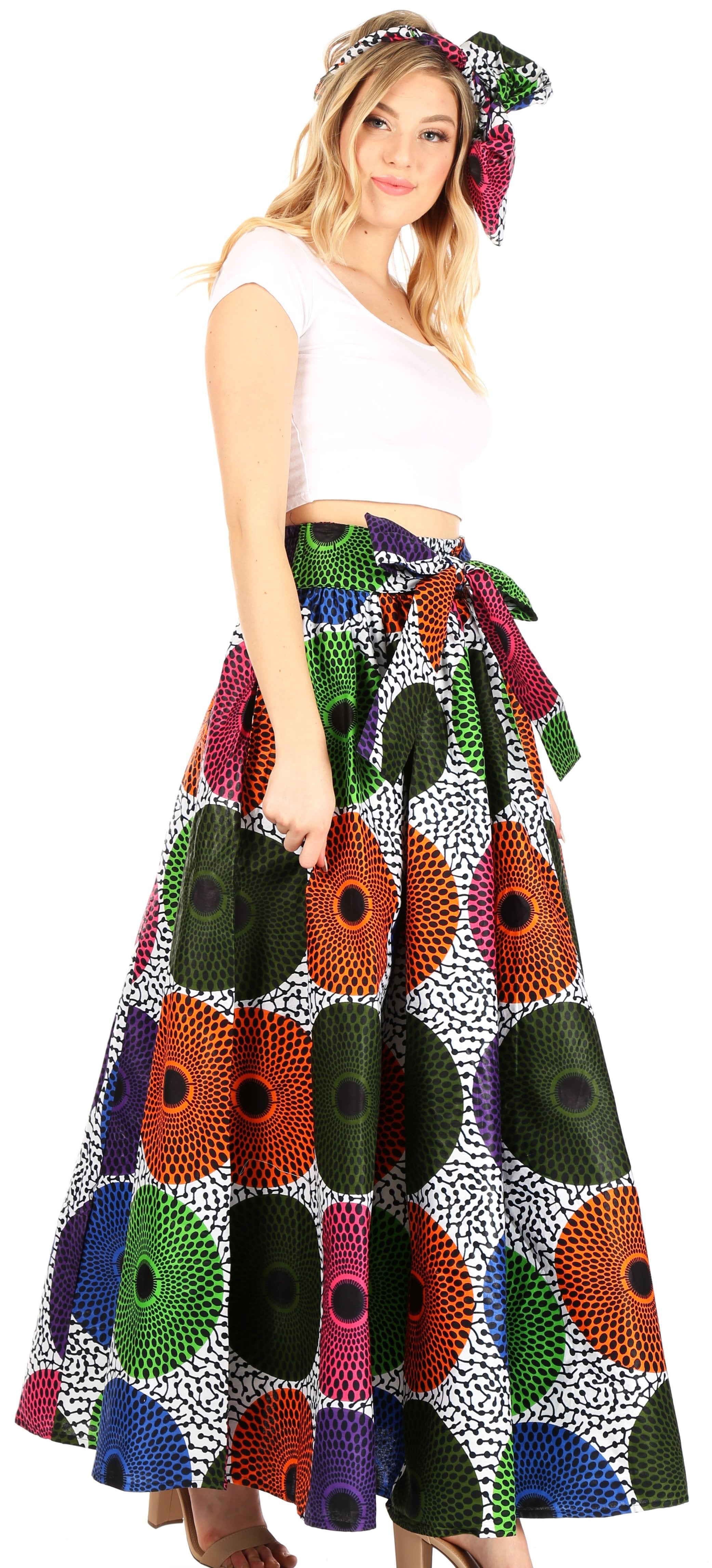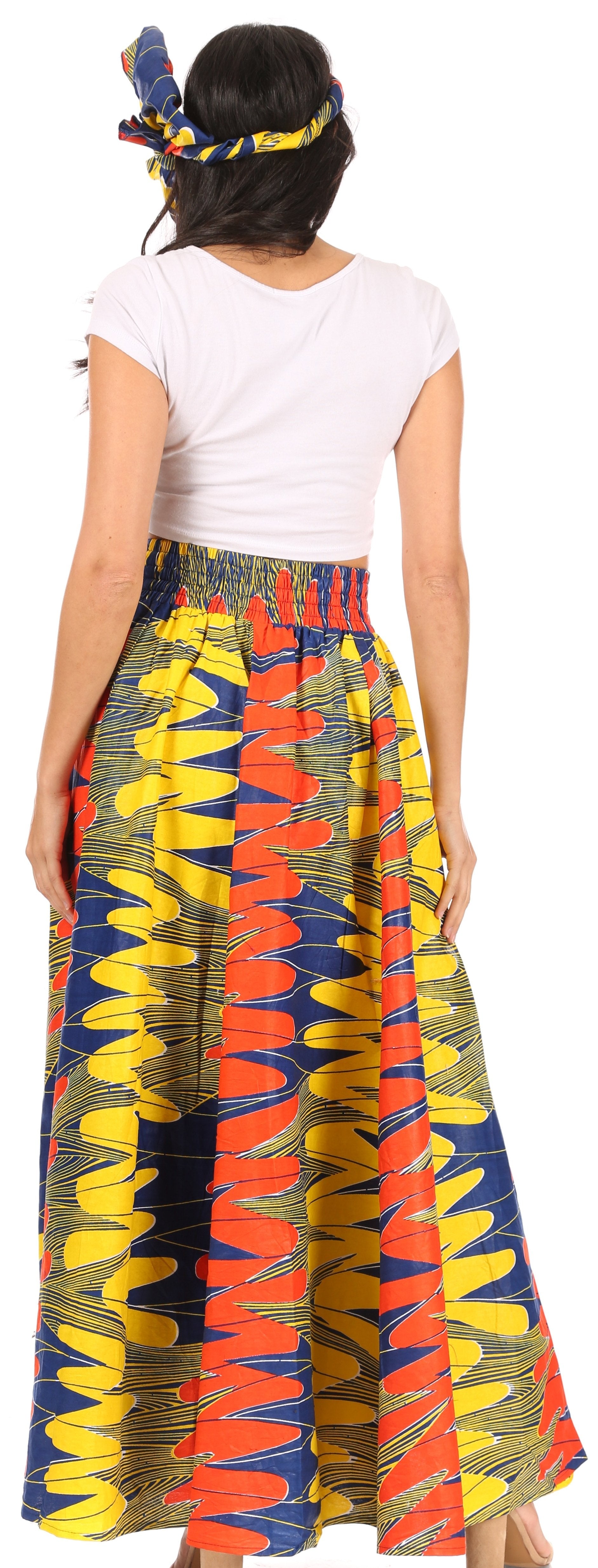 • This skirt features a long and wide flowing beautiful design. It is multi colored with a traditional wax print pattern. This skirt has pockets at the side for a total of two pockets. Pockets are deep and comfortable. A broad elastic waist band and adjustable wrap around strap allows skirt to easily convert into an elegant and carefree dress. This versatile item also features a beautiful head scarf in matching print.