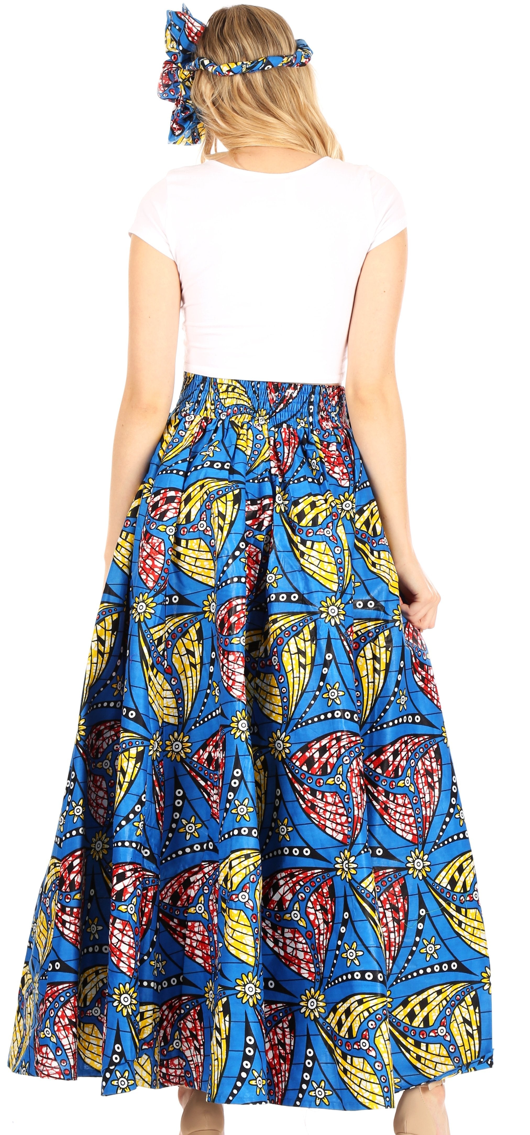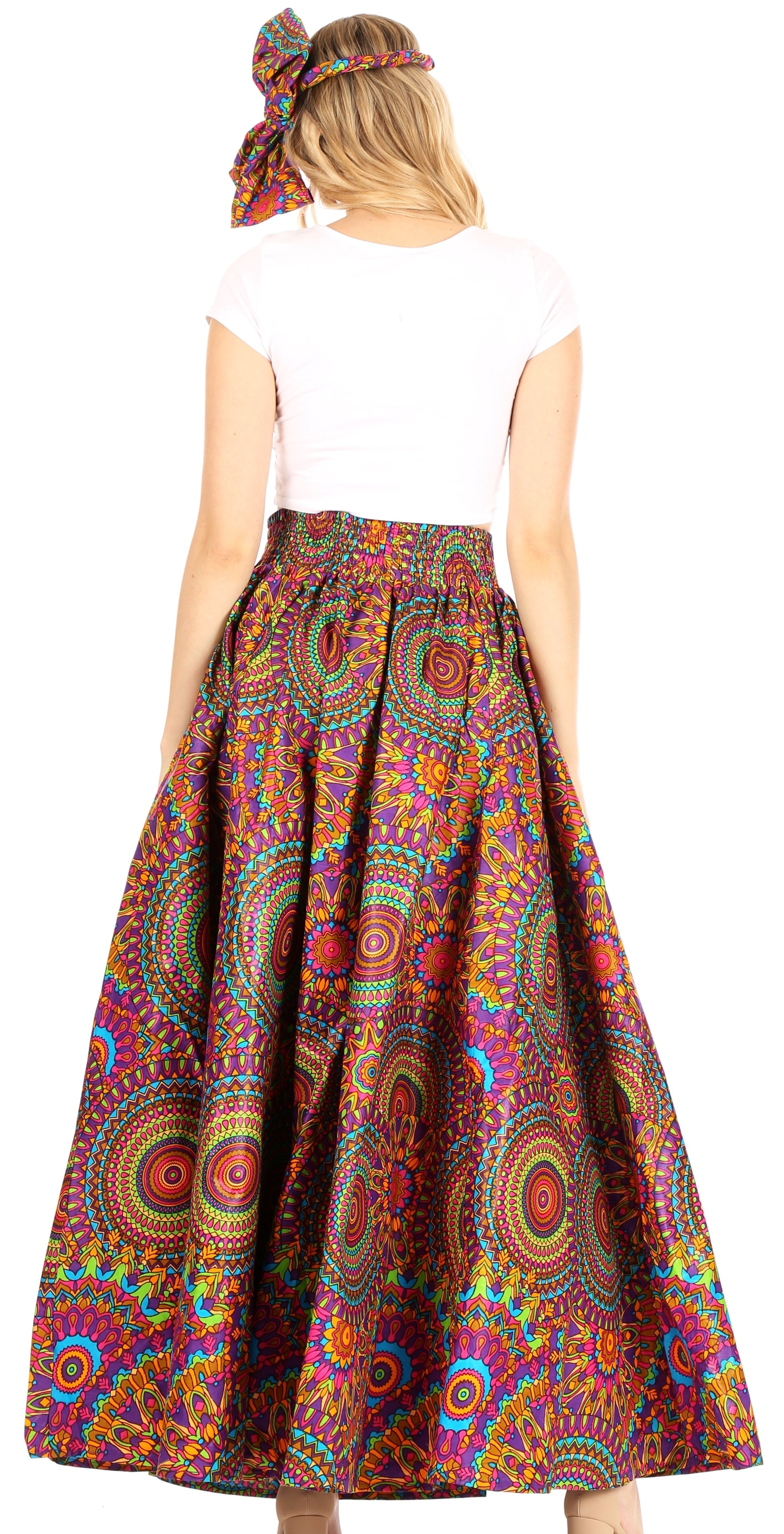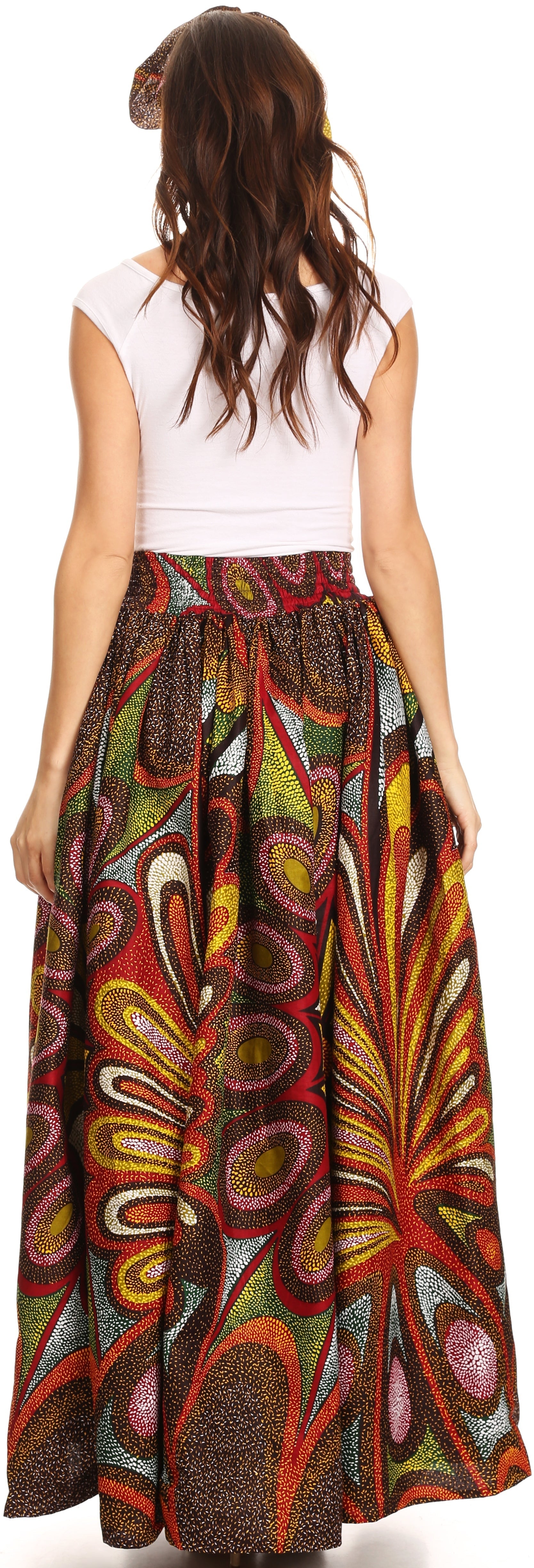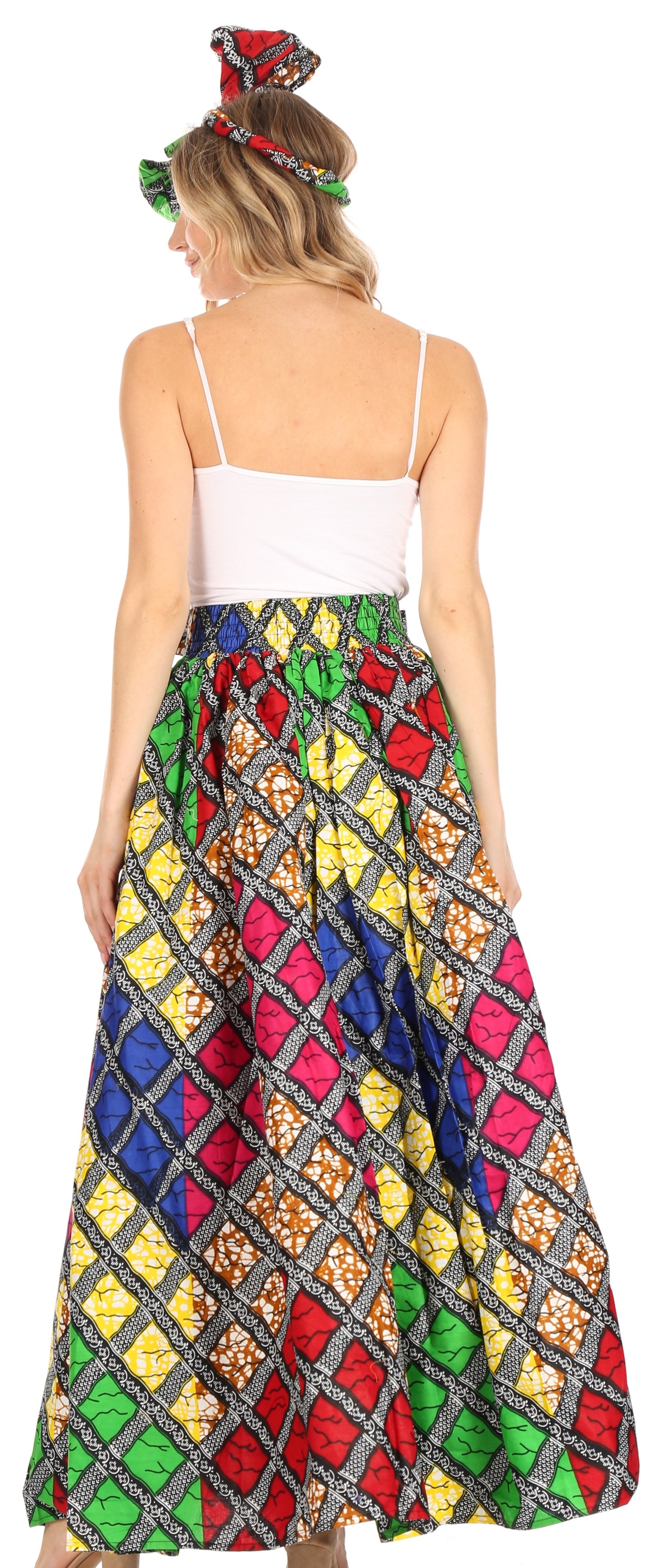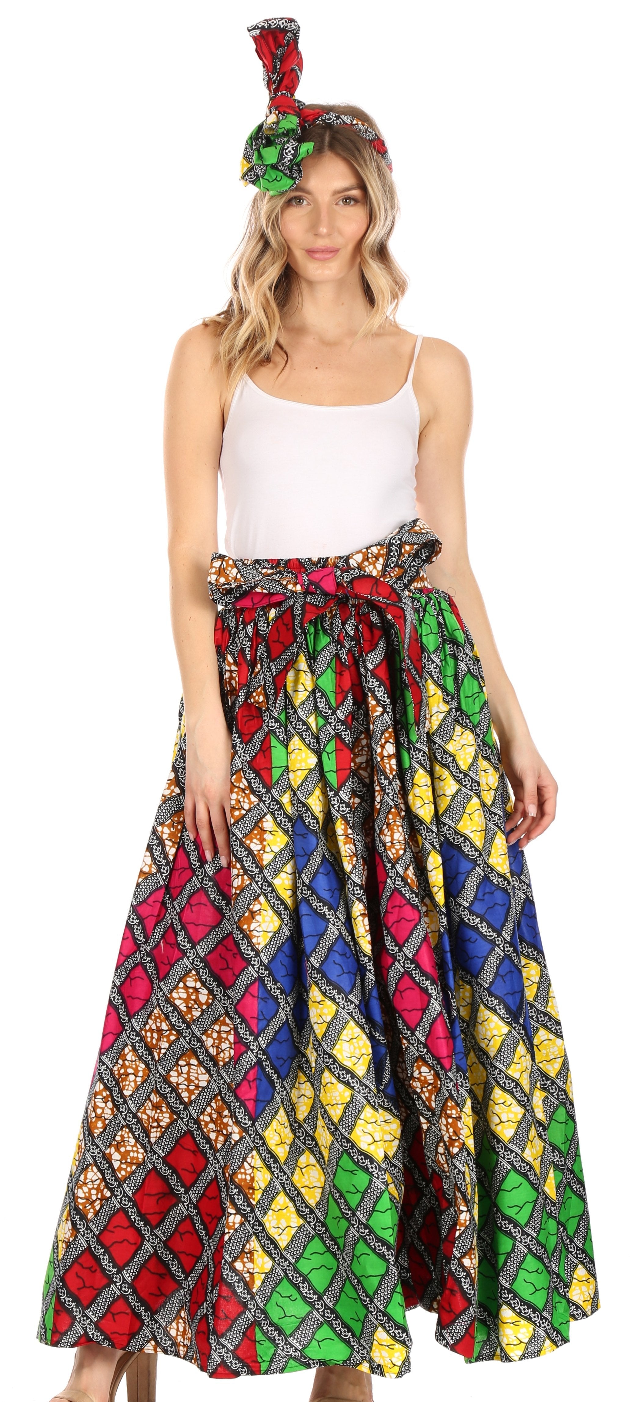 • This skirt features a long and wide flowing beautiful design. It is multi colored with a traditional wax print pattern. This skirt has pockets at the side for a total of two pockets. Pockets are deep and comfortable. A broad elastic waist band and adjustable wrap around strap allows skirt to easily convert into an elegant and carefree dress. This versatile item also features a beautiful head scarf in matching print.