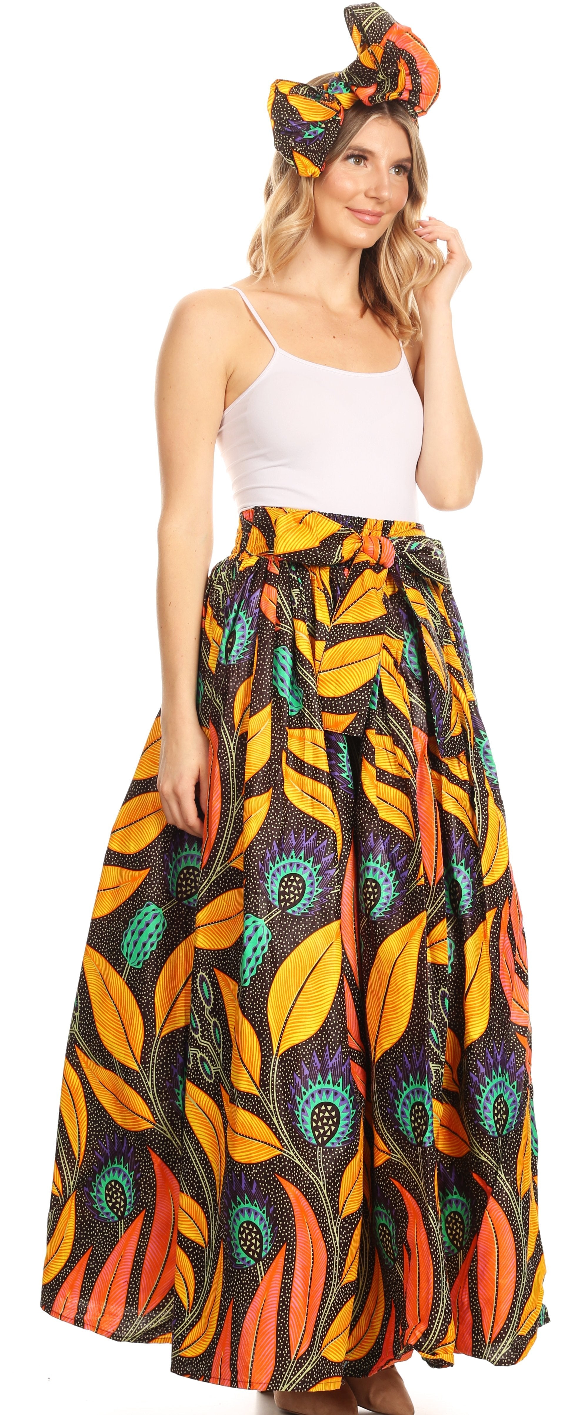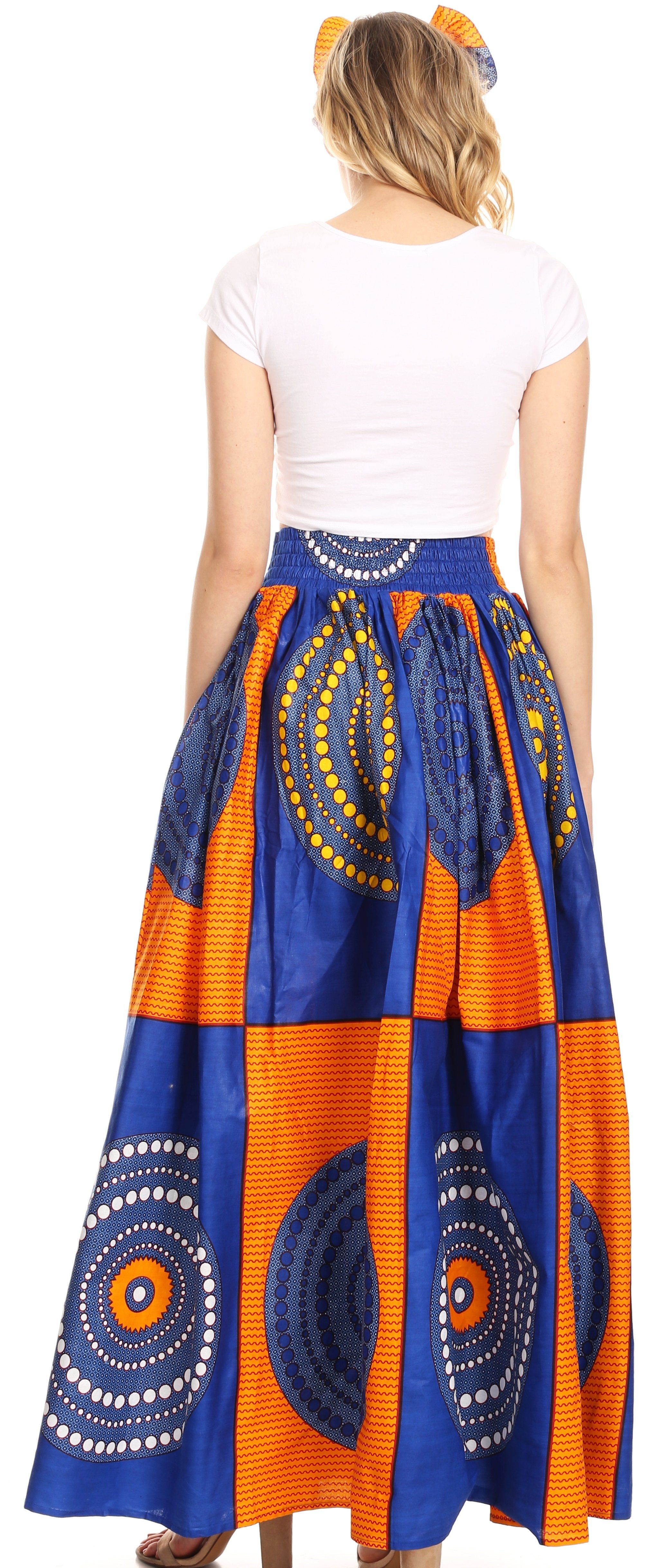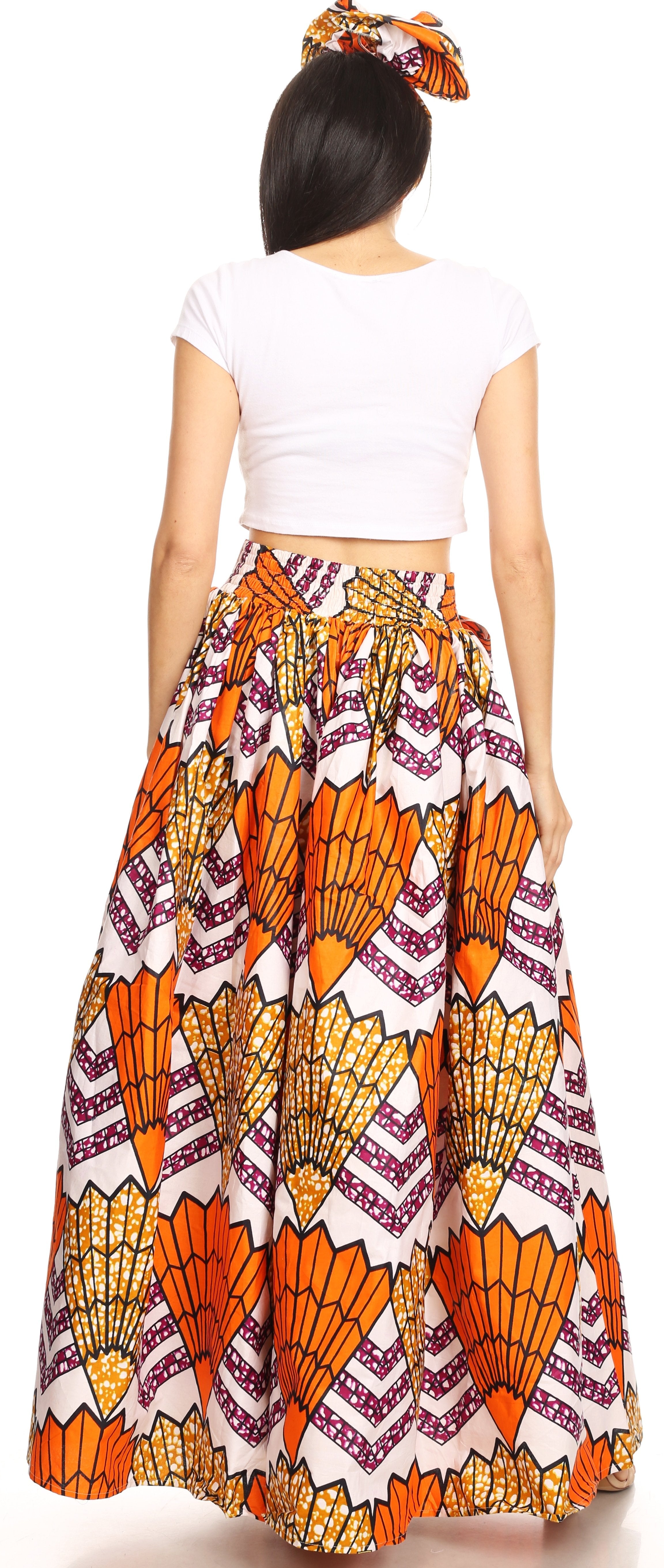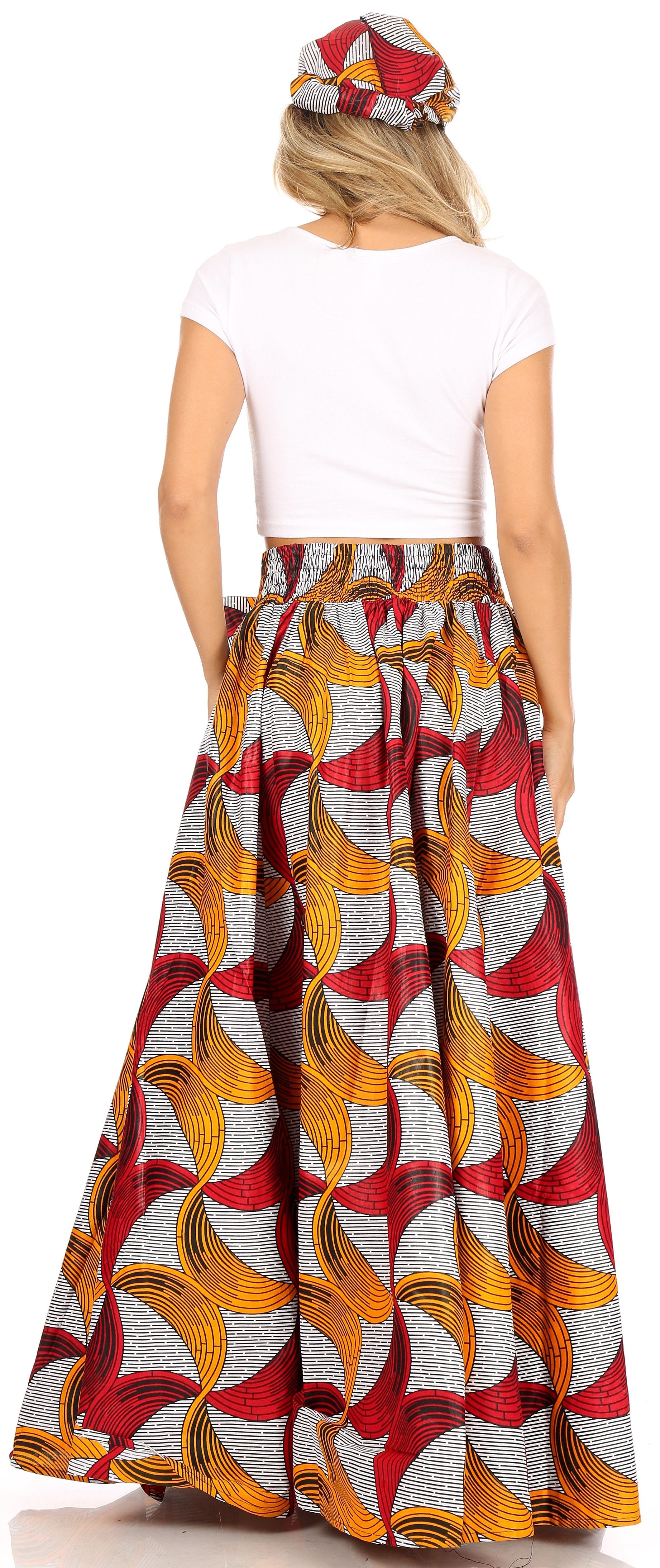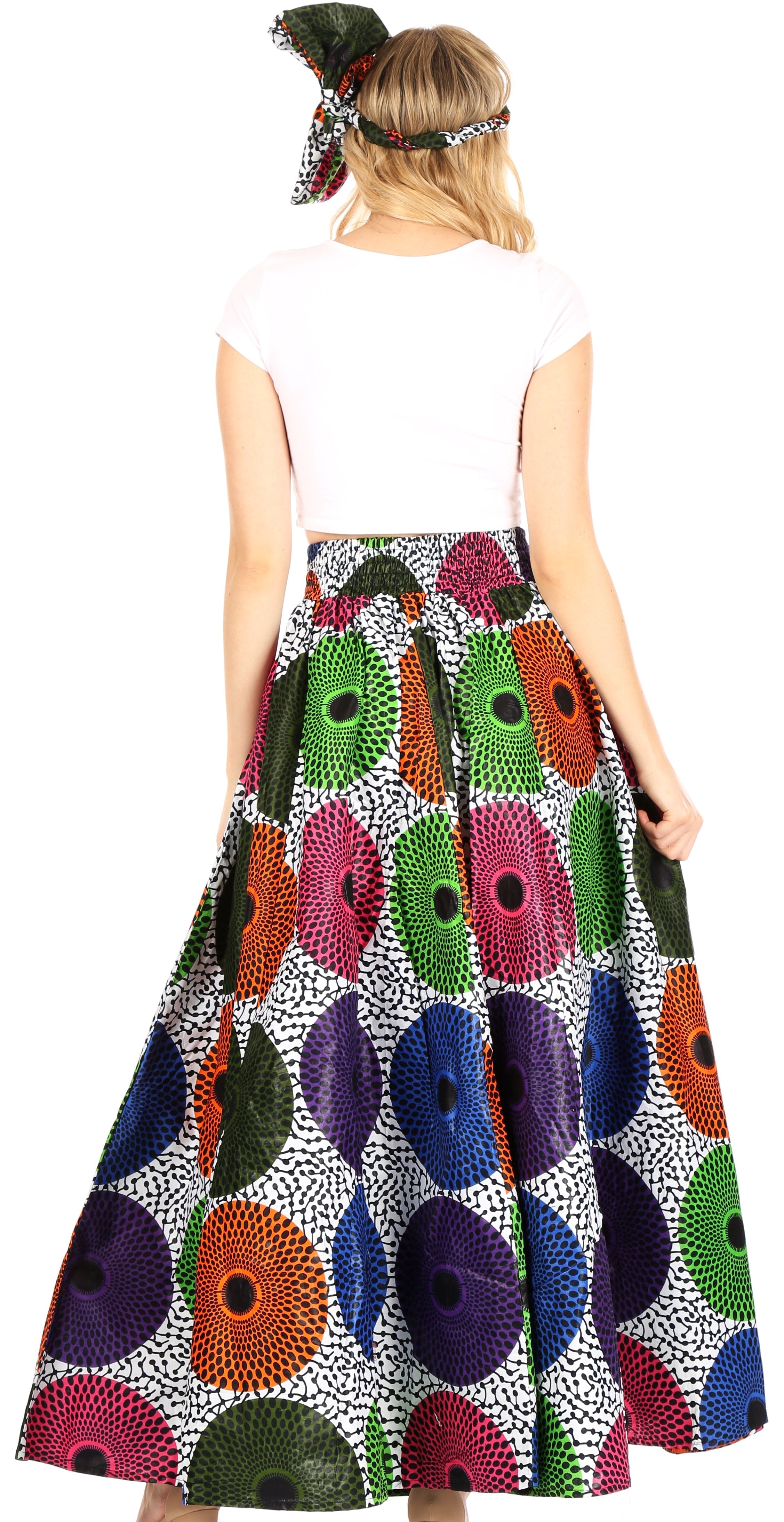 • This skirt features a long and wide flowing beautiful design. It is multi colored with a traditional wax print pattern. This skirt has pockets at the side for a total of two pockets. Pockets are deep and comfortable. A broad elastic waist band and adjustable wrap around strap allows skirt to easily convert into an elegant and carefree dress. This versatile item also features a beautiful head scarf in matching print.